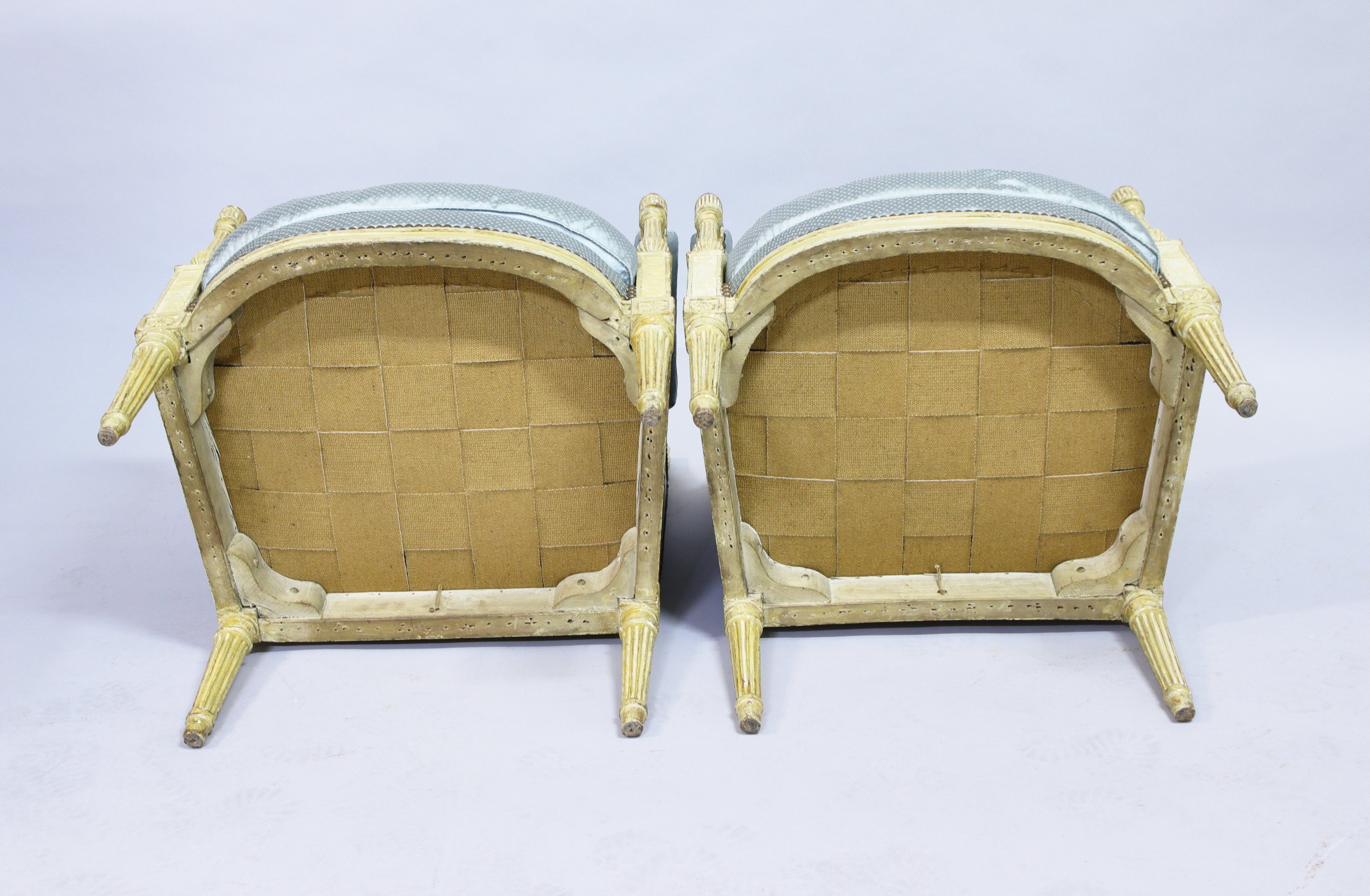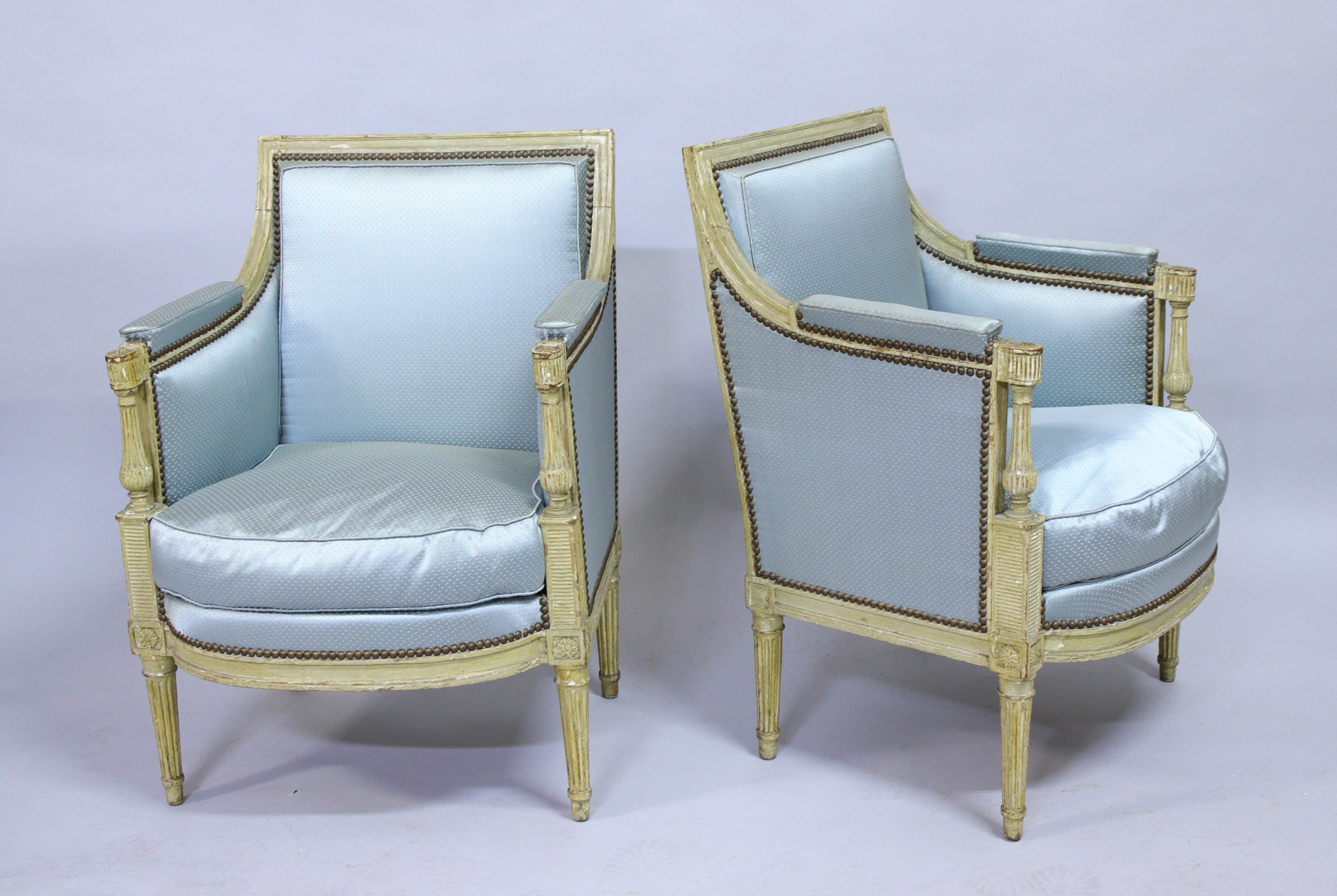 en hêtre laqué, mouluré et sculpté à dossier rectangulaire. Les accotoirs à manchettes reposent sur des supports à colonnes balustres détachées surmontés de fleurettes et reposant sur une base circulaire. Les dès de raccordement sont ornés de fleurs épanouies. La ceinture moulurée est légèrement cintrée. Elles reposent sur quatre pieds fuselés et cannelés.