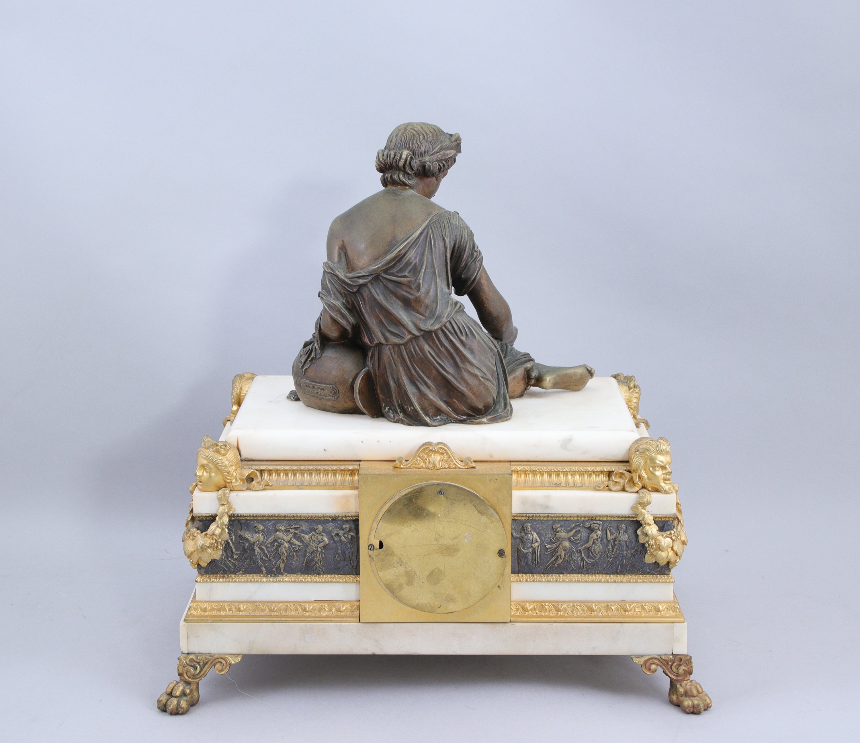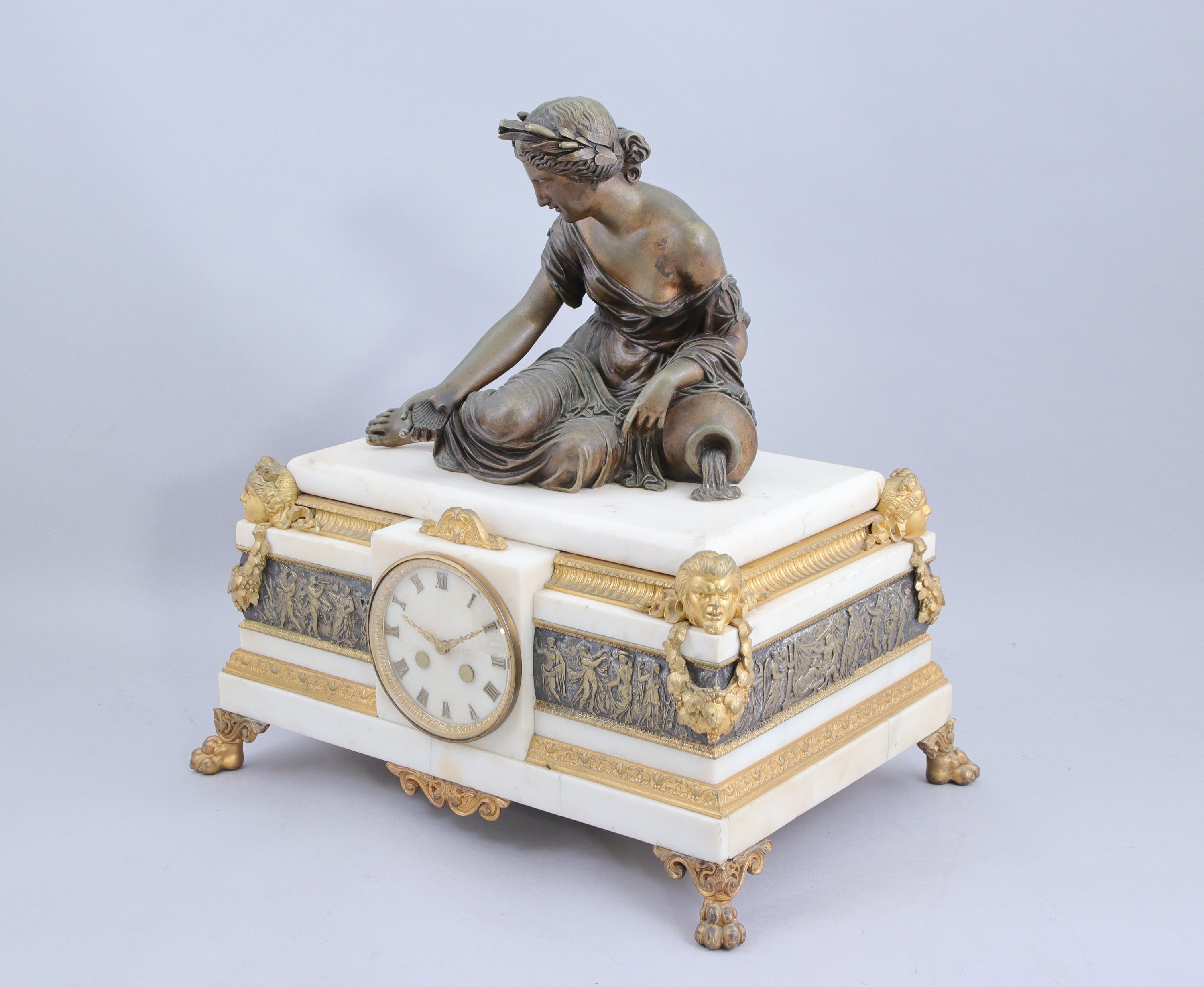 comprenant une pendule ornée d'une femme figurant l'allégorie des flots, accoudée à une base rectangulaire abritant le cadran et décorée d'une frise de personnages à la grecque, mascarons et guirlandes en bronze doré.