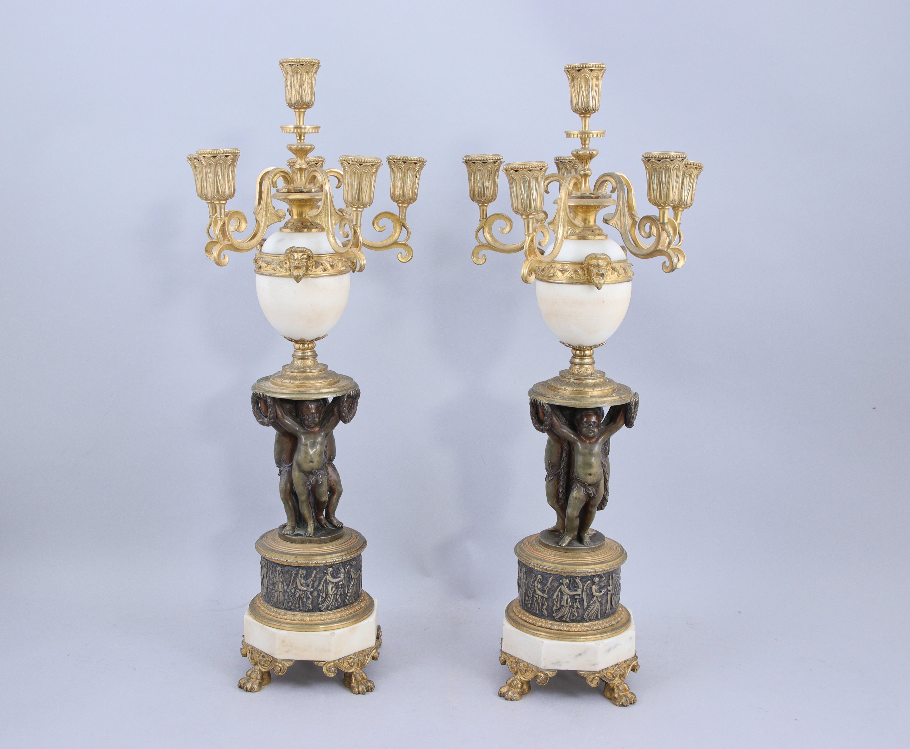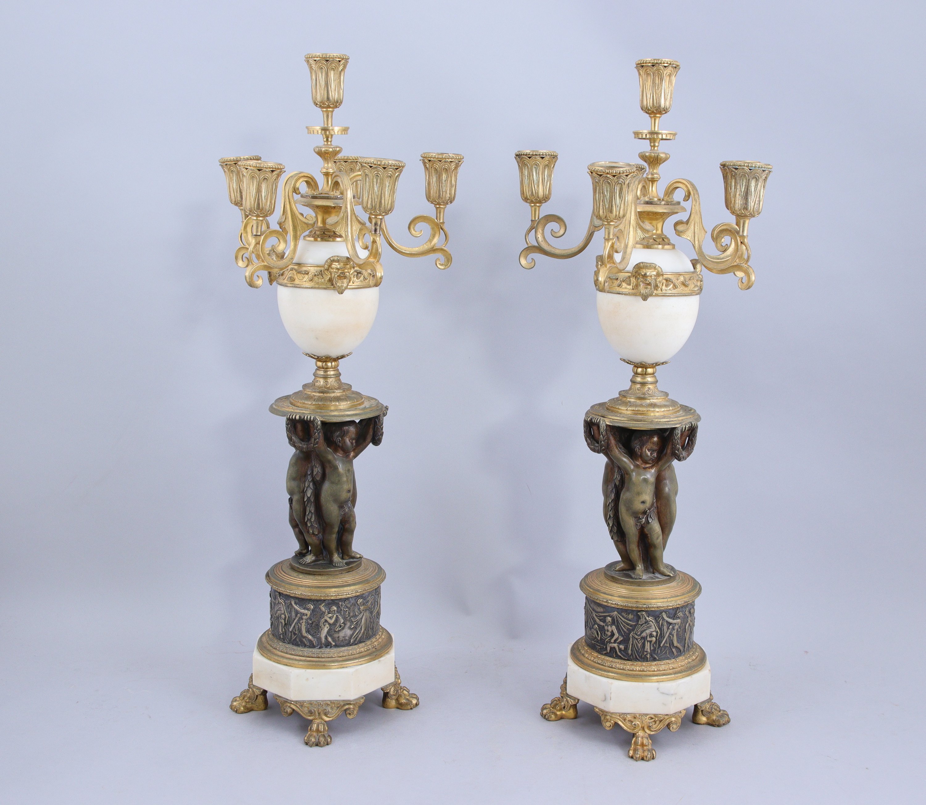 Elle est complétée d'une paire de candélabres en bronze patiné et doré et marbre blanc, décorée de putto soutenant le bras à cinq feux de lumière et reposant sur un piédestal décoré d'une frise à l'antique et de pieds griffus.