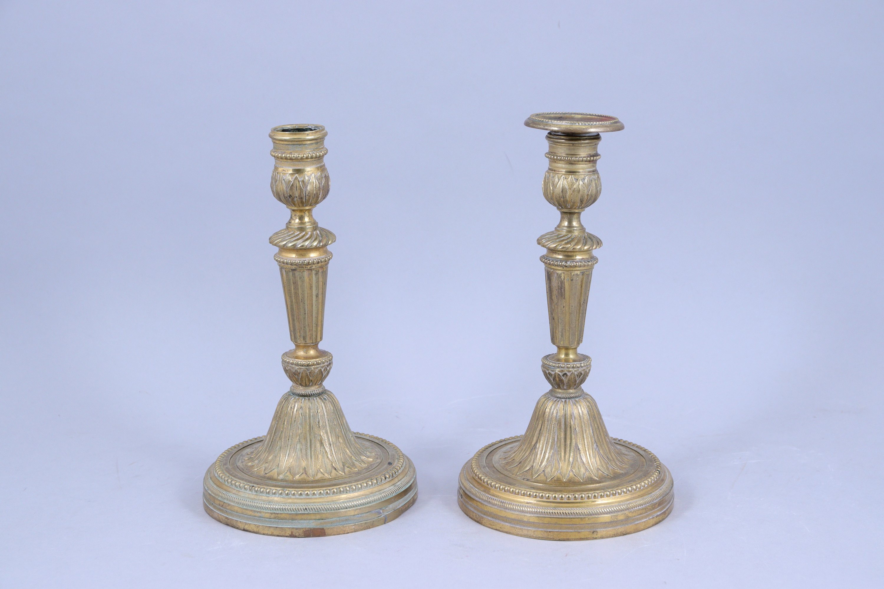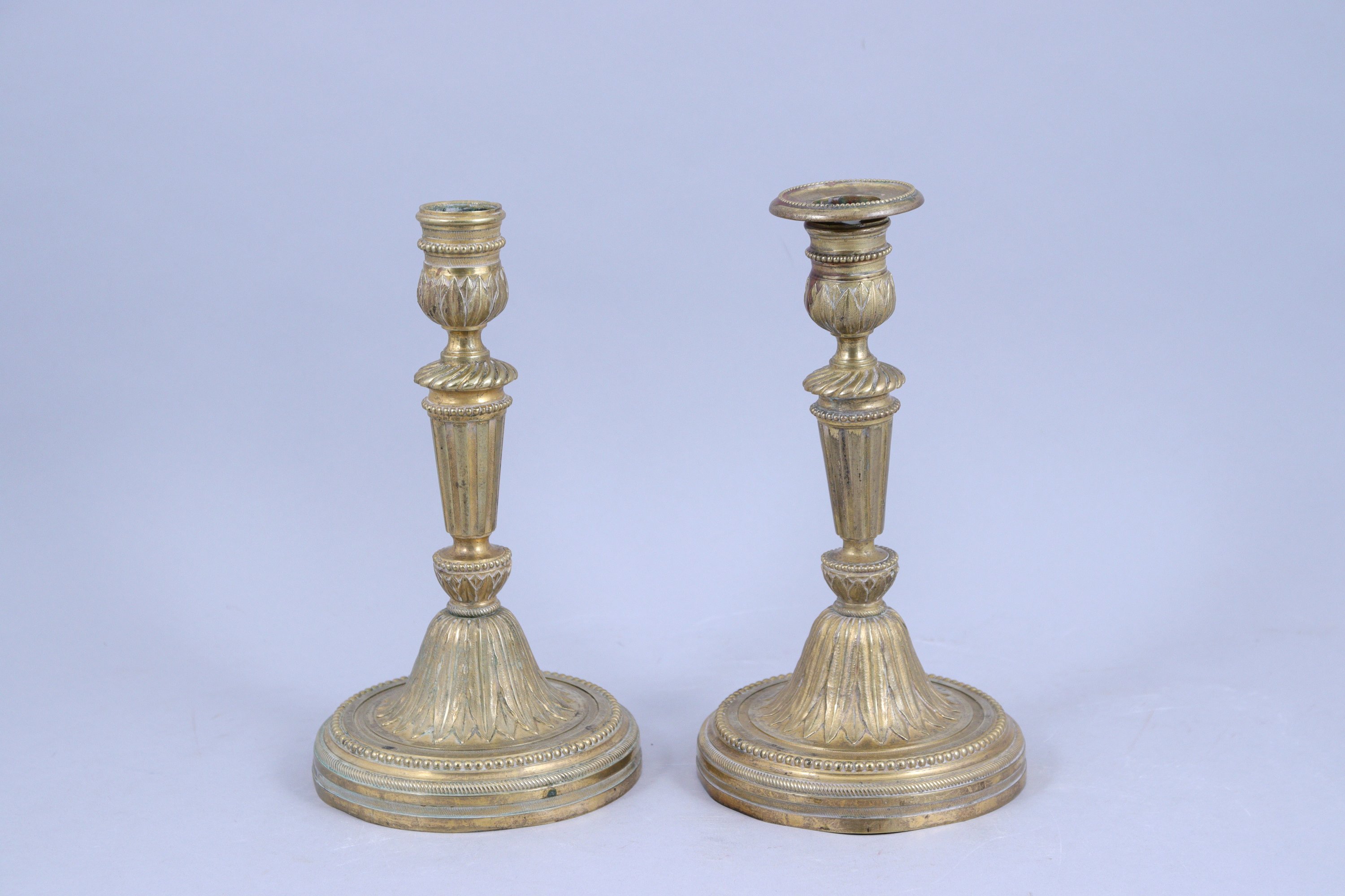 en bronze doré et ciselé, à décor de feuilles de lotus, rangs de perles et godrons torsadés, le fût en colonne cannelée.