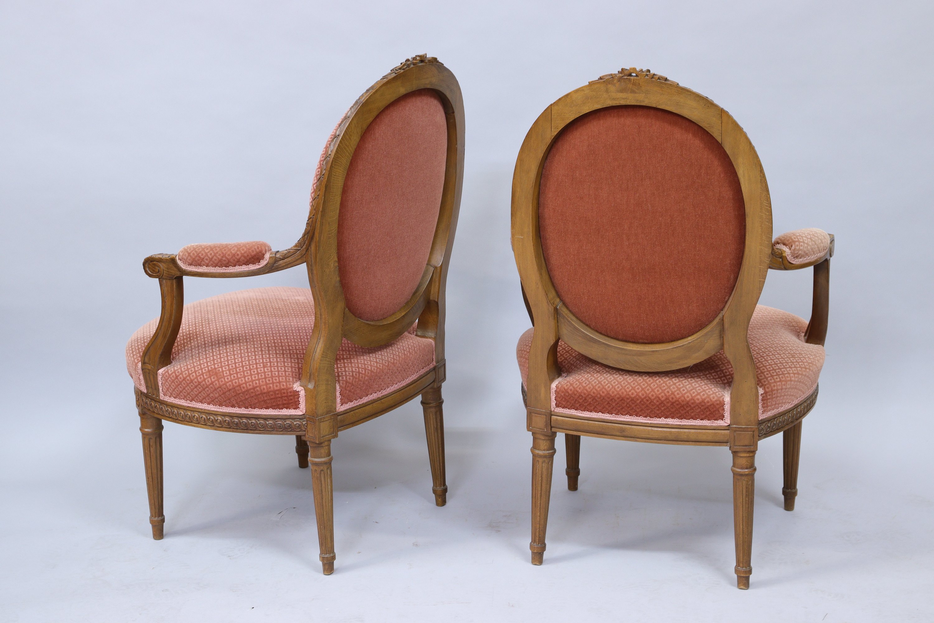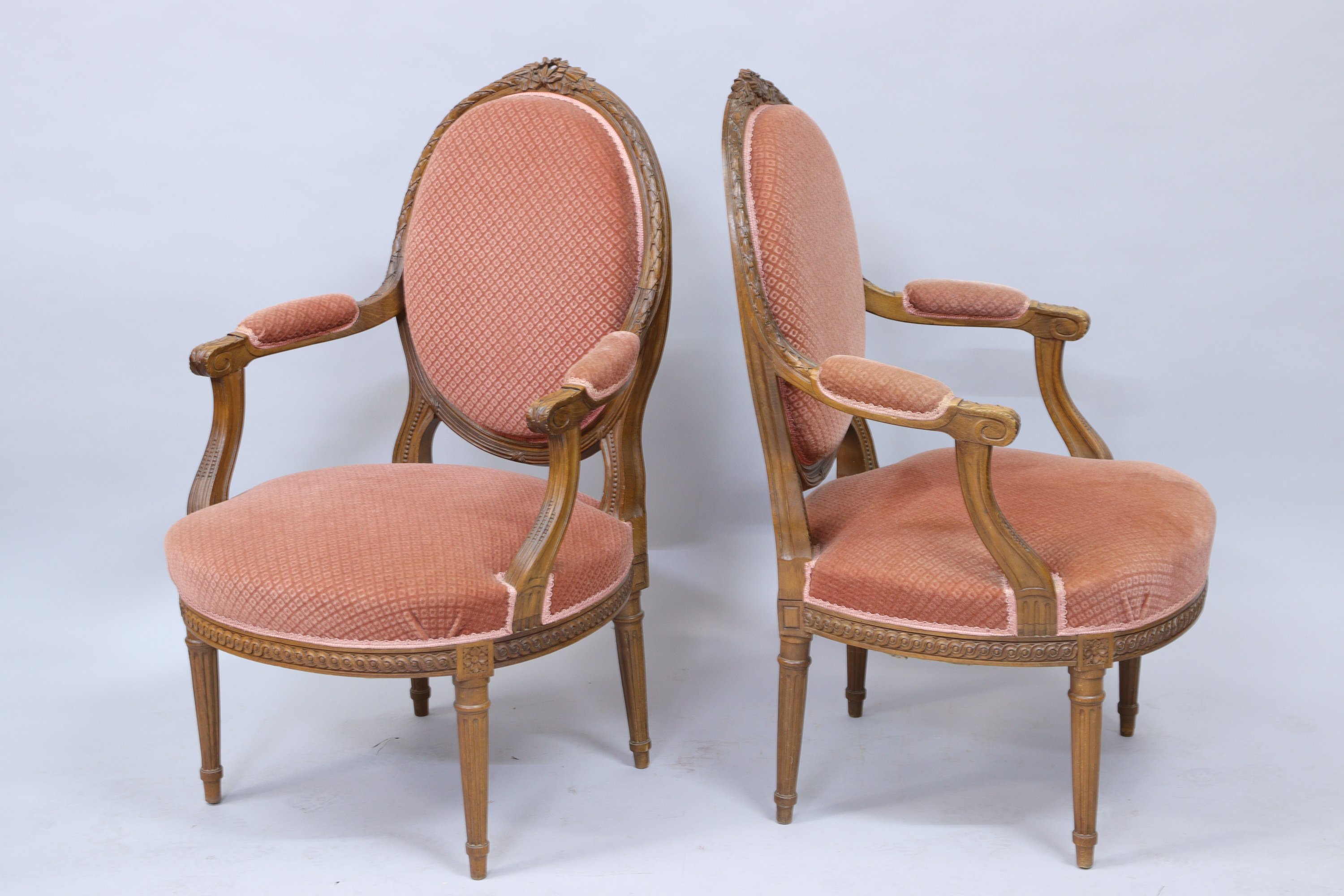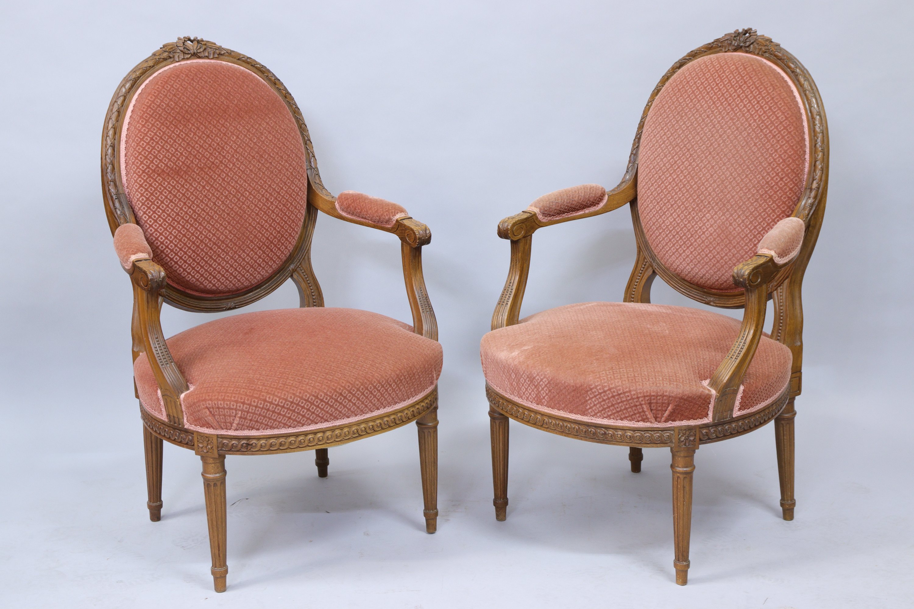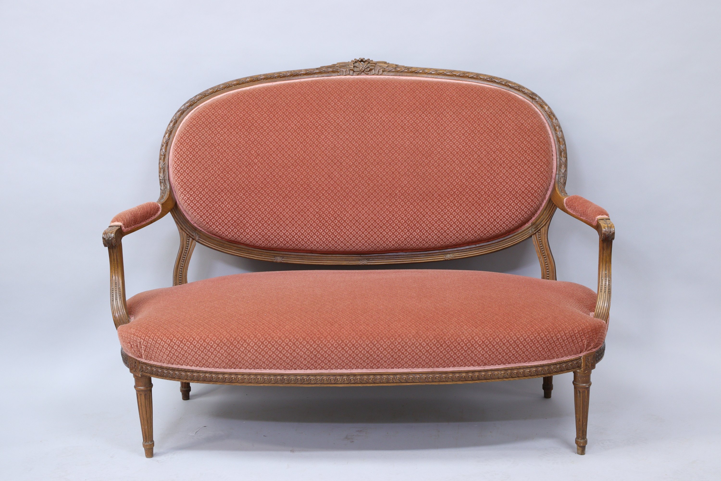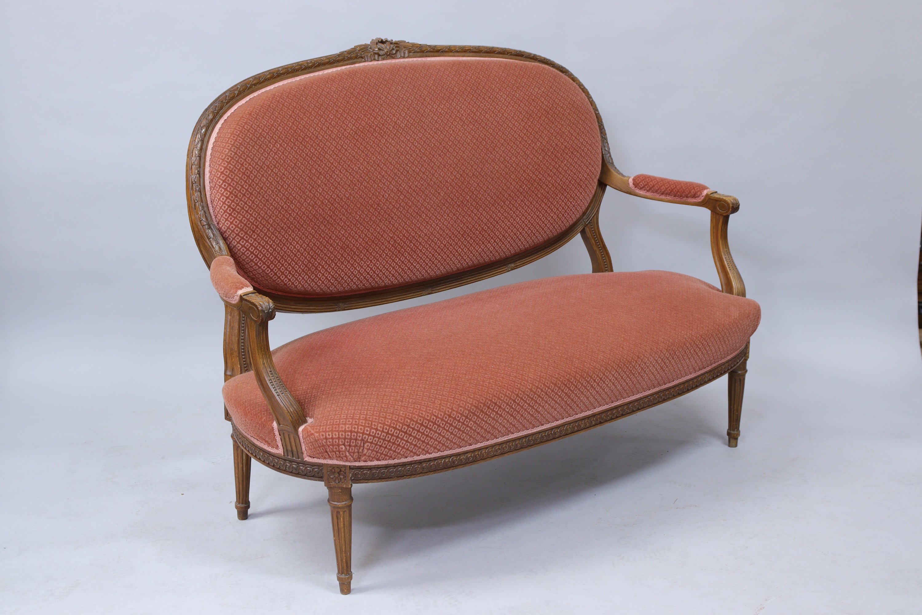 en bois mouluré et sculpté d'une frise de laurier terminée par un noeud sur le dossier et d'une frise à enroulement de vague sur la ceinture. Accotoirs en retrait à manchettes. Il repose sur quatre pieds cannelés. Garnis d'un velours vieux rose.