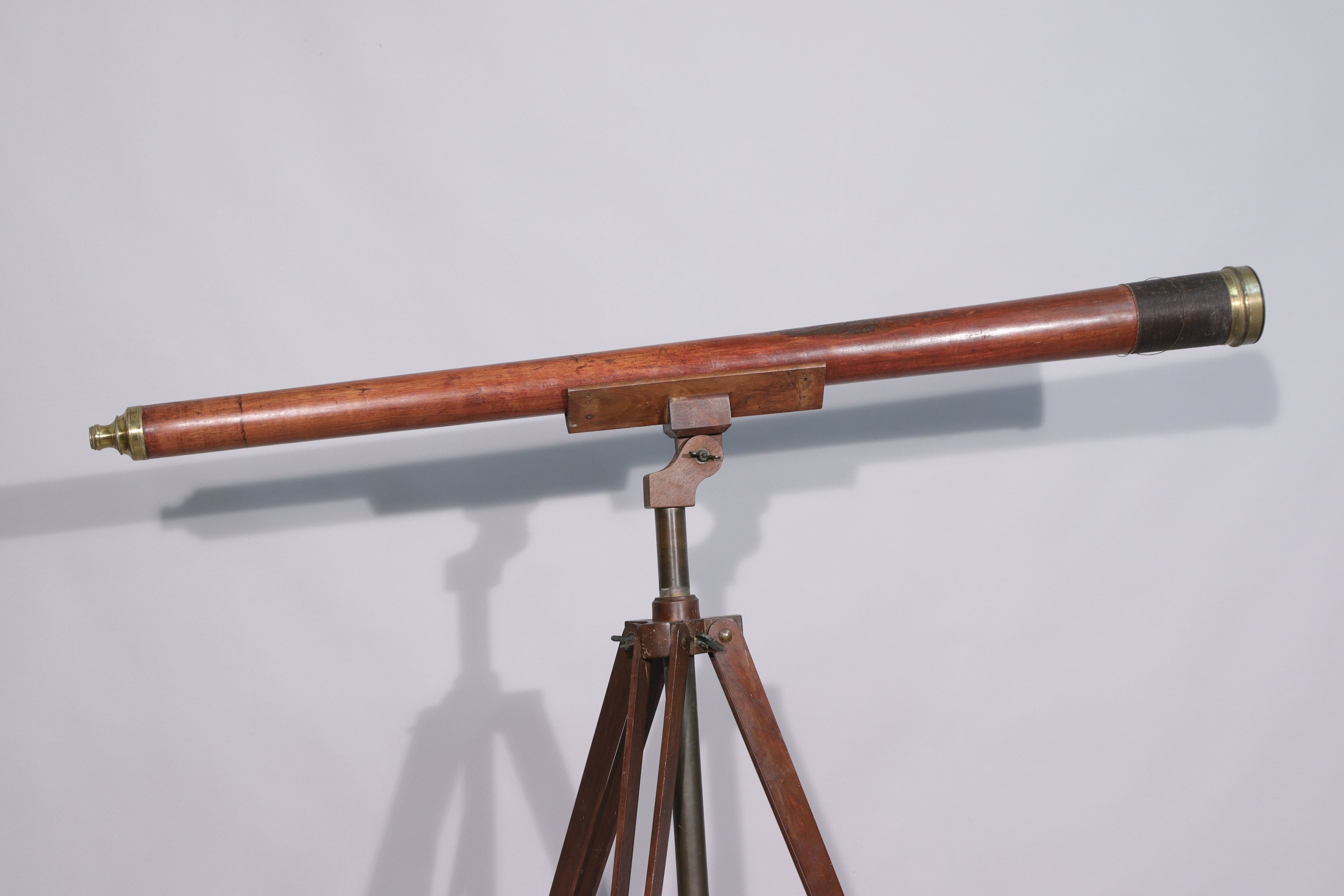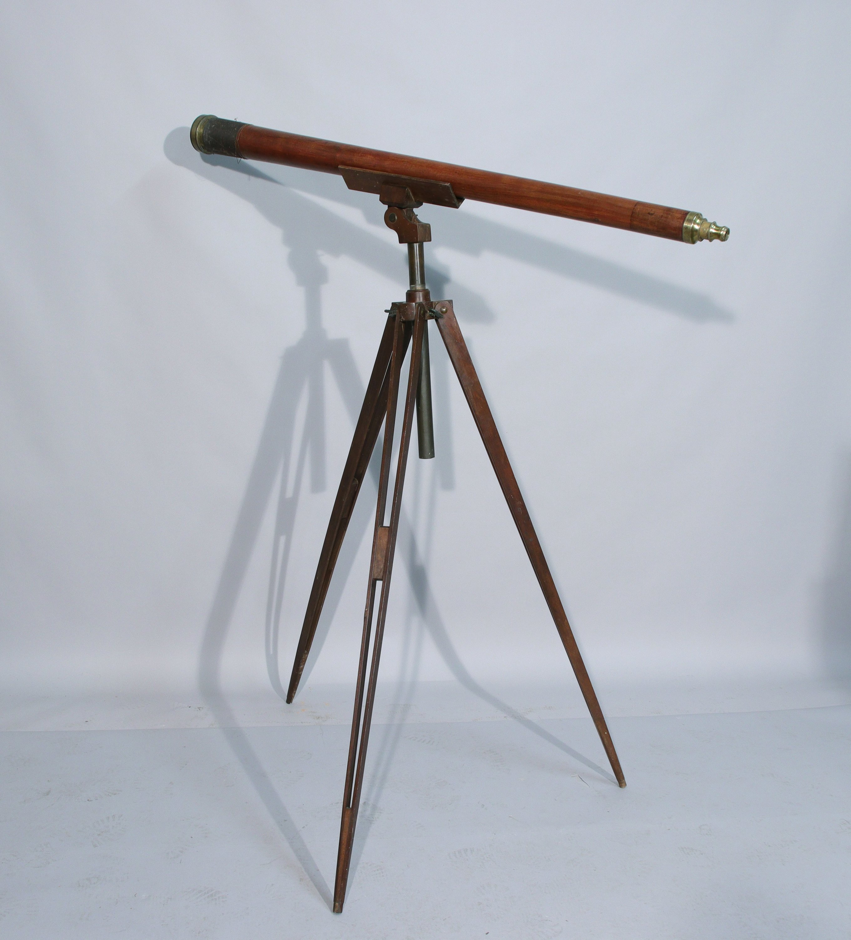 en bois et laiton à un tirage et trois optiques, sur un grand trépied à coulisse en bois avec papillons de réglages.