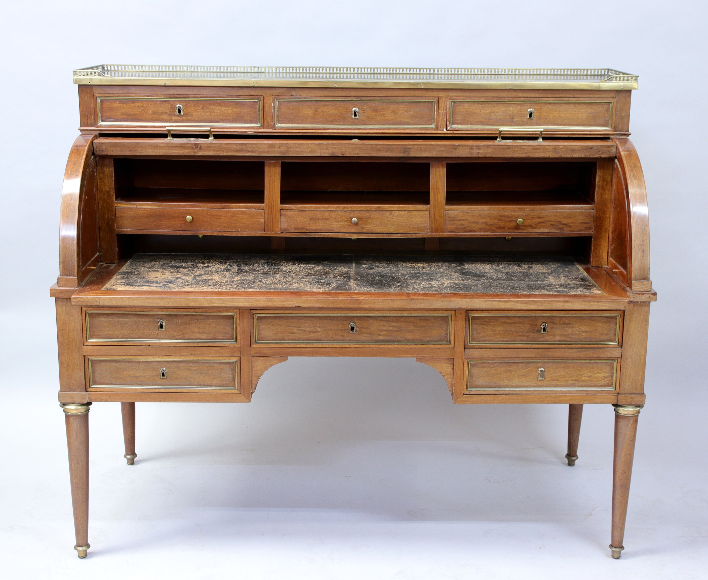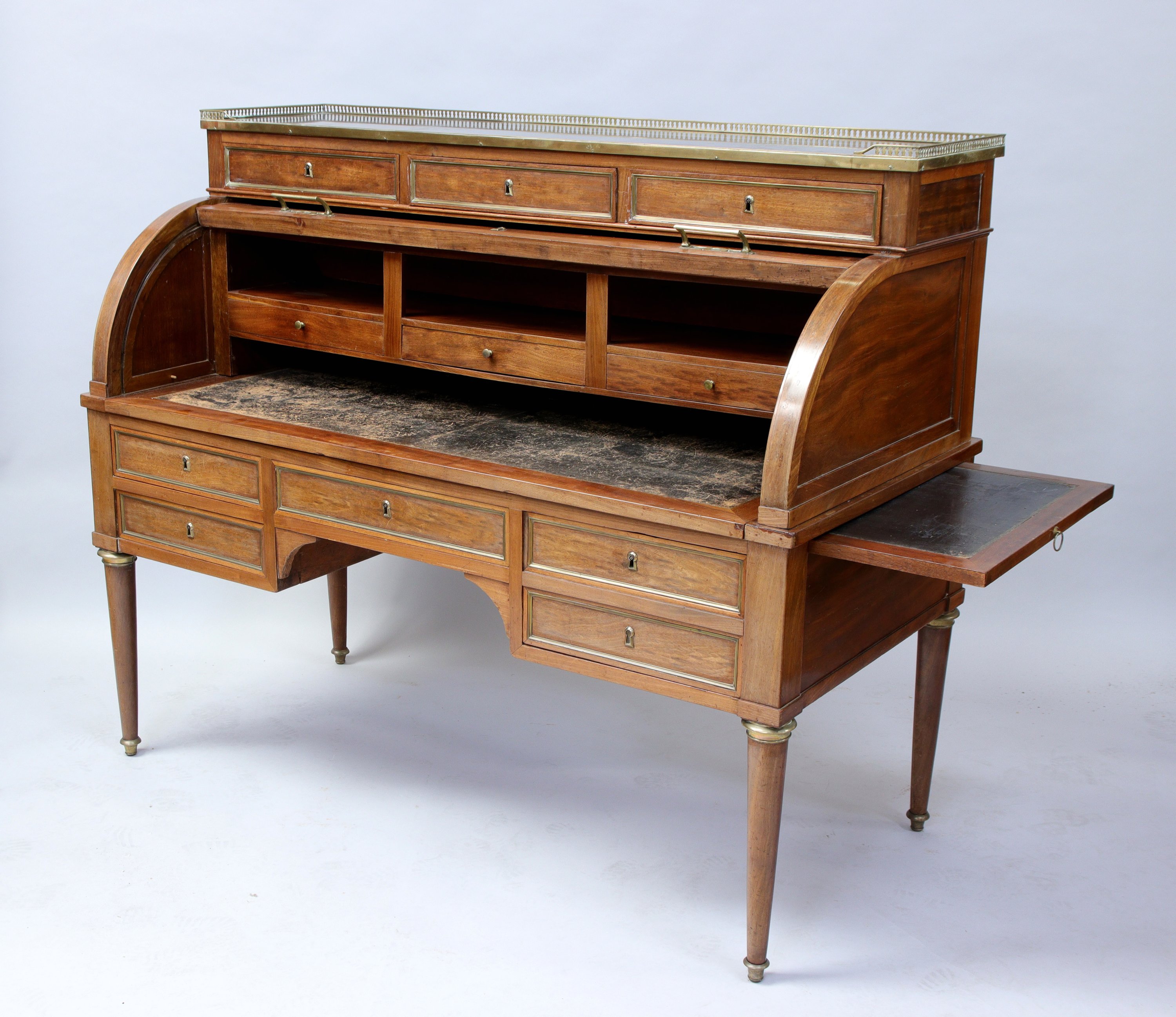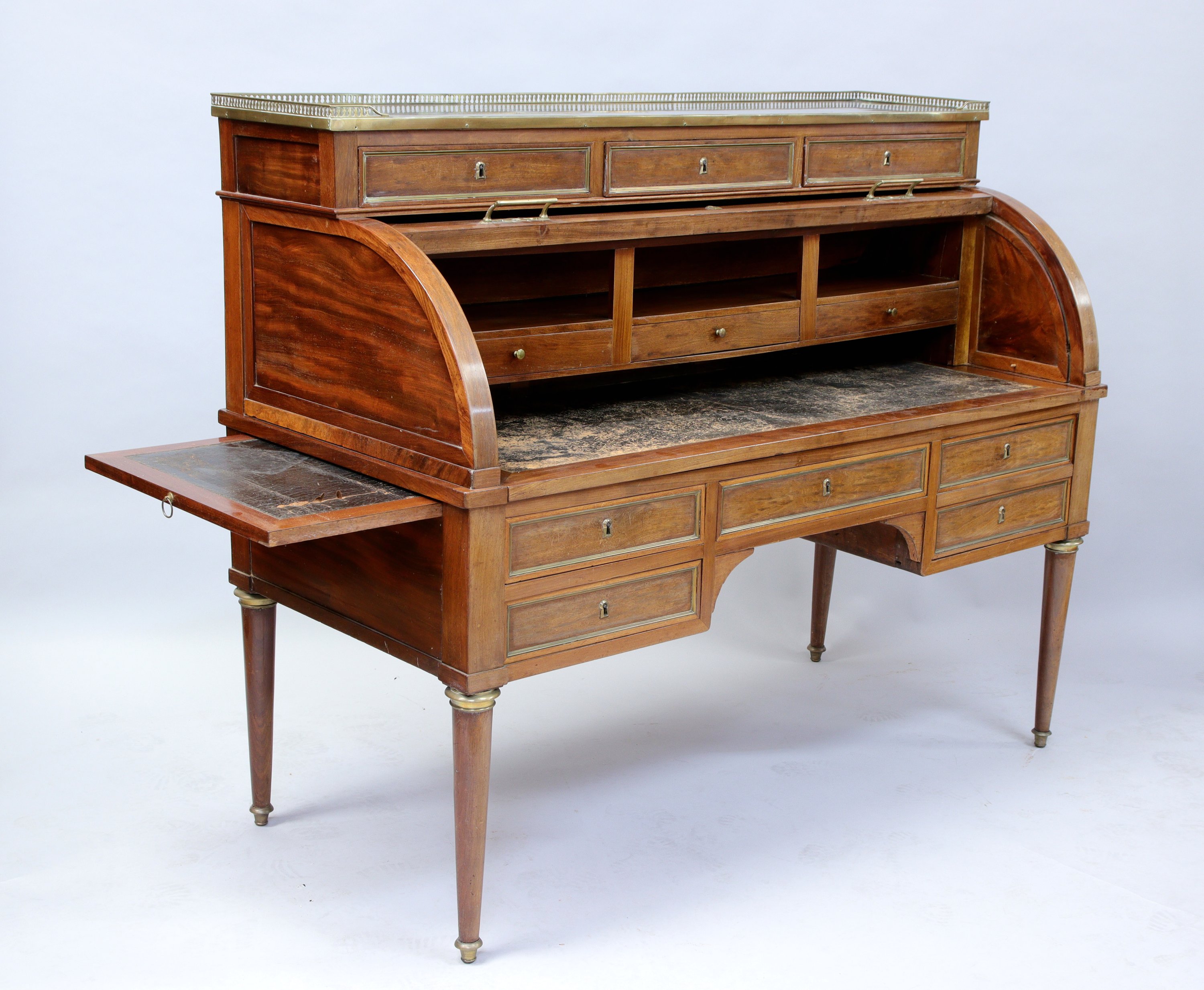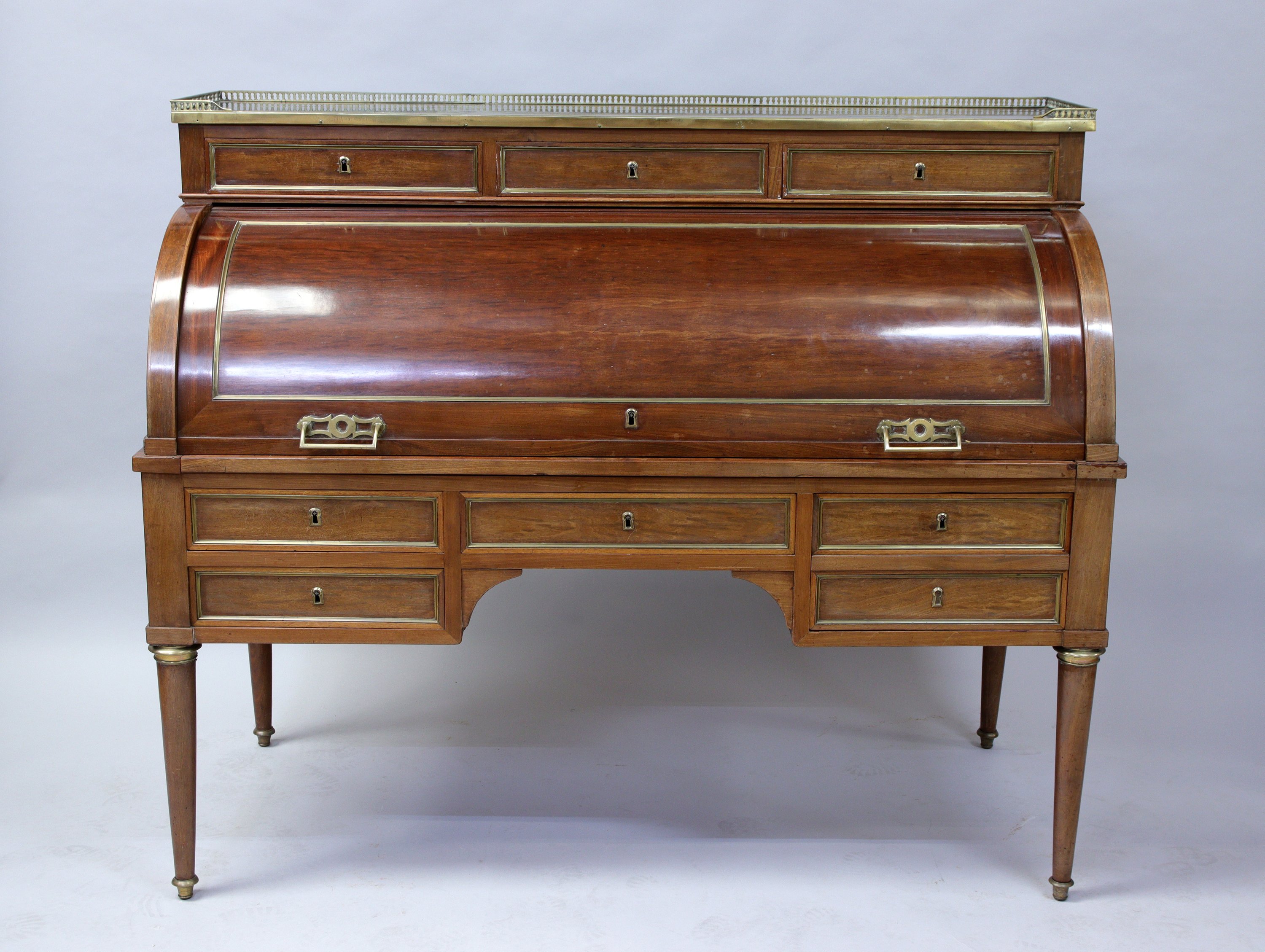 en acajou et placage d'acajou toutes faces. Il ouvre par trois tiroirs en gradin, un cylindre découvrant un plateau à tirage garni d'un cuir noir et trois tiroirs sous trois compartiments. La ceinture se compose d'un tiroir central, deux tiroirs à gauche et un tiroir à droite comportant un secret à clé. Une tirette de chaque côté garnie de cuir noir. Il repose sur quatre pieds fuselés. Dessus de marbre gris. Ornementation de laiton dont galerie ajourée, entrées de serrure, poignées fixe et sabots. Serrures à trèfle.
