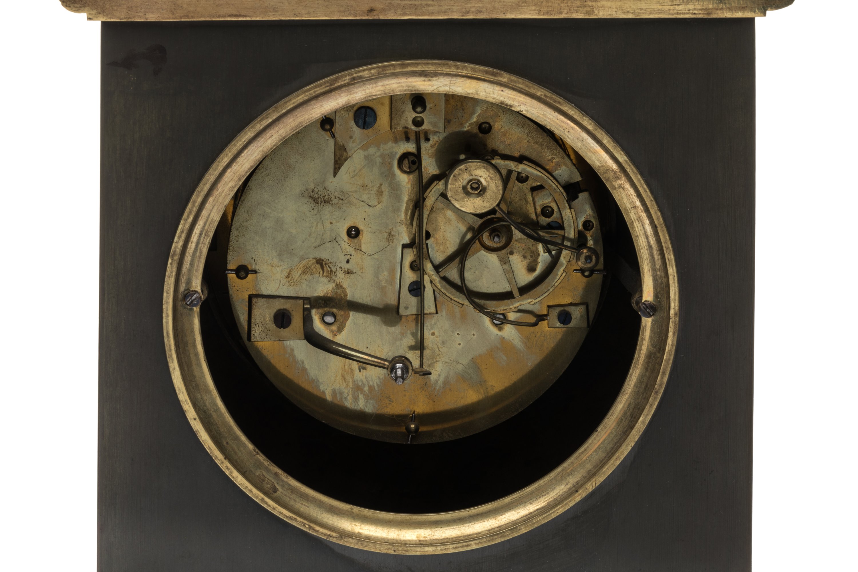 en bronze patiné et doré, surmontée d'un globe, d'une couronne de laurier et d'instruments scientifiques. Le cadran doré rayonnant à chiffres romains et chemin de fer est ceint d'une figure d'Ouroboros en bronze doré. Les trois faces sont ornées de rosaces et corniches en bronze doré et finement ciselées de guirlandes de palmettes, oves stylisés et alternés de feuillage. Elle repose sur une base rectangulaire en bronze patiné ornée et d'un bas-relief à trois personnages à l'antique, aux quatre patins dorés.