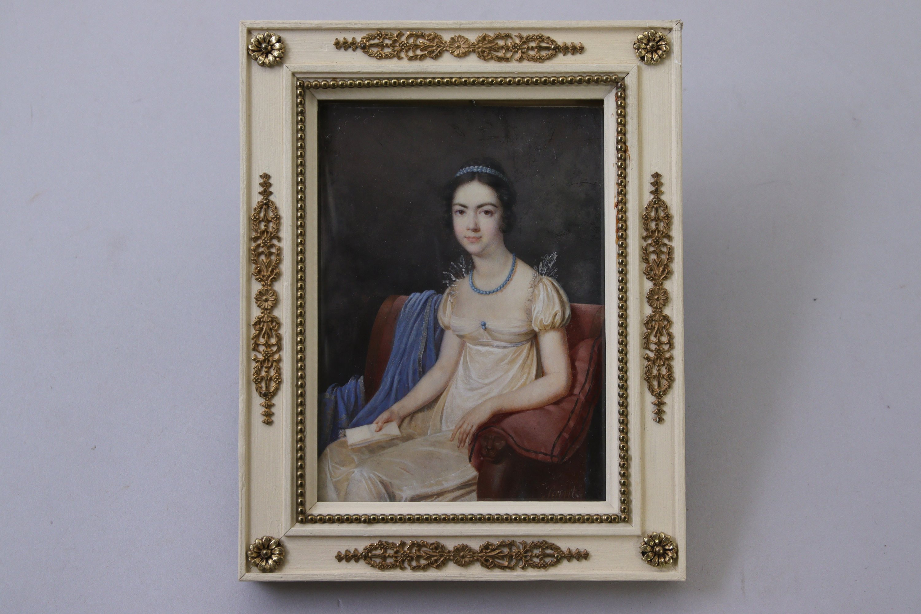 Daniel Saint (1778-1847) Dame à la lettreMiniature signée en bas...