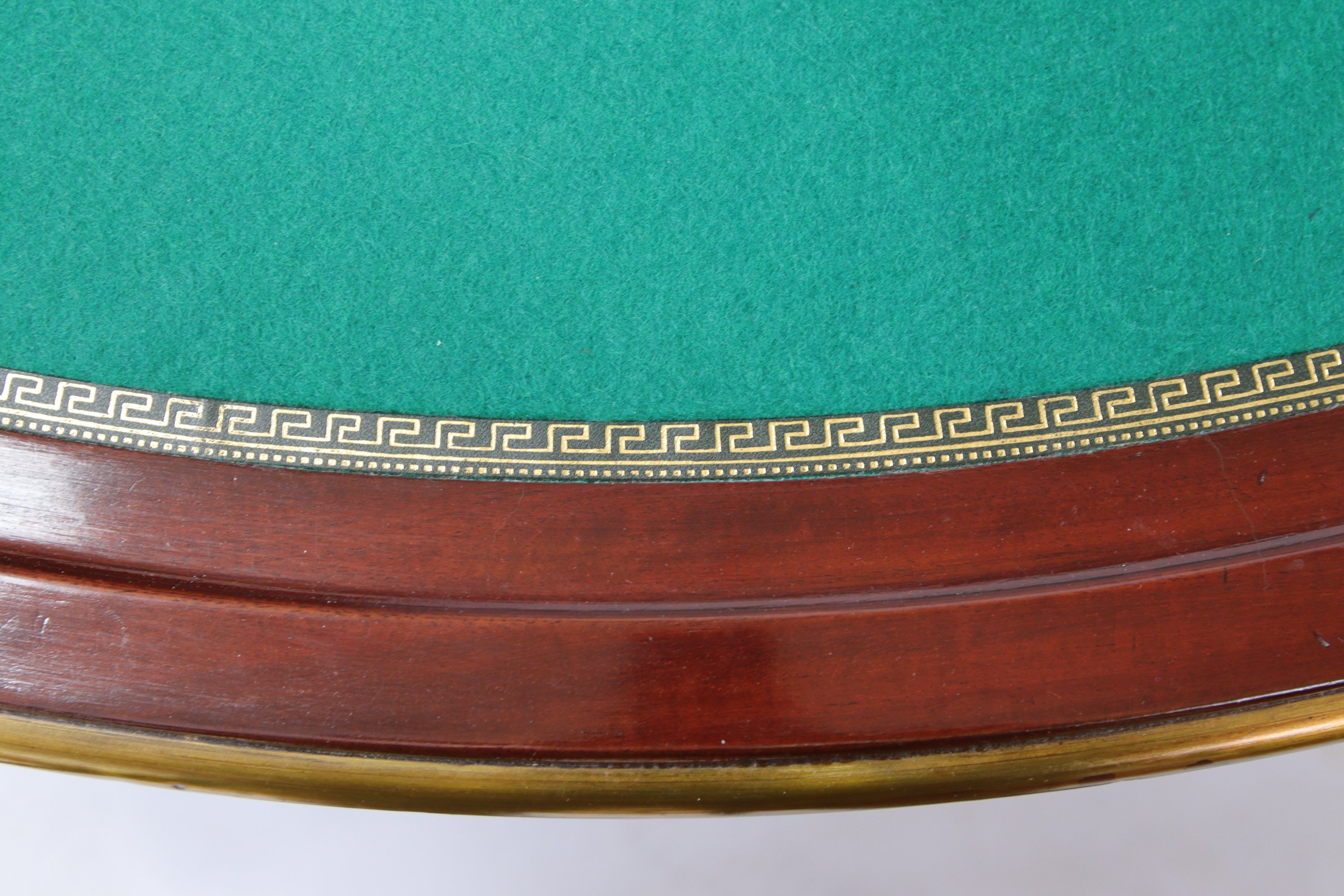 en acajou et placage d'acajou. Le plateau se dépliant pour former table de jeu, foncé d'un feutre vert. Elle repose sur cinq pieds en gaine disposés sur des roulettes. Tiroir dissimulé dans un pied coulissant, lingotière et bordure des cartouches en cuivre.