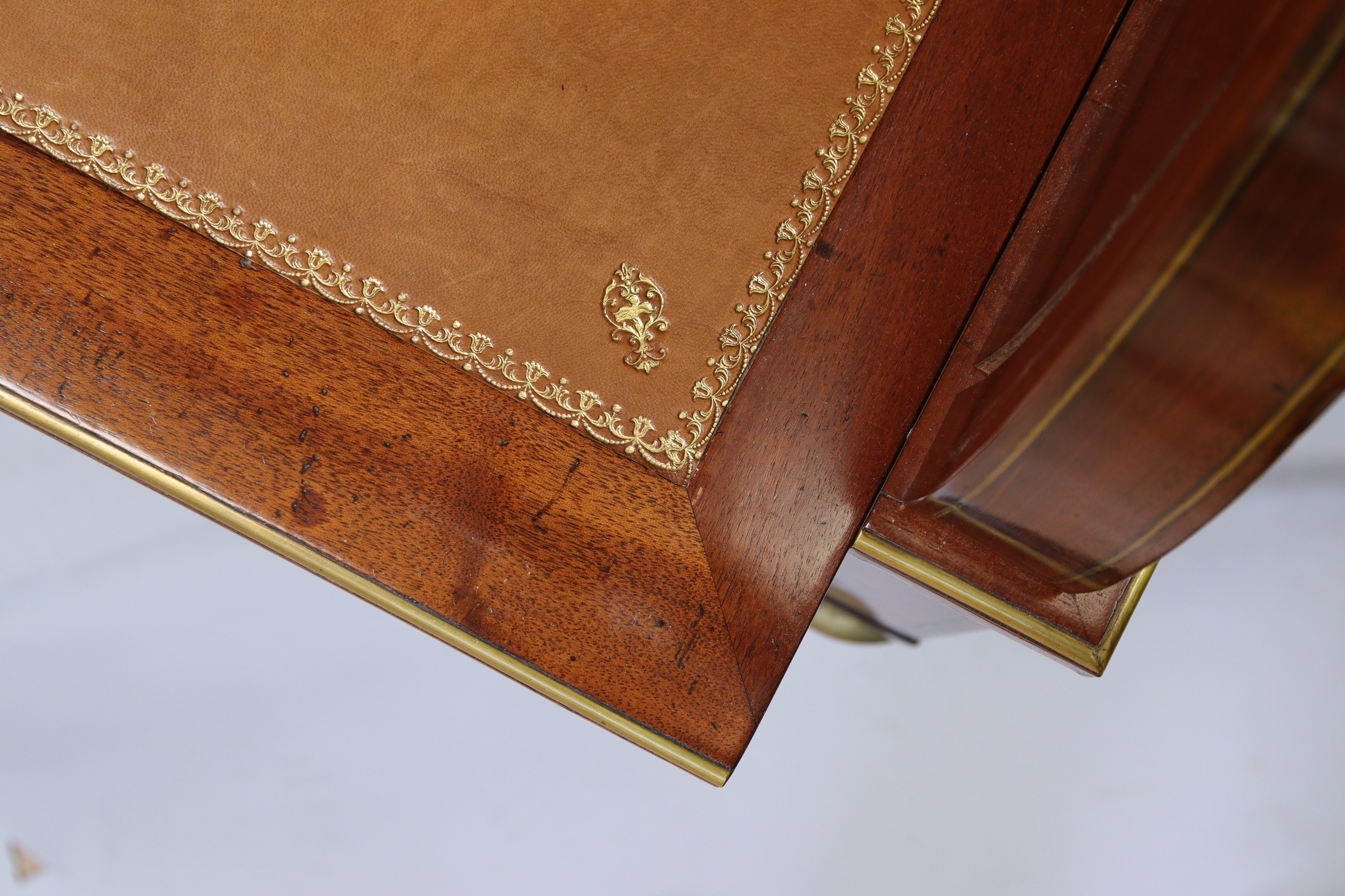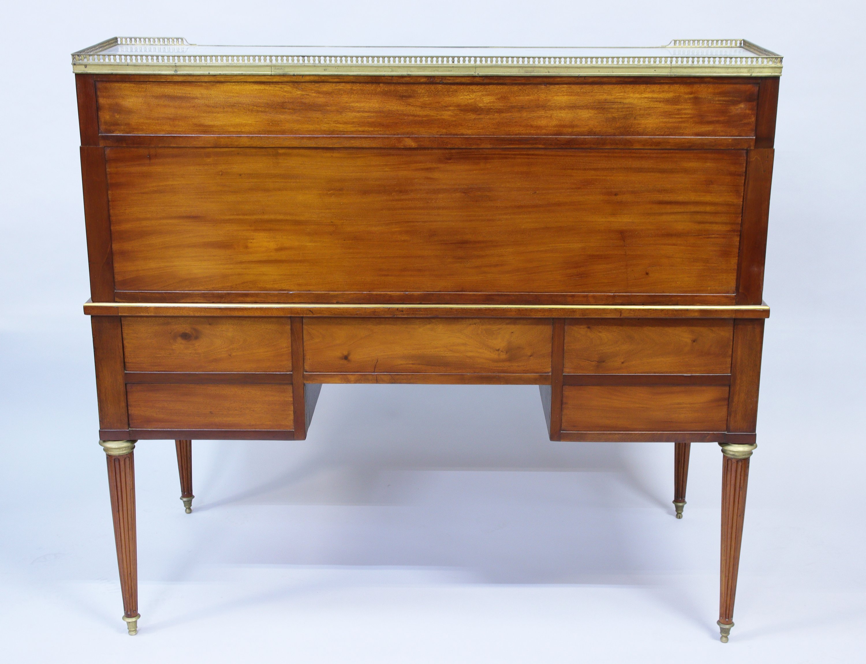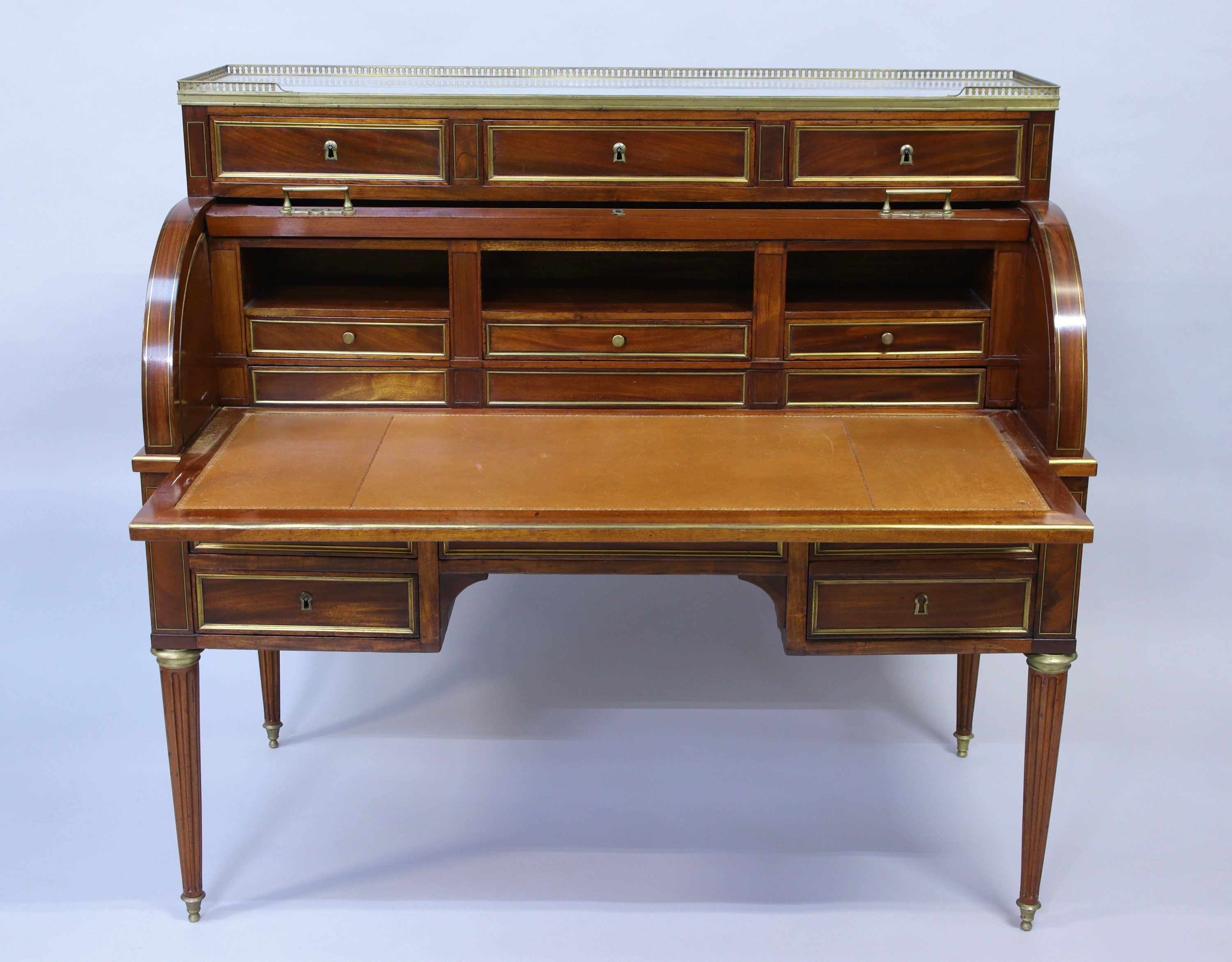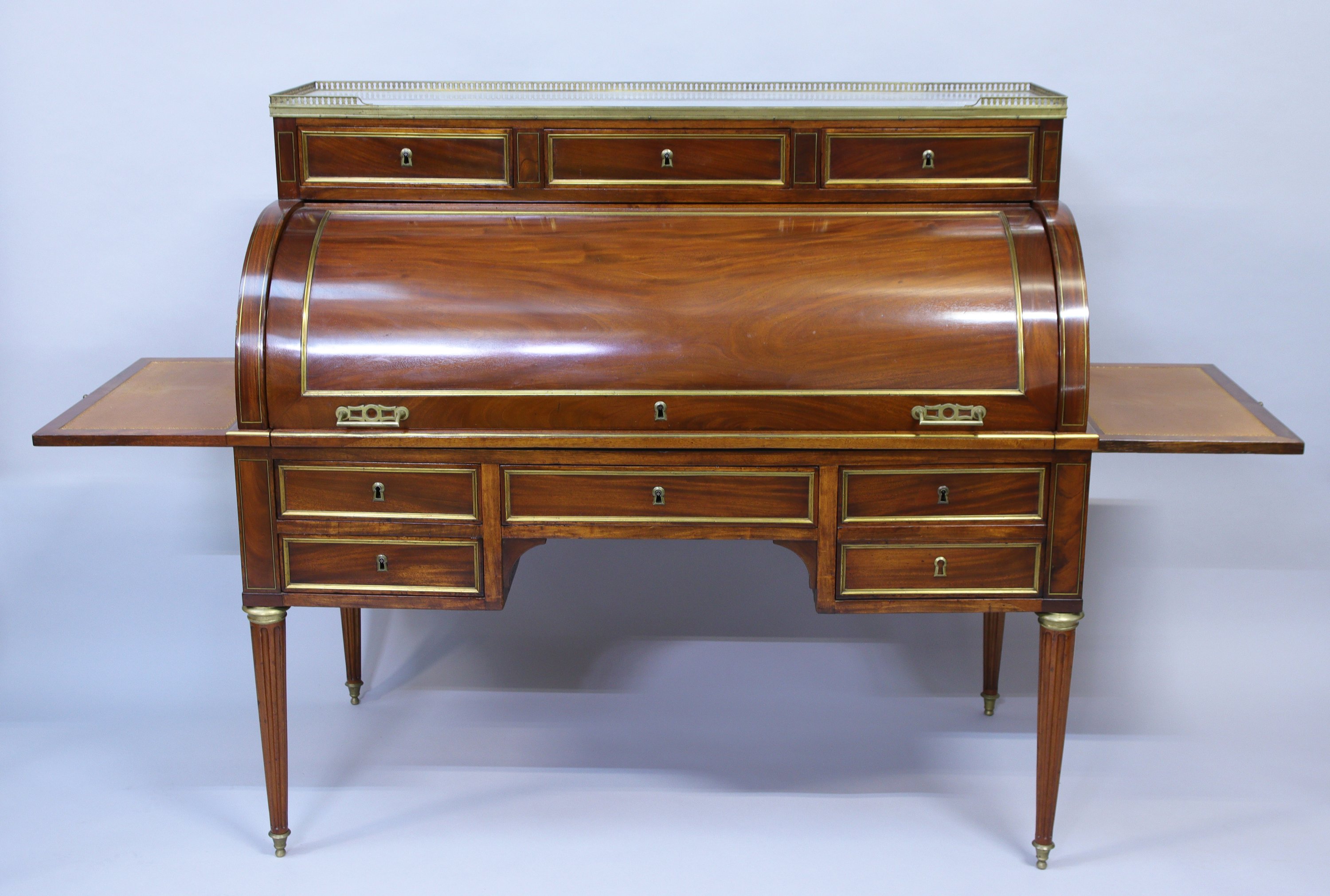 en acajou massif dit de Cuba, recouvert d'un marbre bleu Turquin ceint d'une galerie en laiton ajouré. Il ouvre par trois tiroirs en partie haute et cinq tiroirs dans des caissons et en ceinture. Le cylindre dévoile un casier à six niches dont trois avec des tiroirs. Le plateau et les tirettes sur le côté foncés d'un cuir fauve. Il repose sur quatre pieds cannelés terminés par des sabots en boule de bronze. Entrées de serrure à trèfles.
