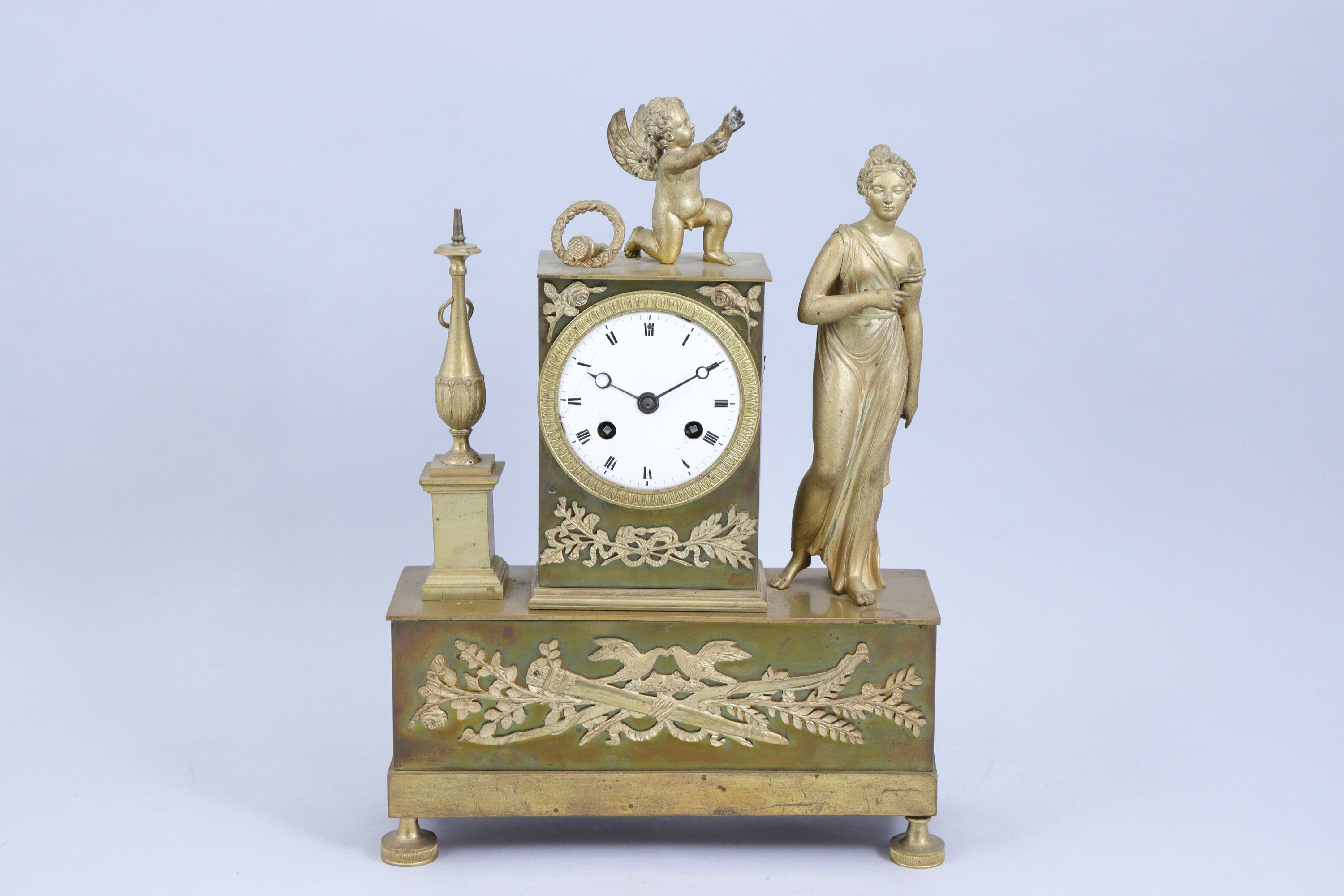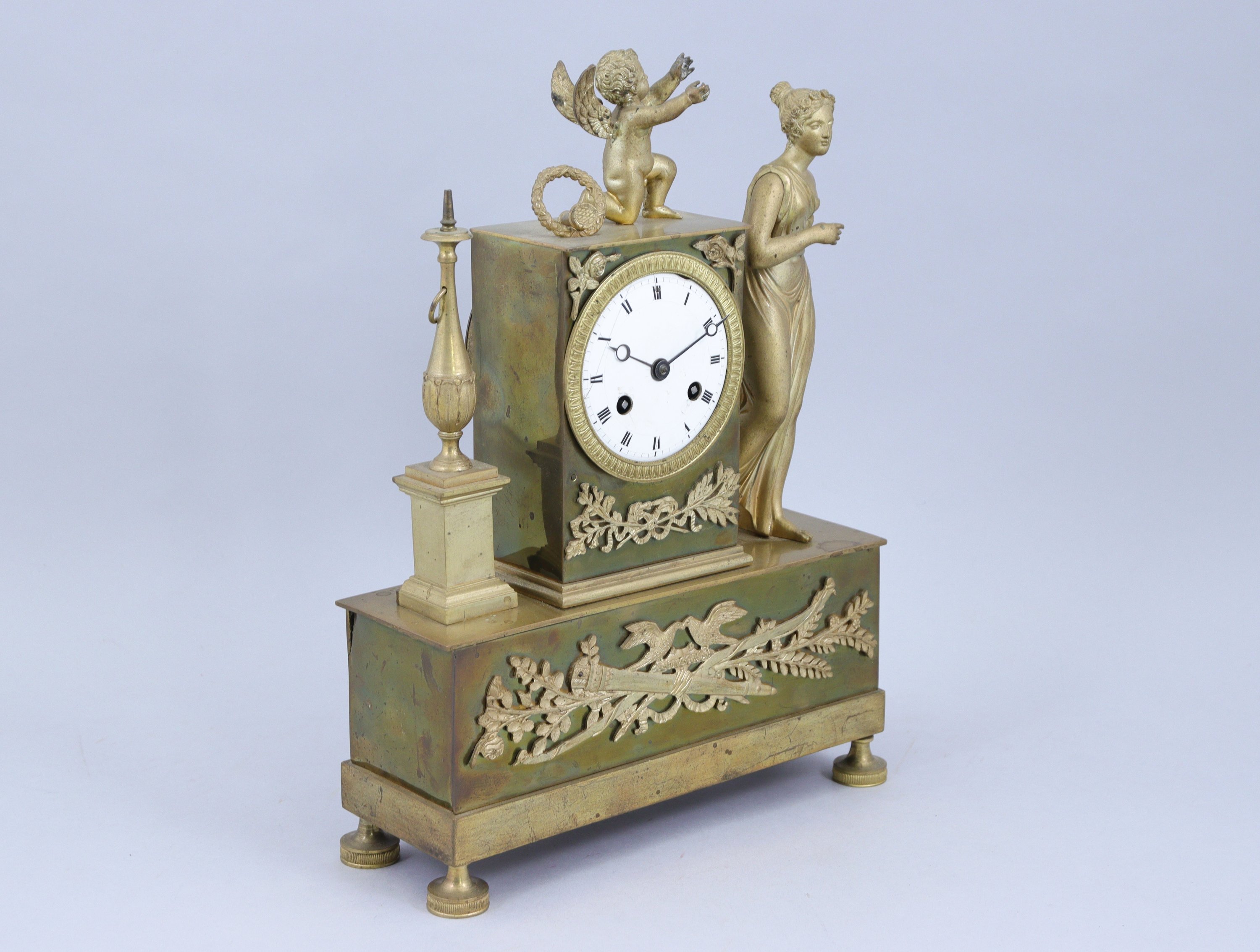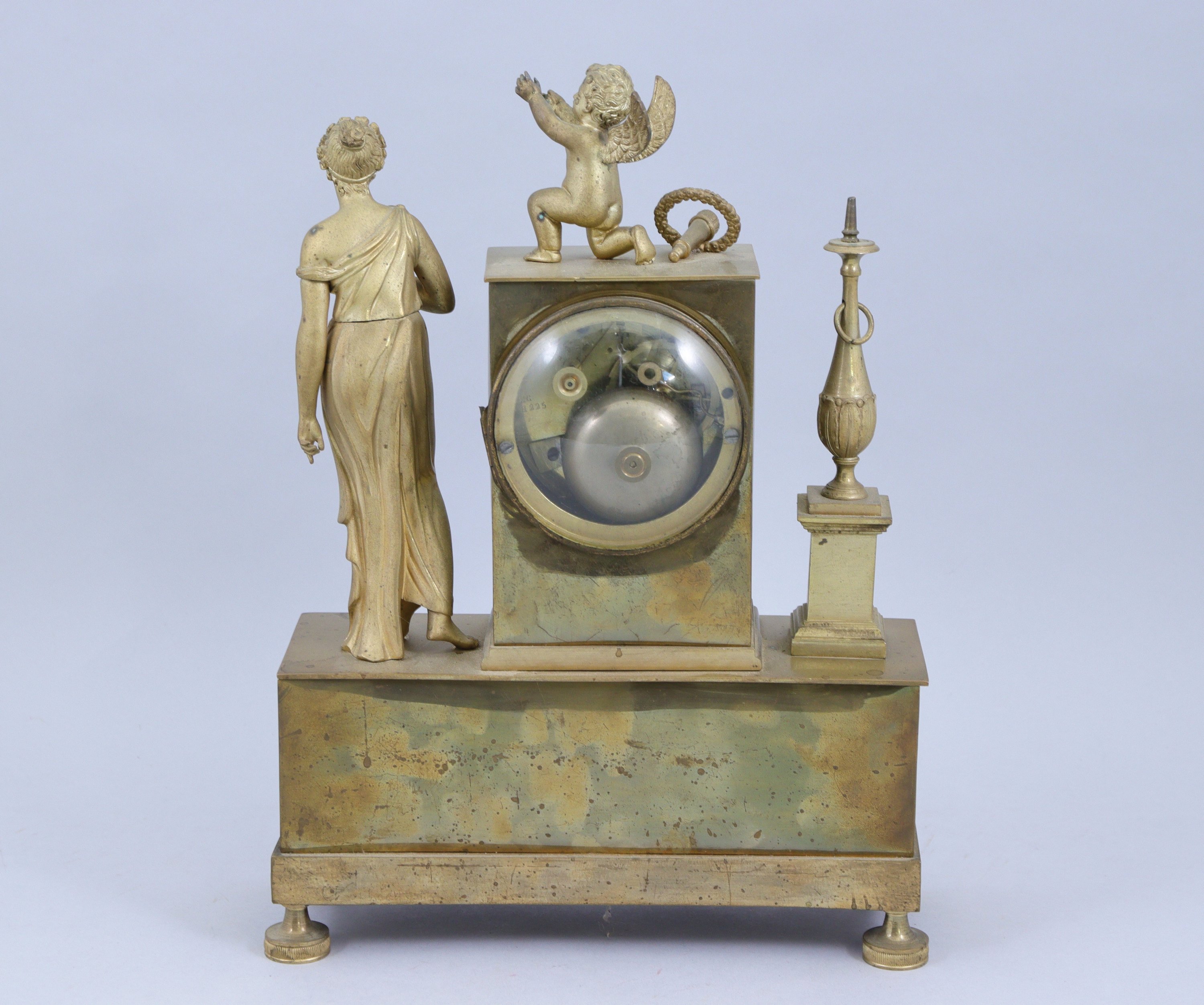 en bronze doré. Le cadran émaillé blanc est entouré de roses. Il indique les heures en chiffres romains et les minutes par un chemin de fer. Psychée pointant du doigt, l'Amour lui tendant les bras à côté d'un carquois et d'une couronne fleurie. A gauche, une colonne balustre reposant sur un piédestal. La base présente une applique à décor de deux tourterelles s'embrassant sur un carquois dans un entourage de branches d'olivier et rosier. Quatre pieds patins.