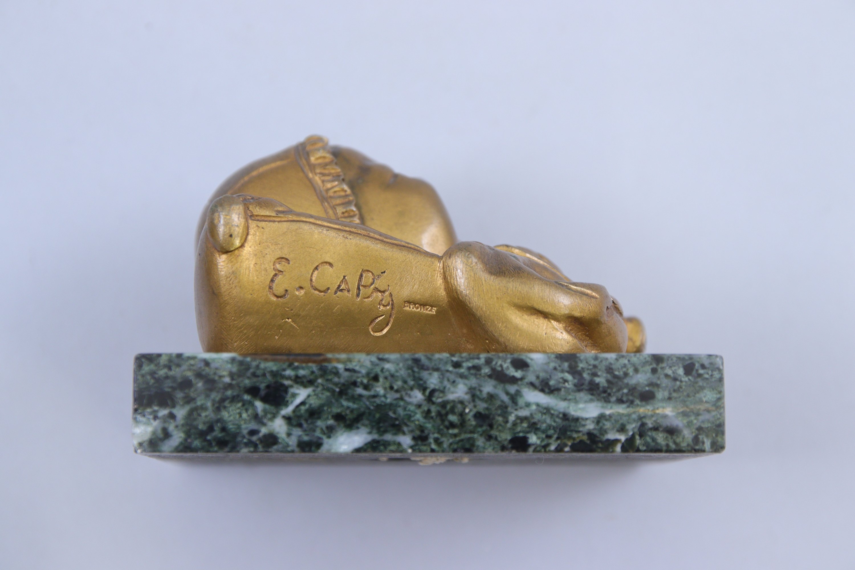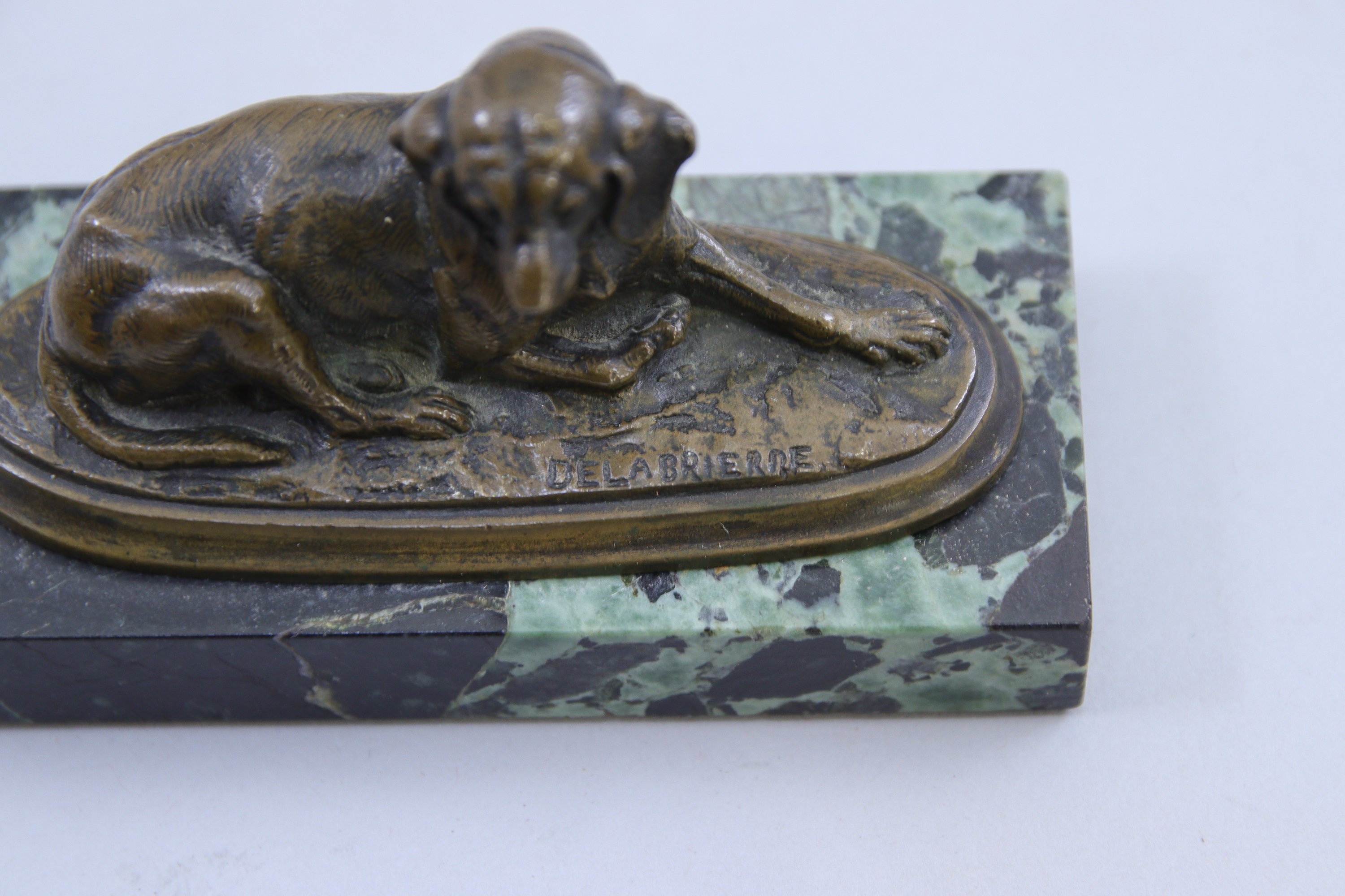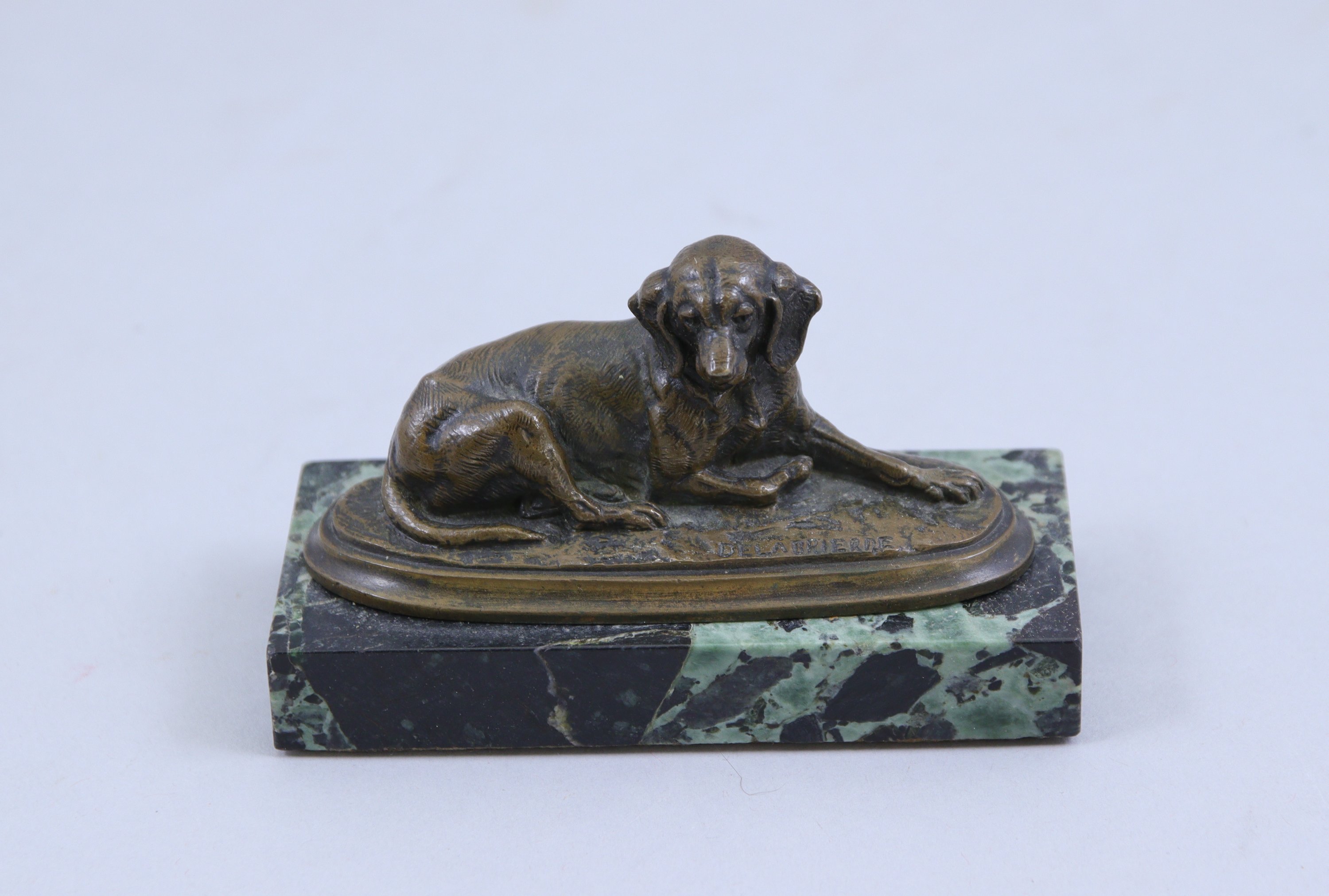 Joint : D'après Édouard Paul Delabrière (1829-1912). Chien couché. Bronze à patine brune signé sur la terrasse. Long. 9,5 cm.