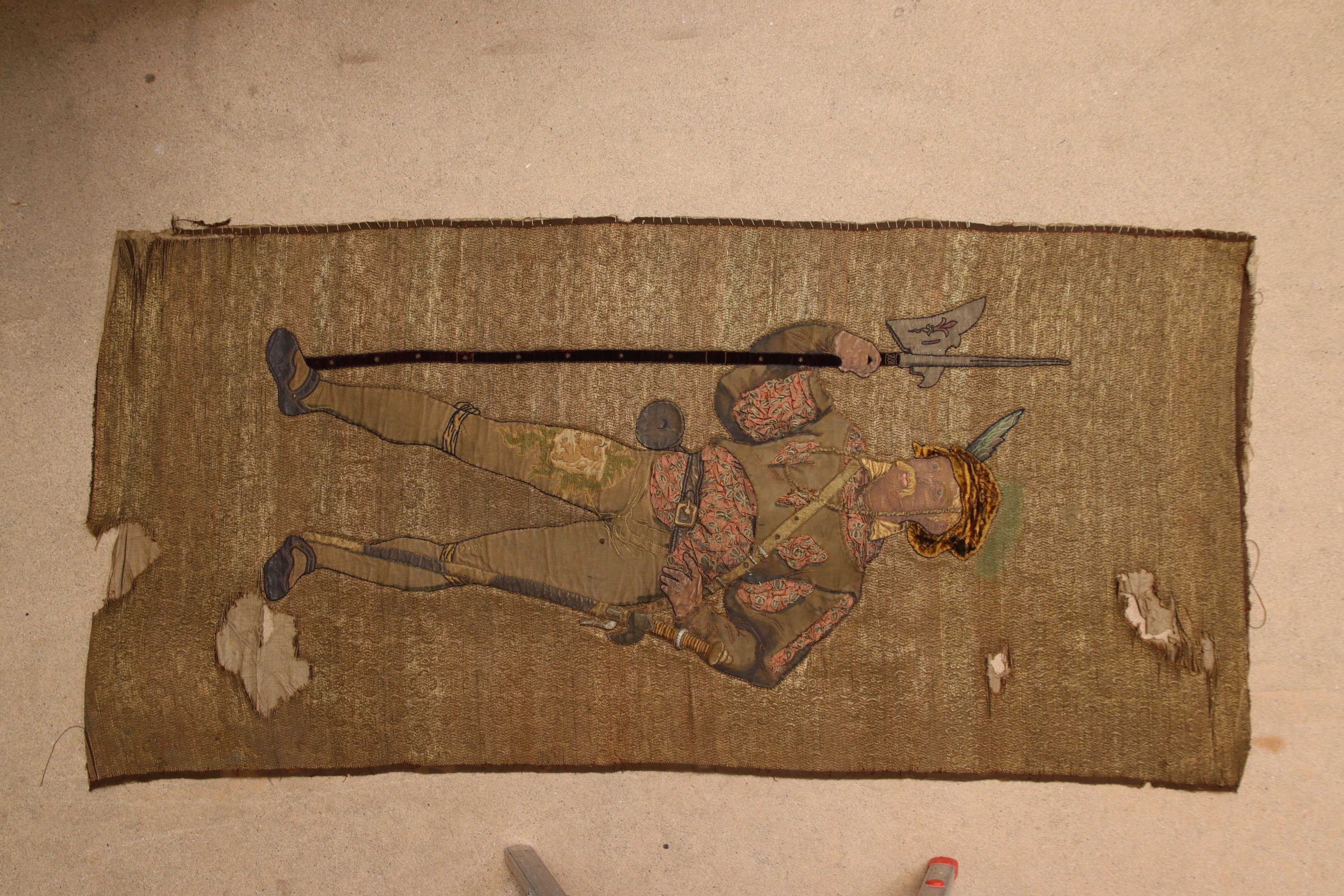 à fond or à décor brodé en application de deux soldats de la Renaissance. Les visages sont pinceautés.