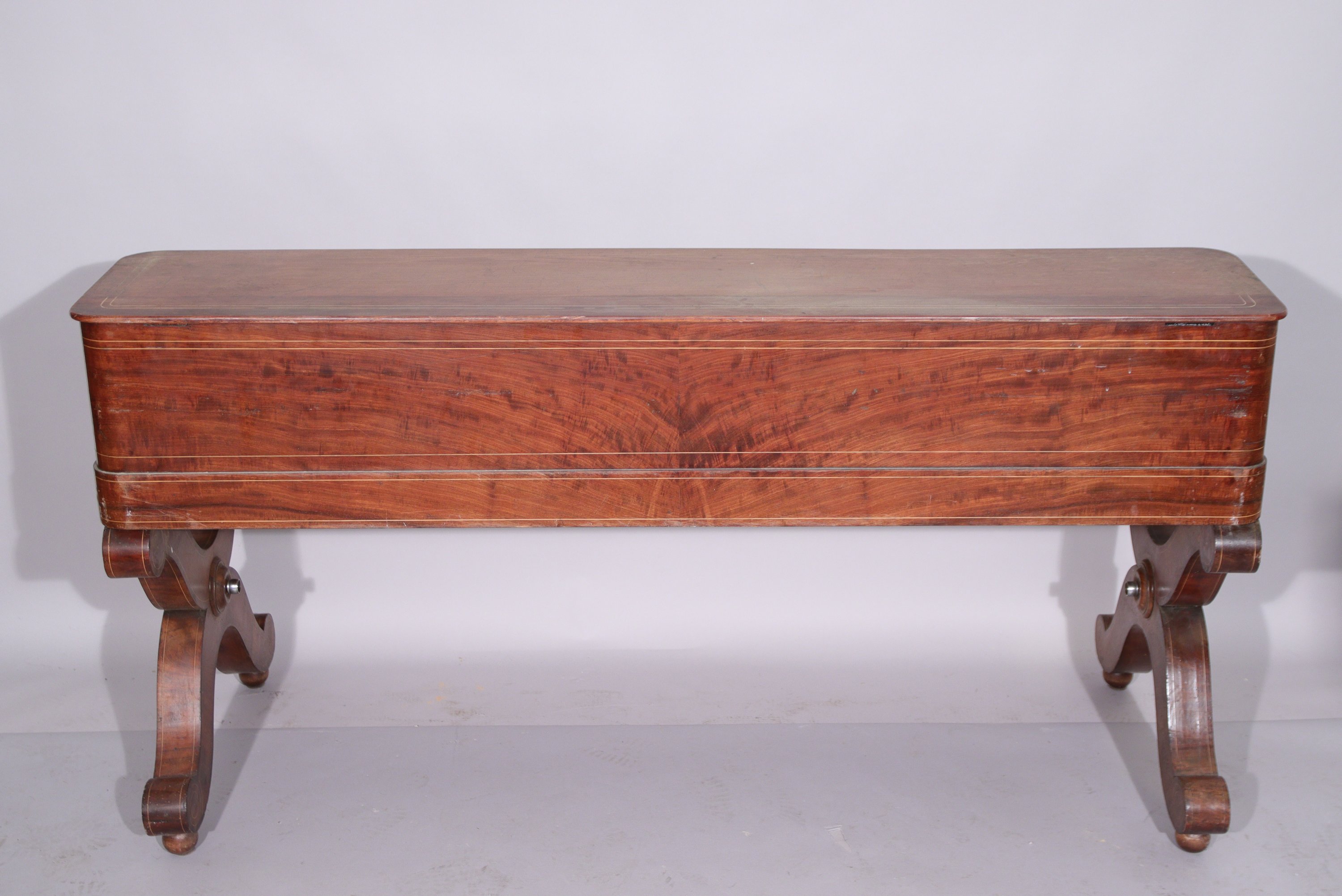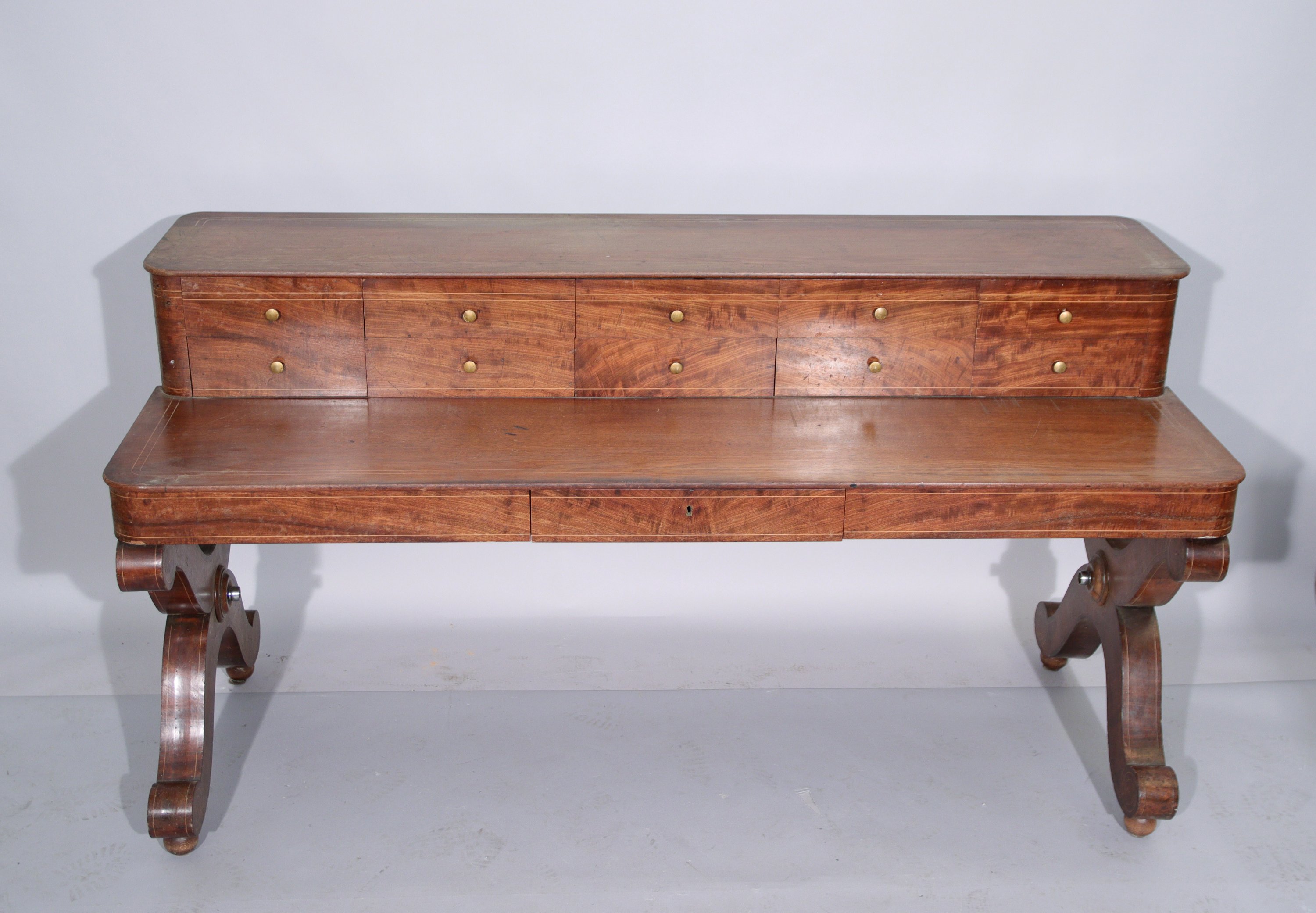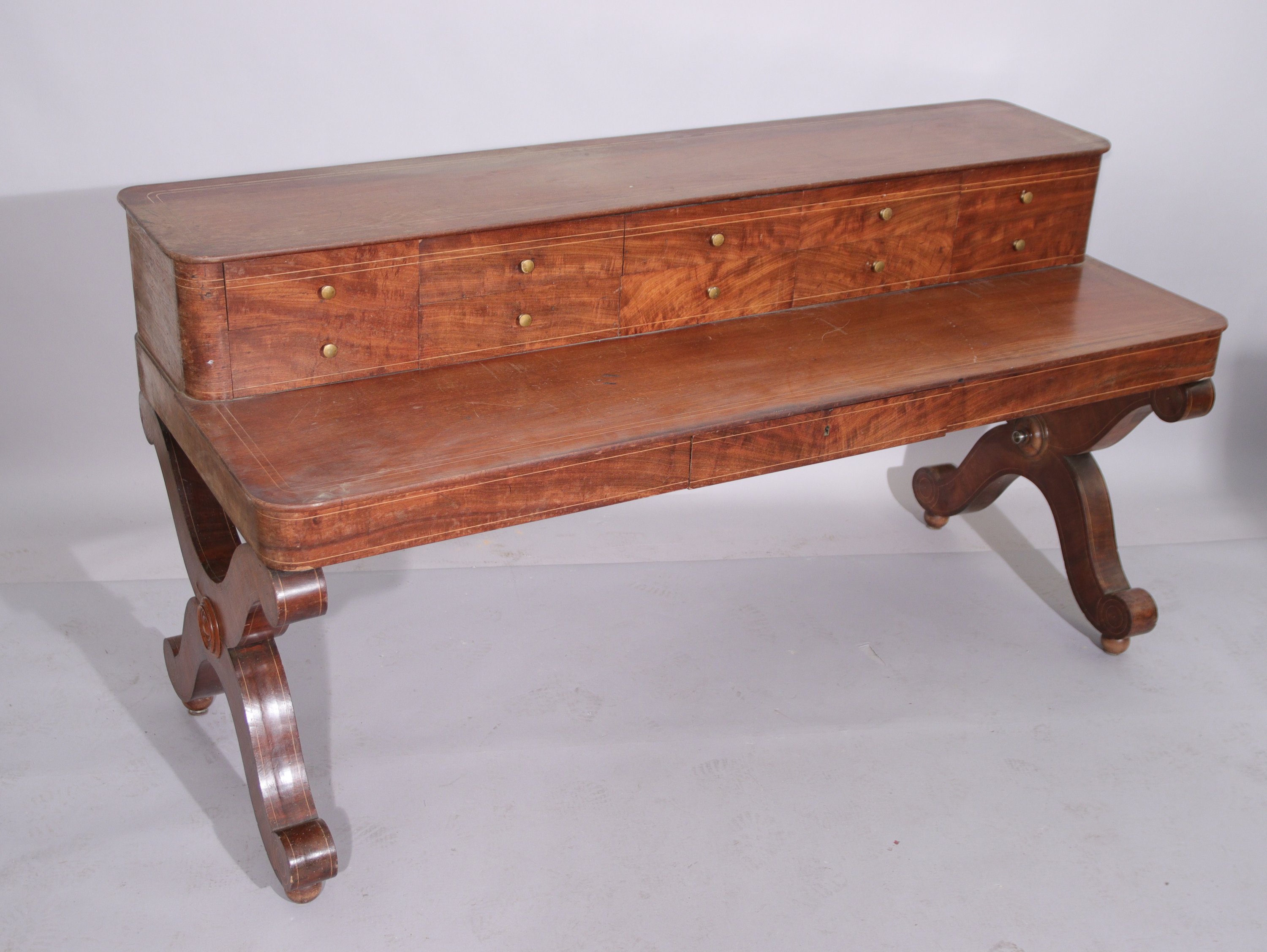 en placage orné de filets de bois clair. Son gradin ouvre par dix tiroirs composés en deux niveaux. Le plateau de forme rectangulaire présente des angles arrondis. La ceinture ouvre par un tiroir central. Piétement en X réunis par une barre métallique.