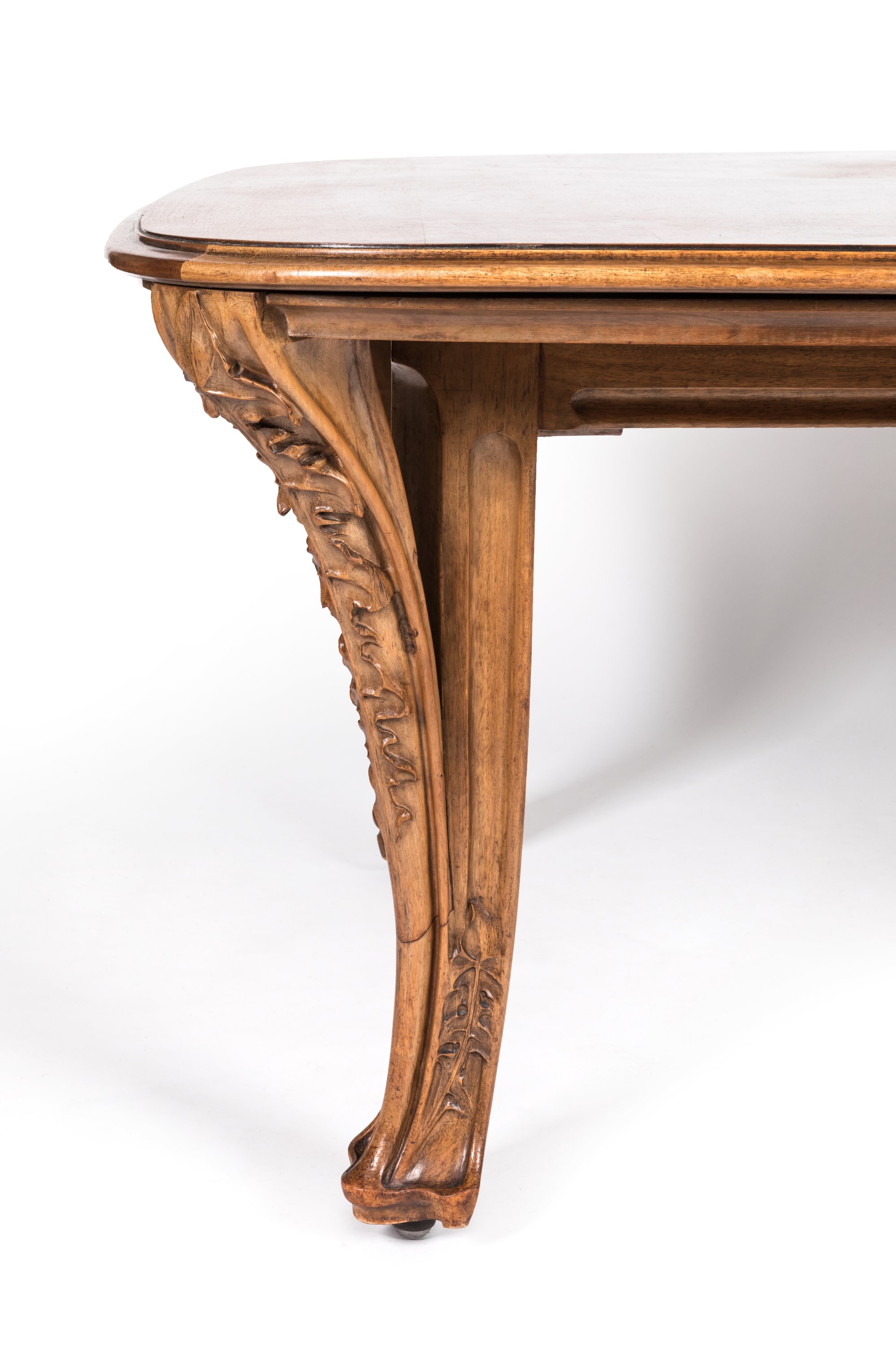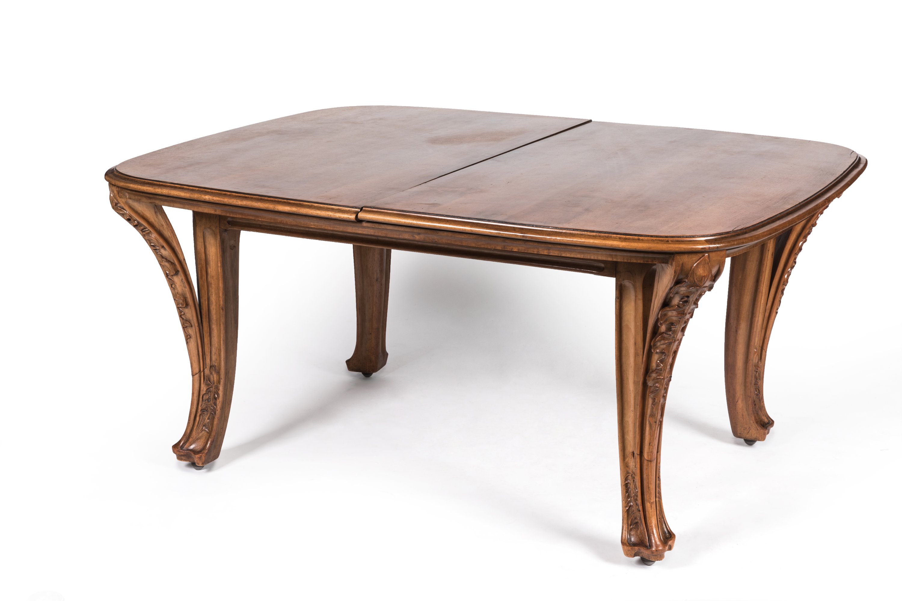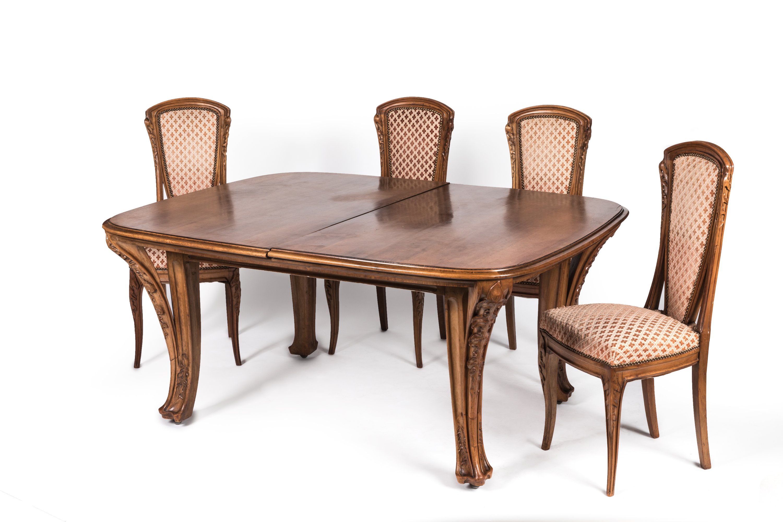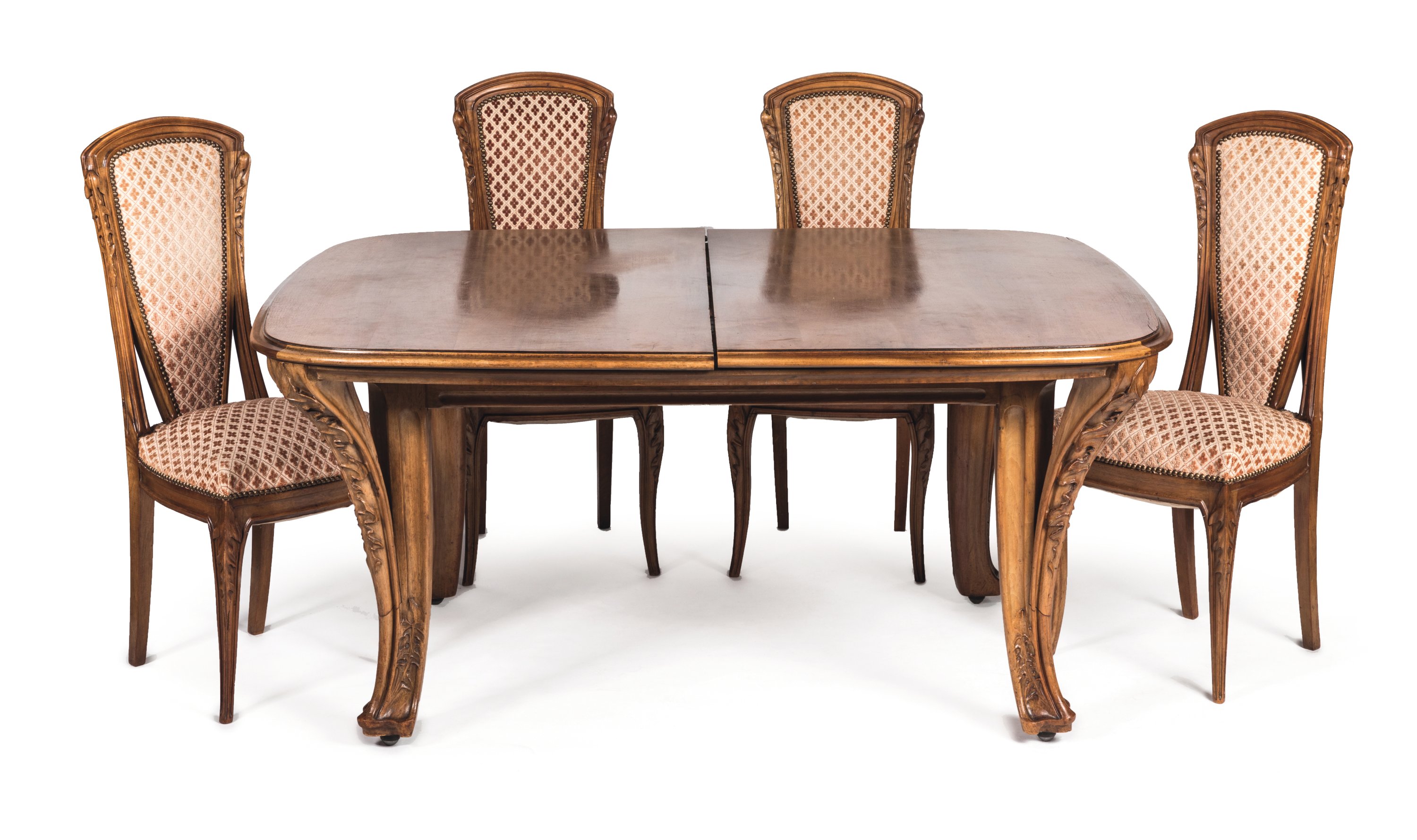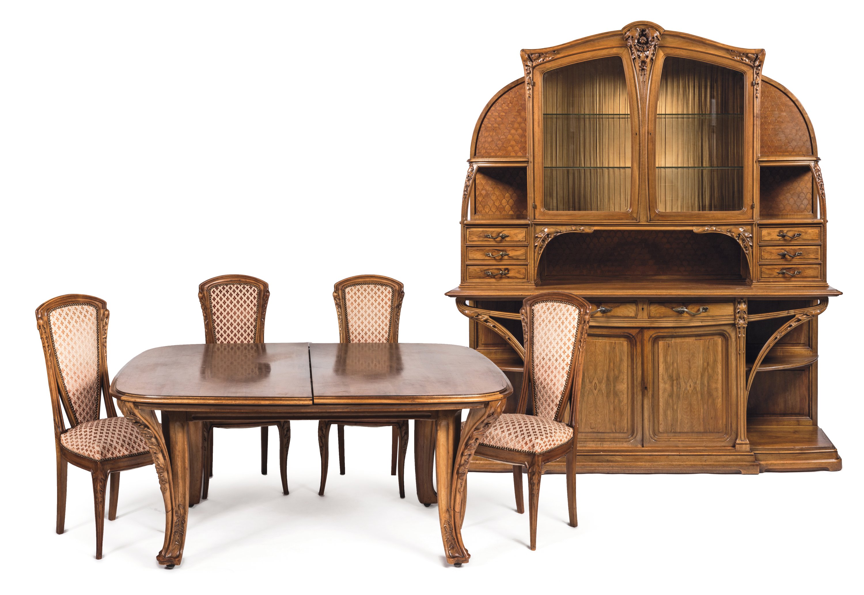 An Art nouveau carved walnut "Chicory" dining room set by Louis Majorelle comprising a dresser, a sideboard, a table, and eight chairs. Ca. 1890-1900.