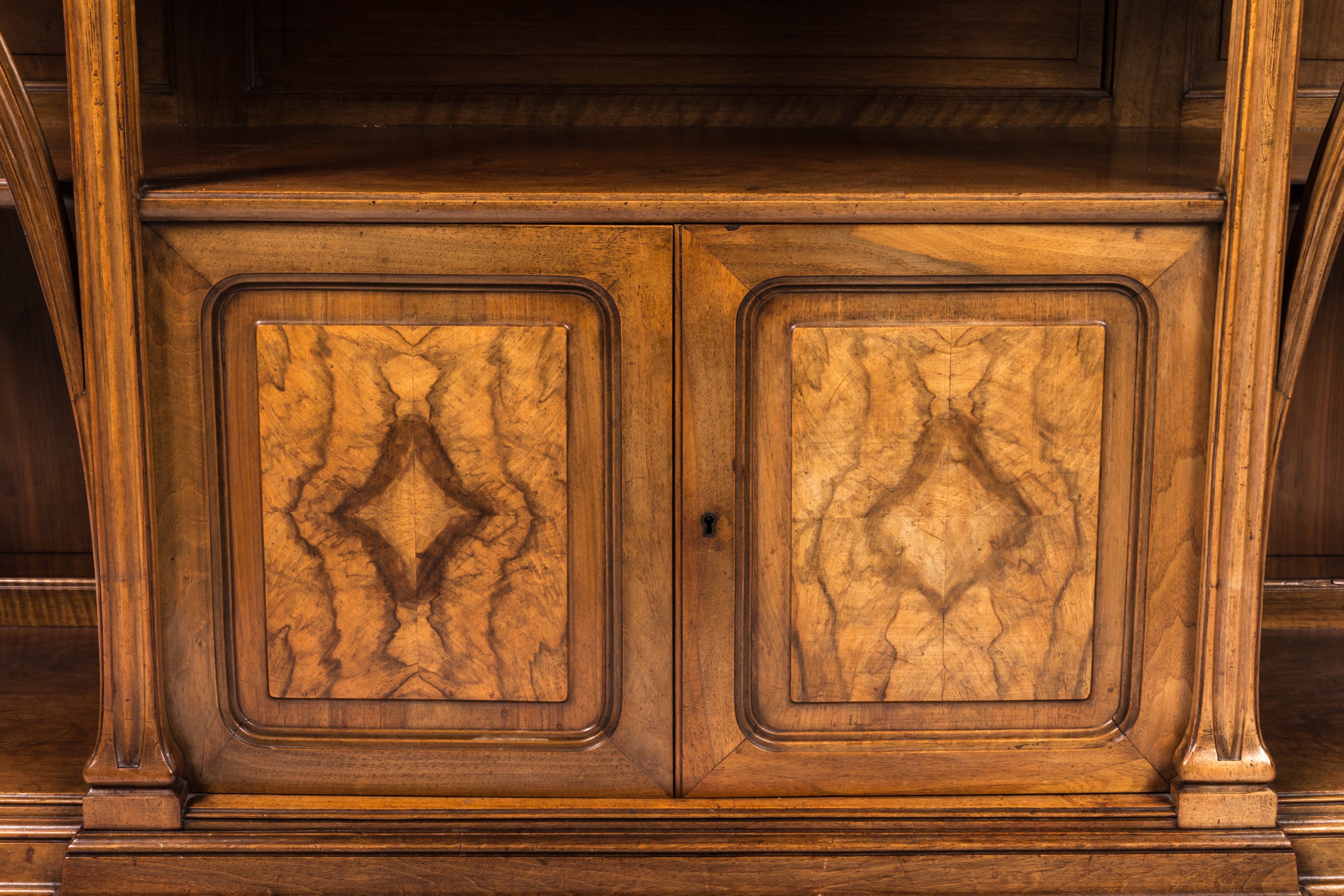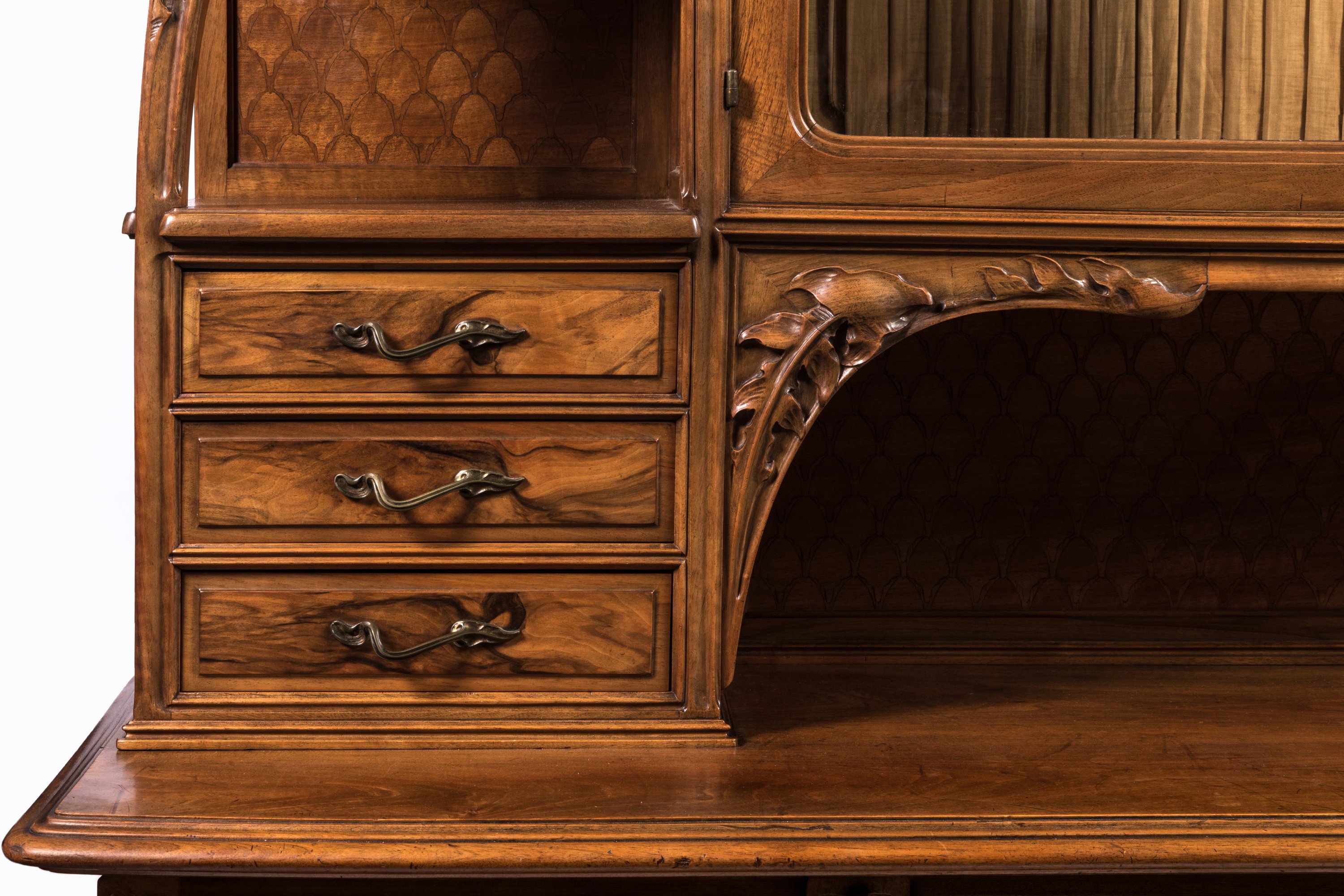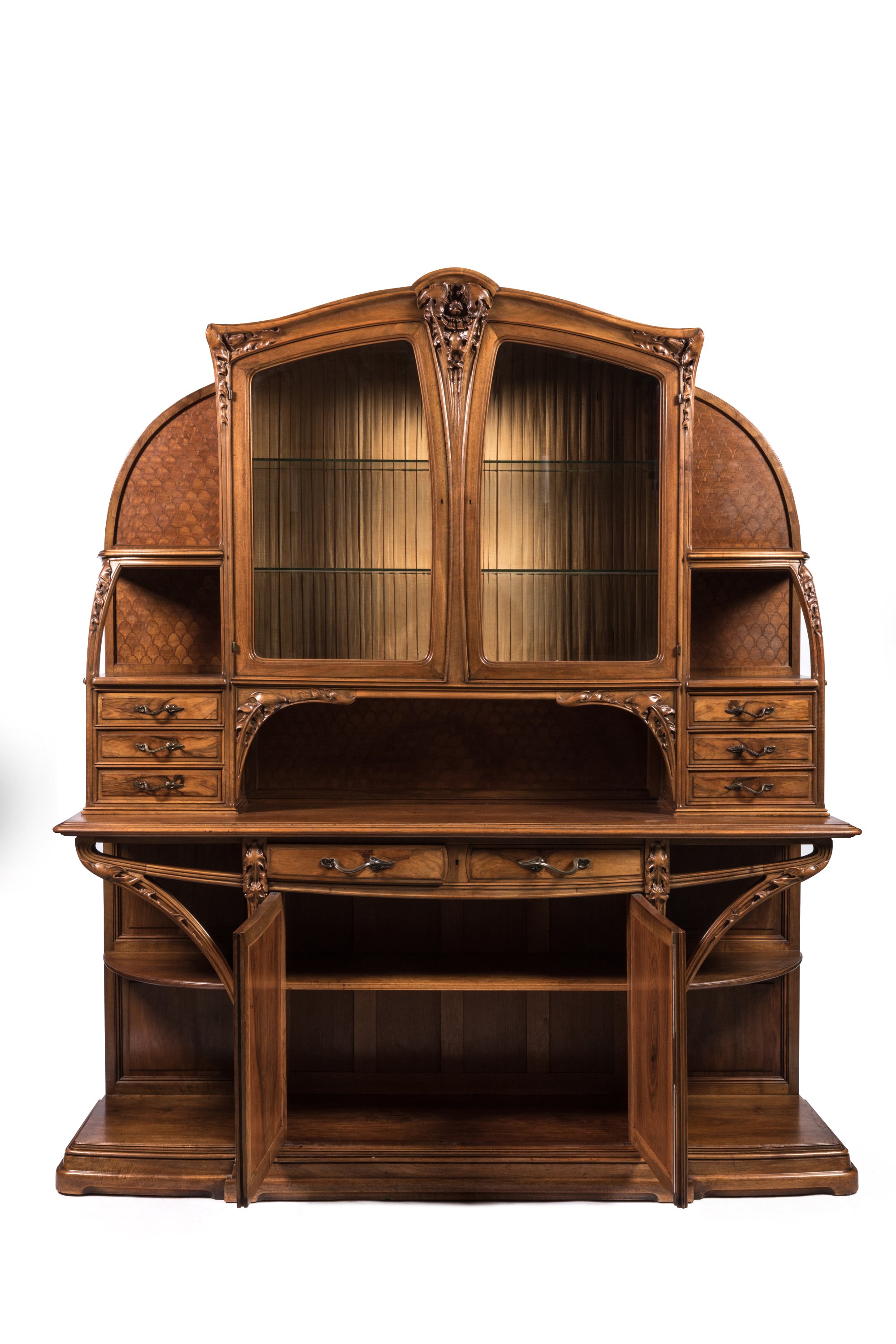 Le corps supérieur du buffet, en retrait de la partie basse, présente un caisson central soutenu par deux bras en console sculpté dun motif de feuilles de chicorée. Il ouvre par deux portes en verre biseauté. Les côtés présentent trois tiroirs et deux tablettes latérales de forme mouvementée. La partie basse ouvre par deux vantaux enrichis d'un médaillon central en placage de noyer. Les montants sont enrichis dune sculpture de feuille de chicorée. Les poignées de tirage en bronze suivent un modèle sinueux à motif de feuilles.