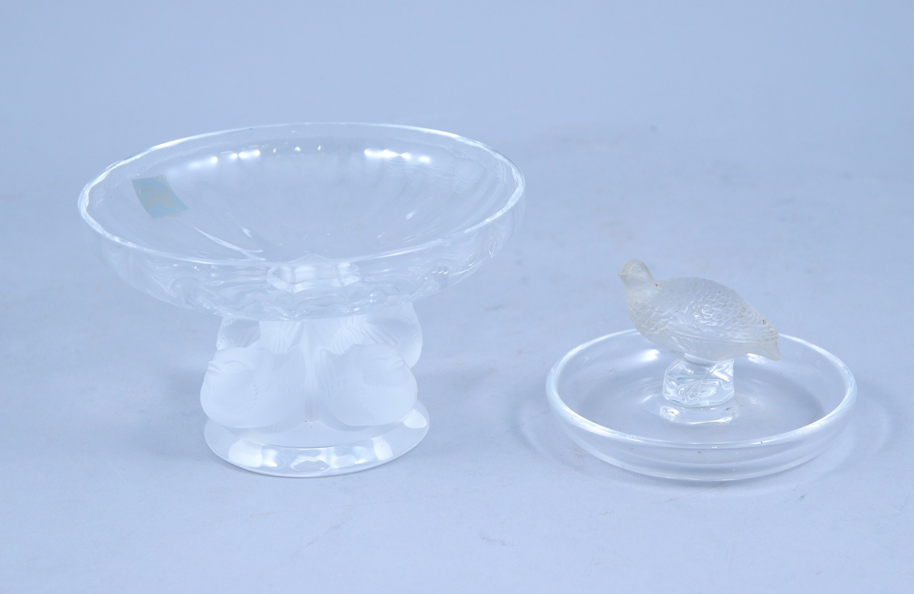 l'un sur pied à décor de moineaux, l'autre à prise en forme de caille.
