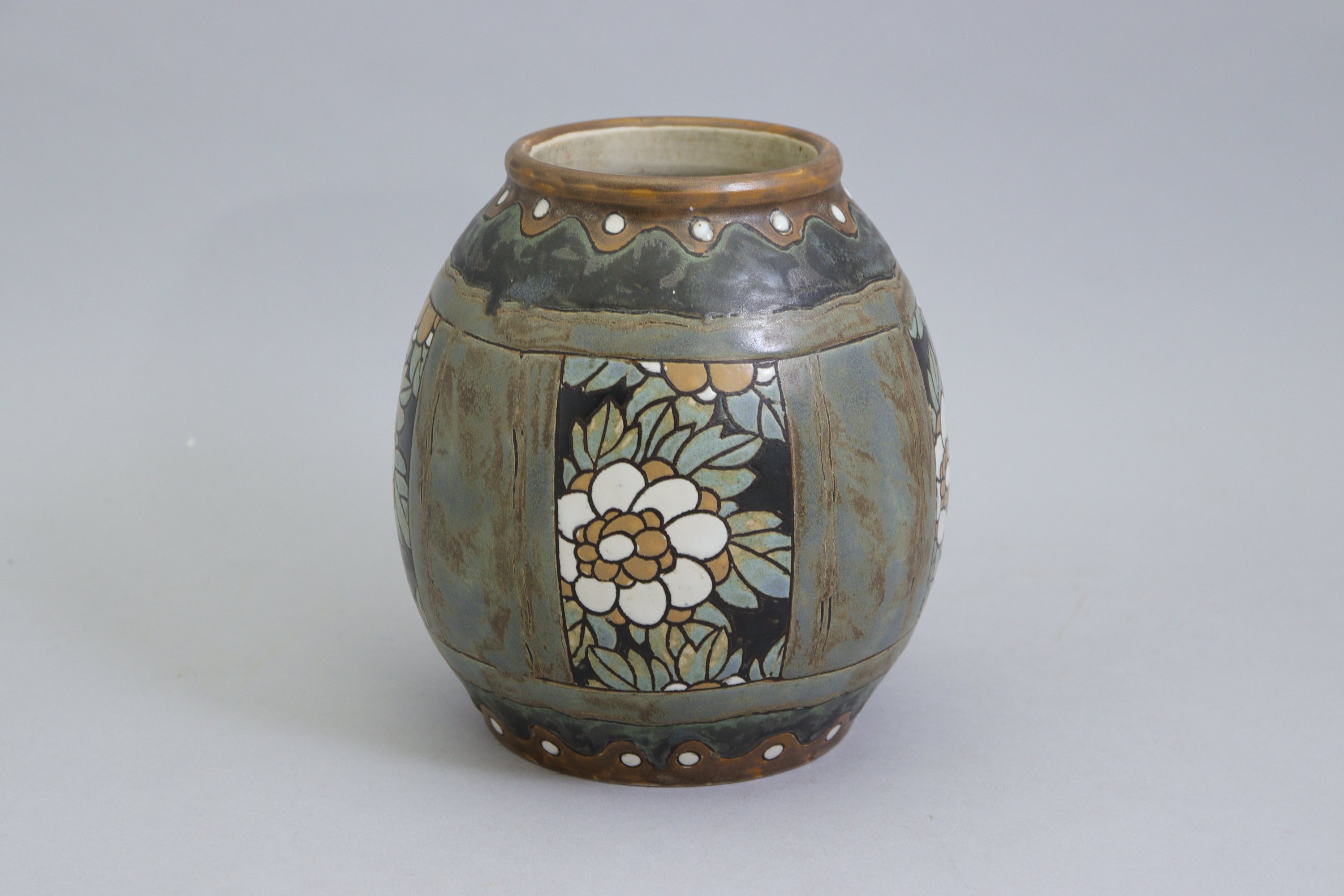 en grès à décor émaillé de fleurs dans des cartouches. Le col et le pied présentent une frise de perles dans des vaguelettes.