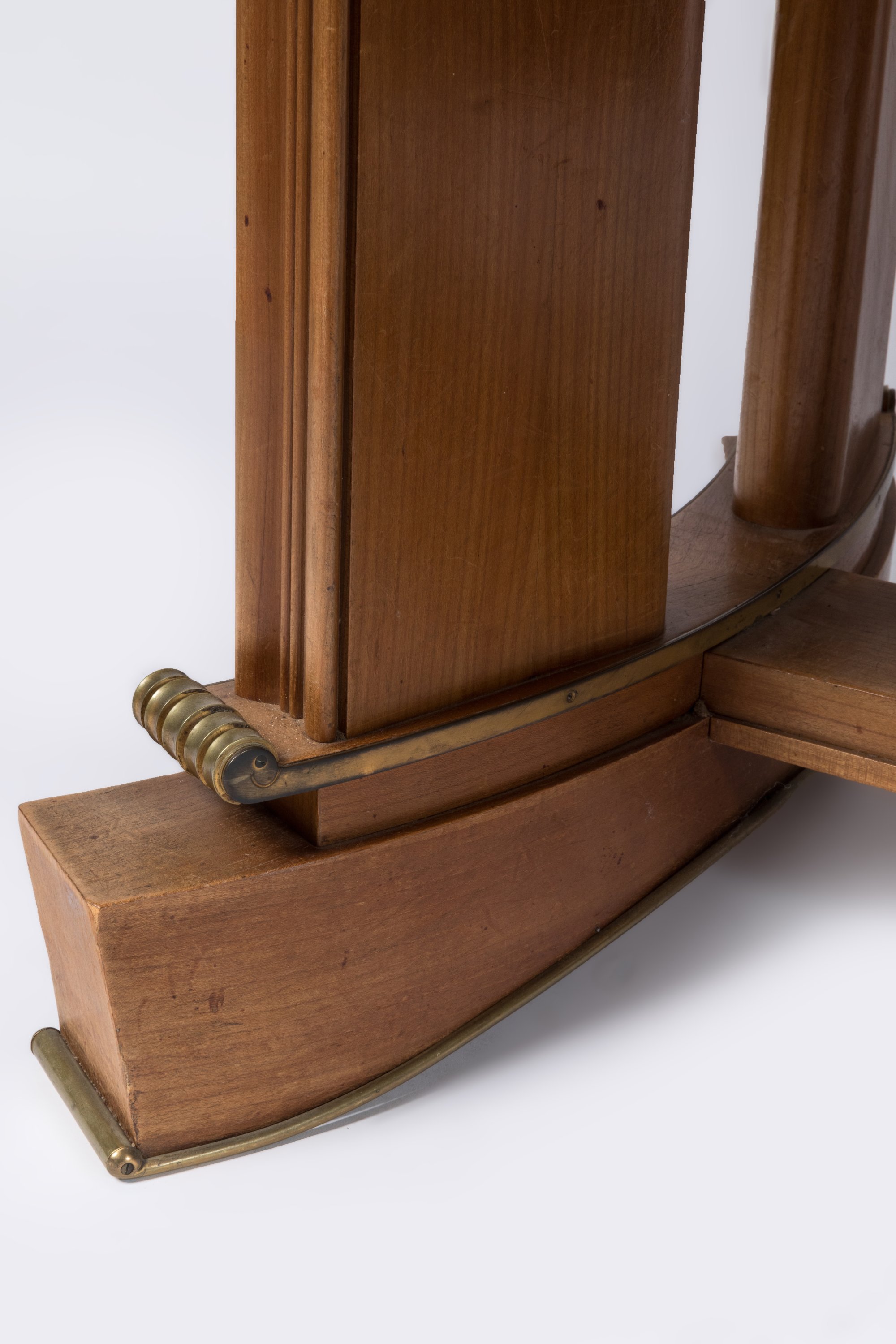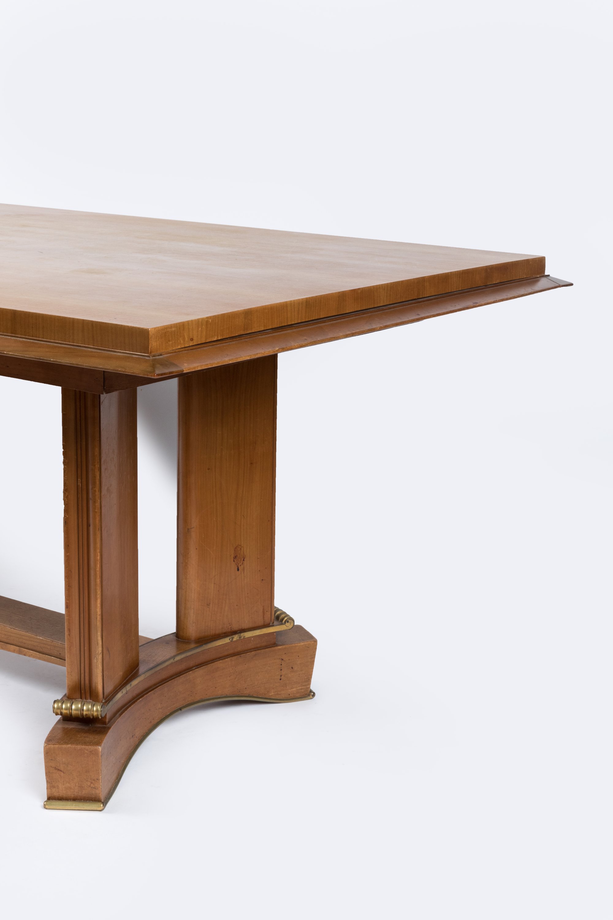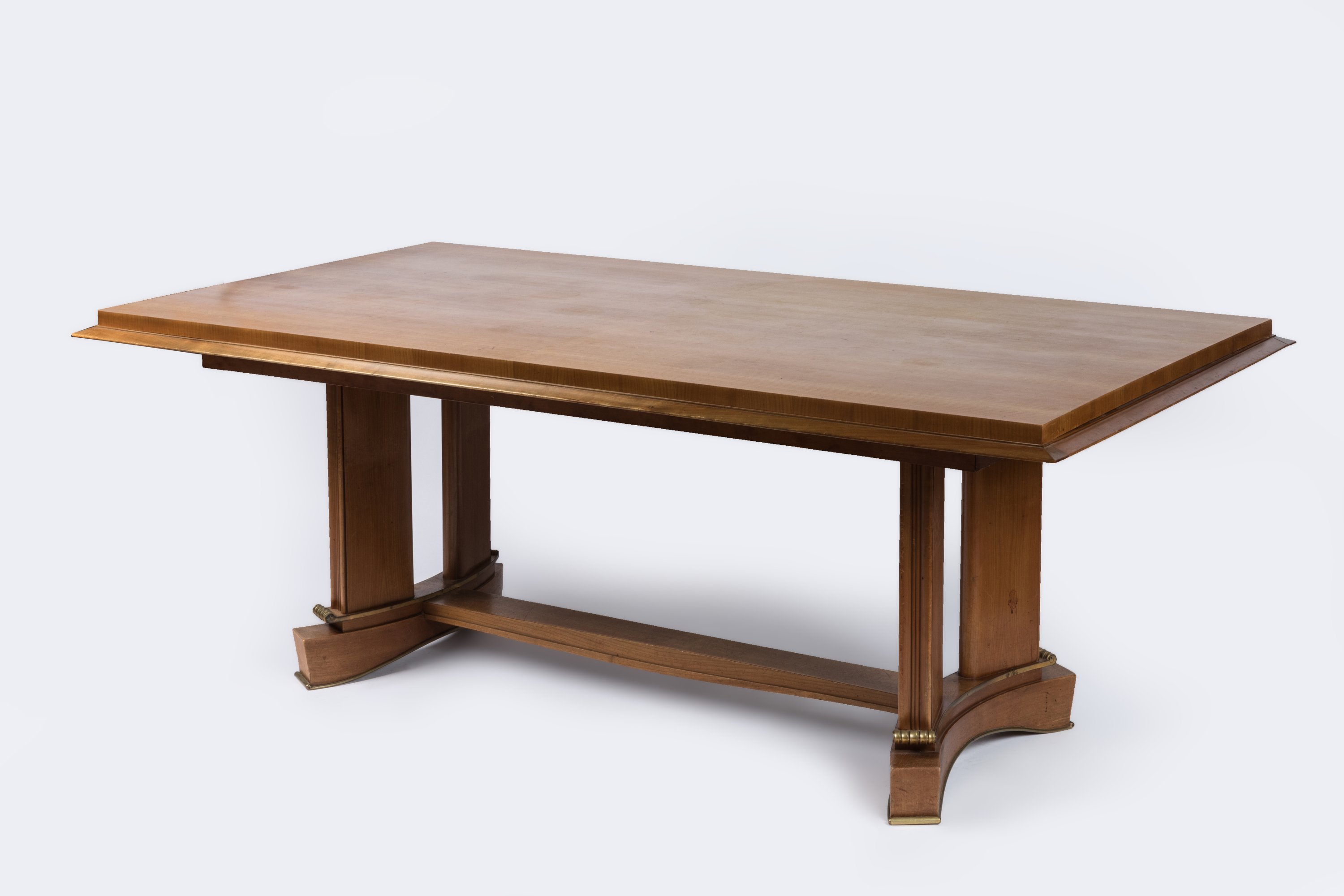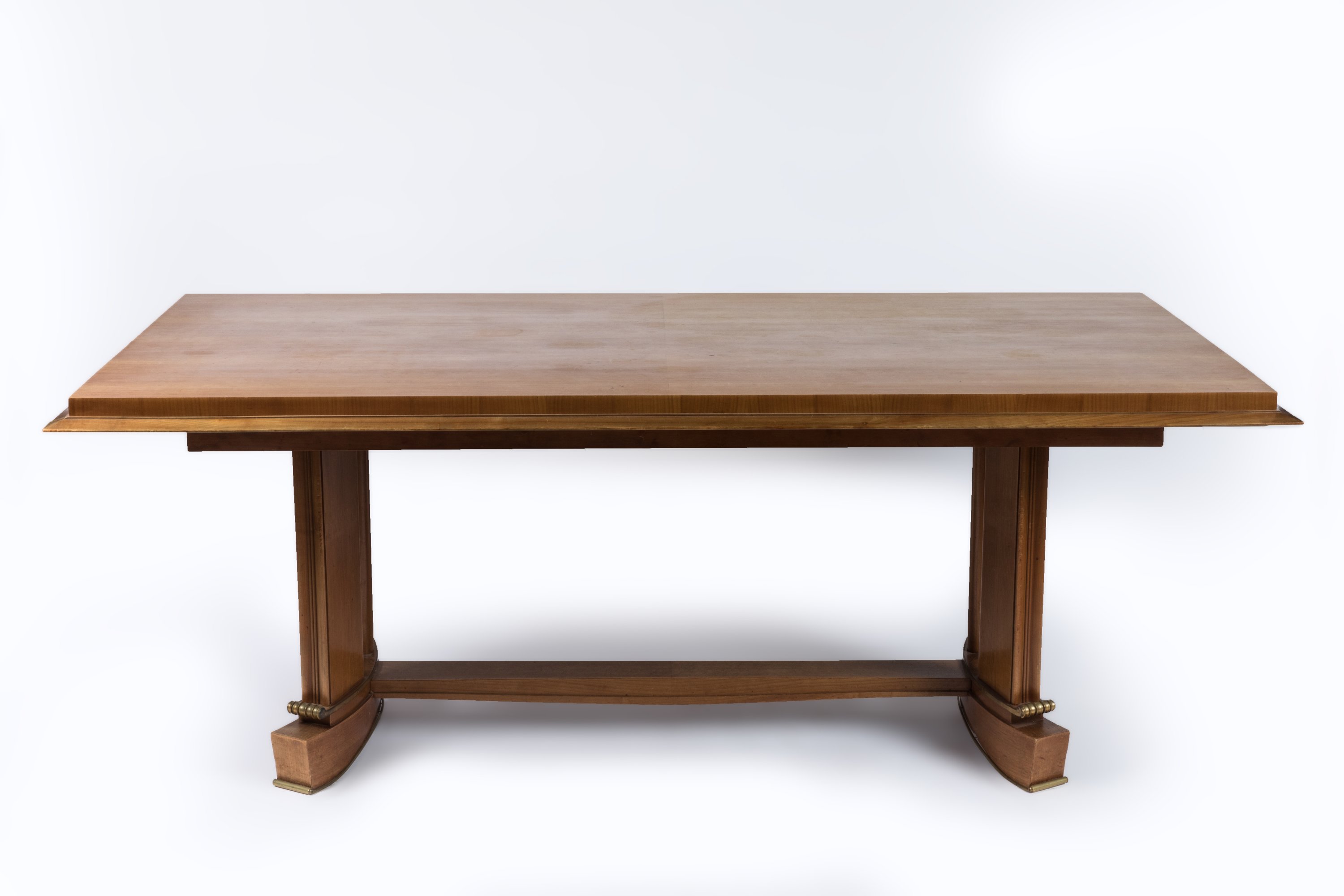 La table rectangulaire, à deux allonges latérales, repose sur deux pieds en patins réunis par une entretoise en H décorée de laiton doré.