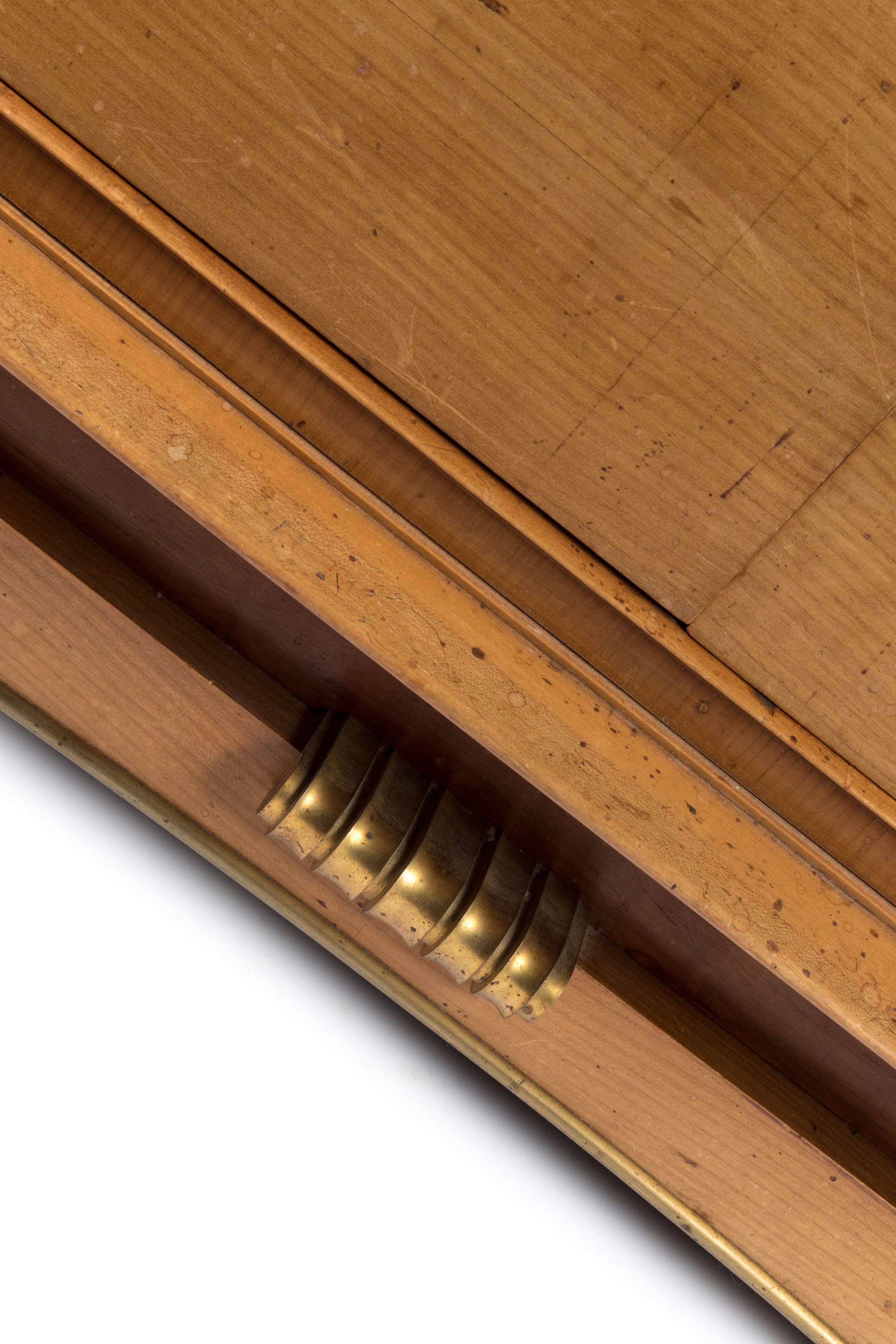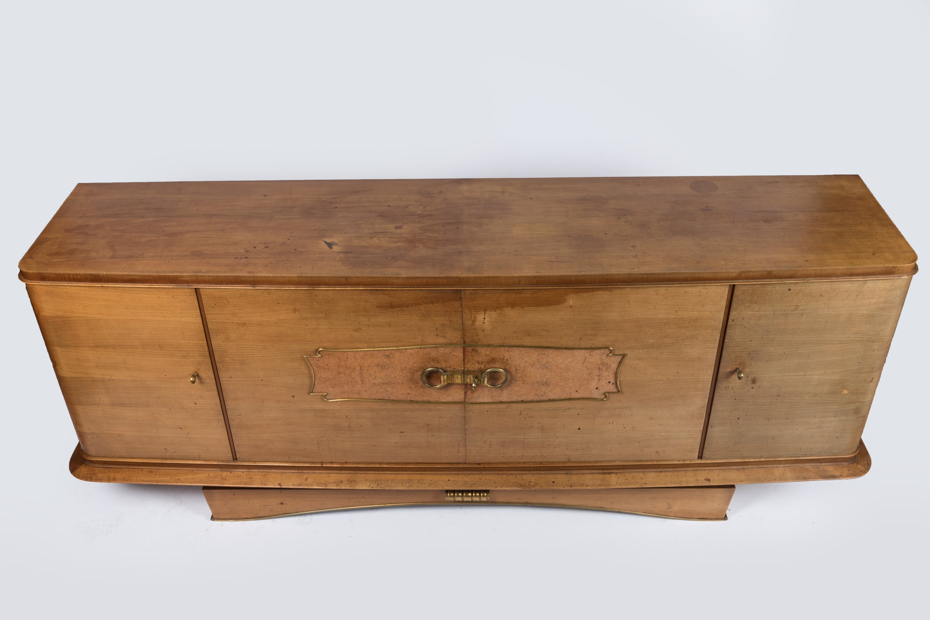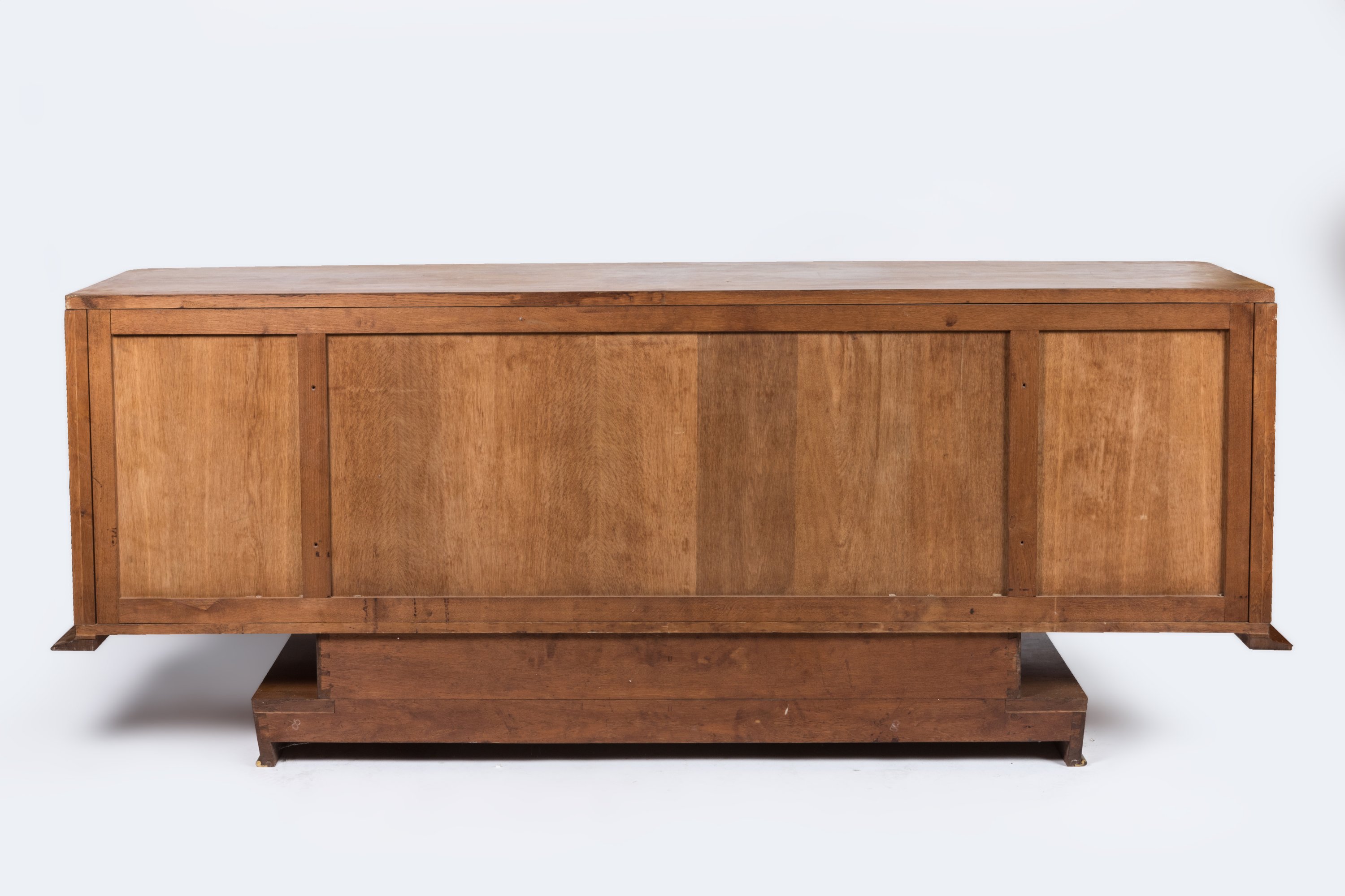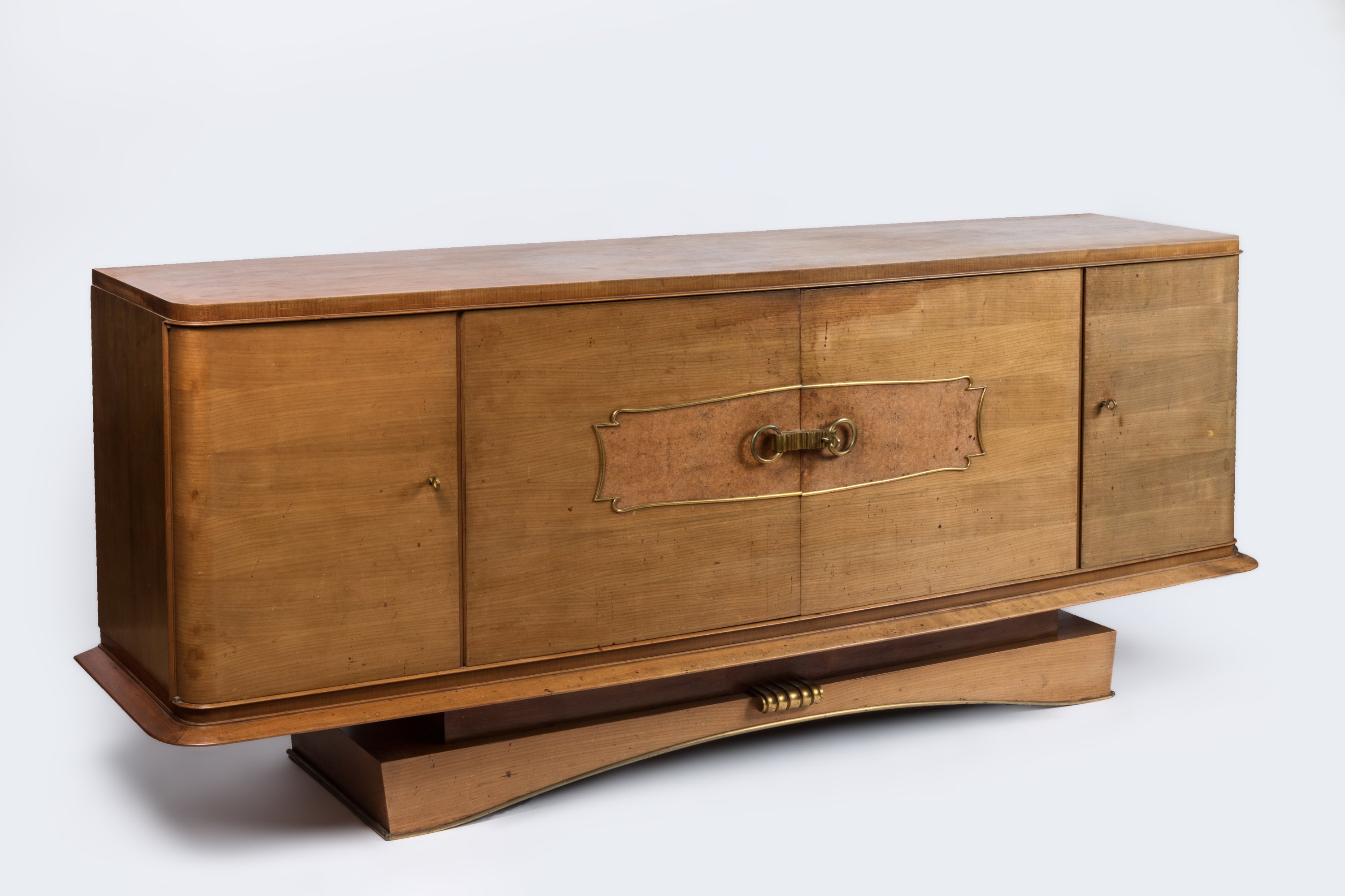Le buffet, en enfilade très légèrement galbée et aux angles supérieurs arrondis, ouvre en façade par deux vantaux entourés de deux portes latérales dévoilant trois niveaux d'étagères sur les côtés et deux niveaux d'étagères et trois tiroirs en partie centrale. Il ferme par une importante serrure crénelée, à deux anneaux en laiton doré, entourée d'une plaque de loupe ornementale. Une corniche surplombe le piétement mouvementé décoré d'un motif de laiton doré en volute.