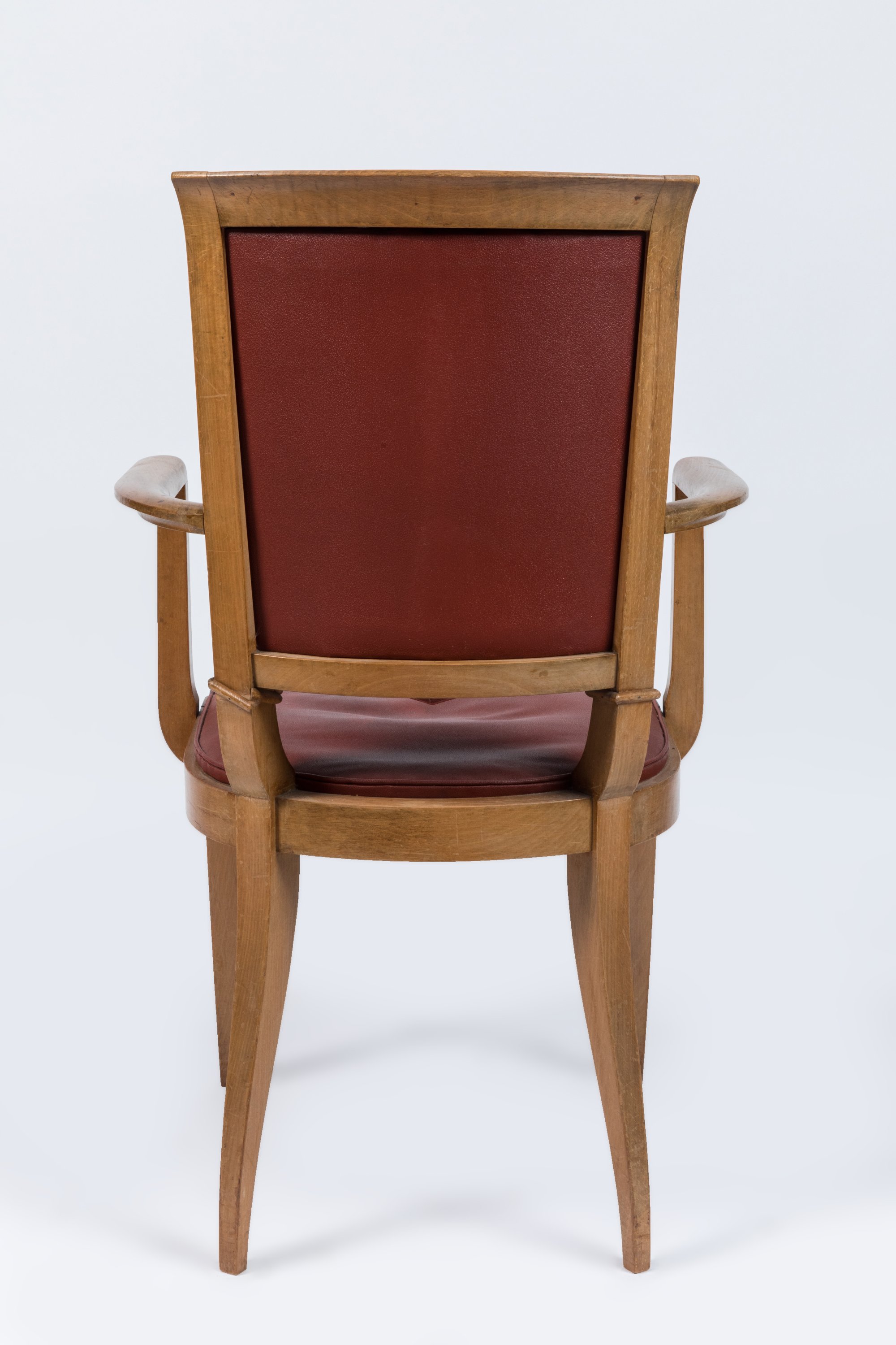 Les six chaises et les deux fauteuils à dossier cabriolet reposent sur des pieds en gaine fuselés, garnis de cuir bordeaux.