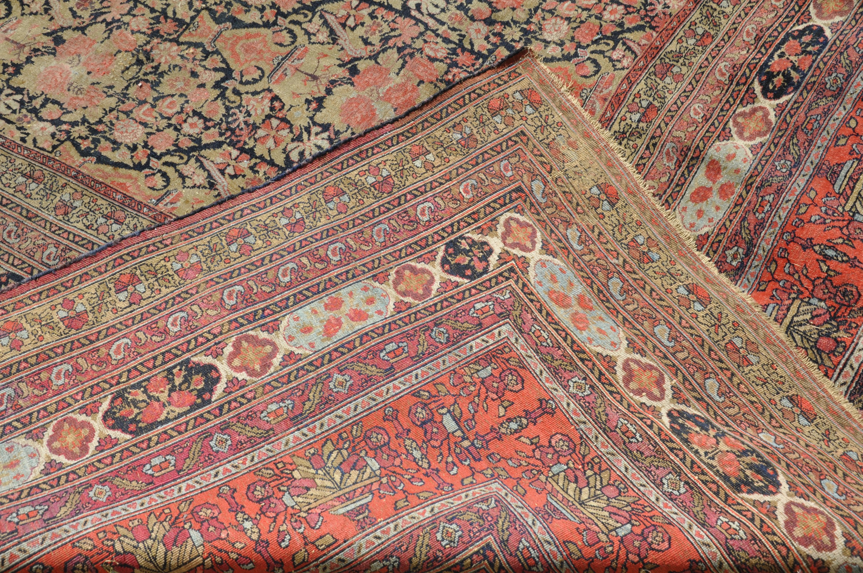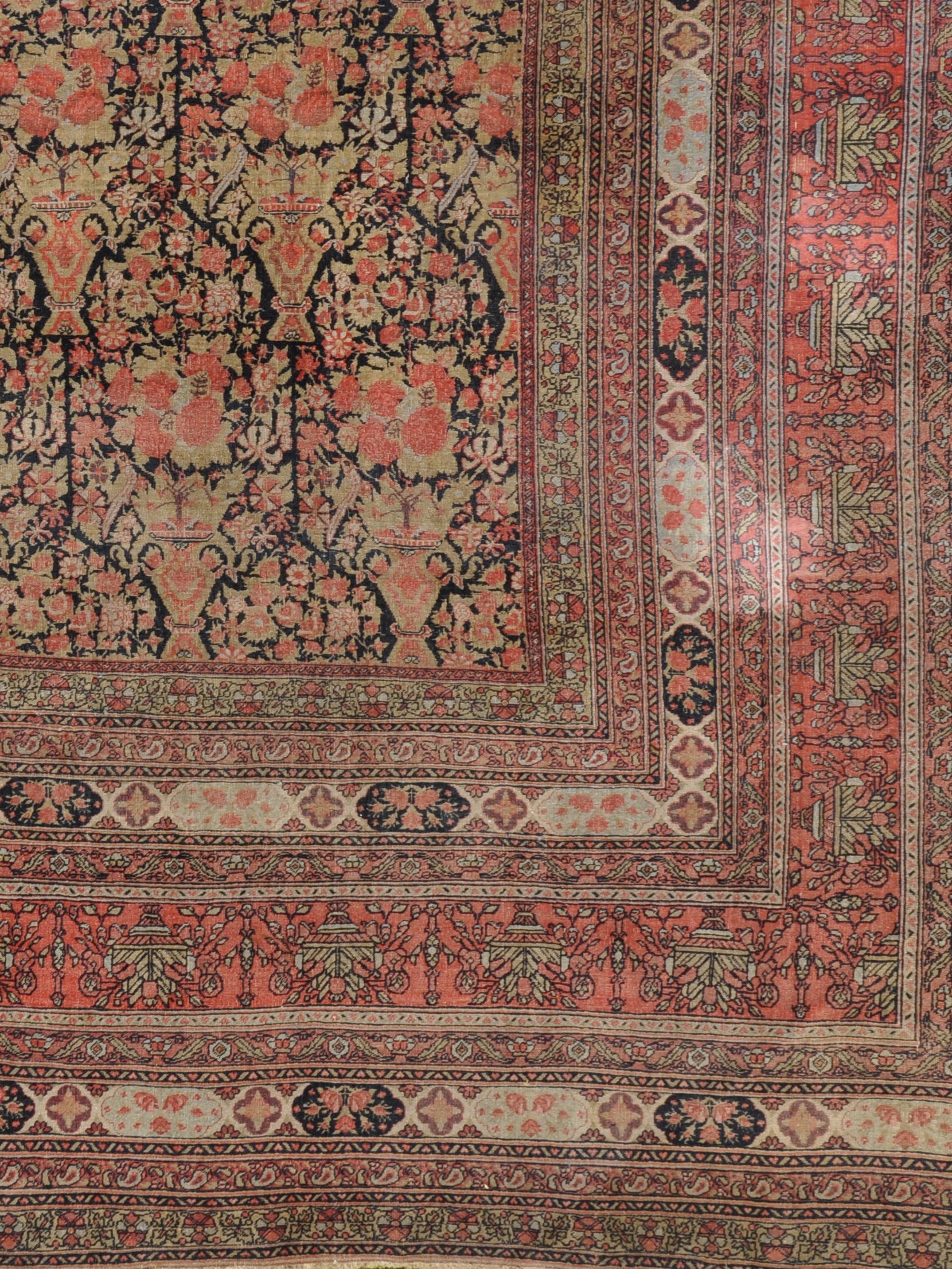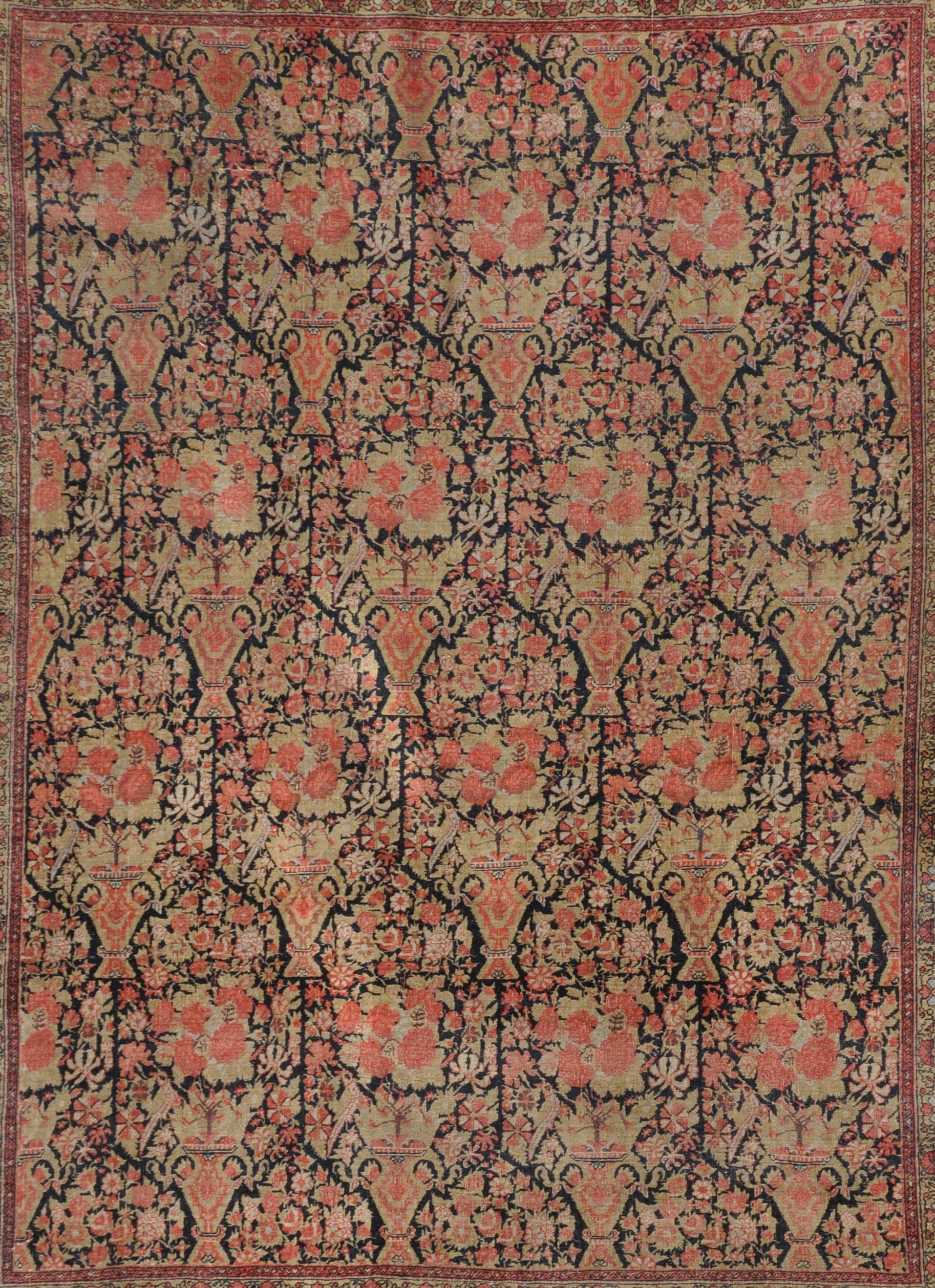 en laine à fond noir orné de vases fleuris de roses. Le champ présente de nombreuses frises florales à fond rouge, vert et crème. Fleurs de Karabakh, Azerbaïdjan.