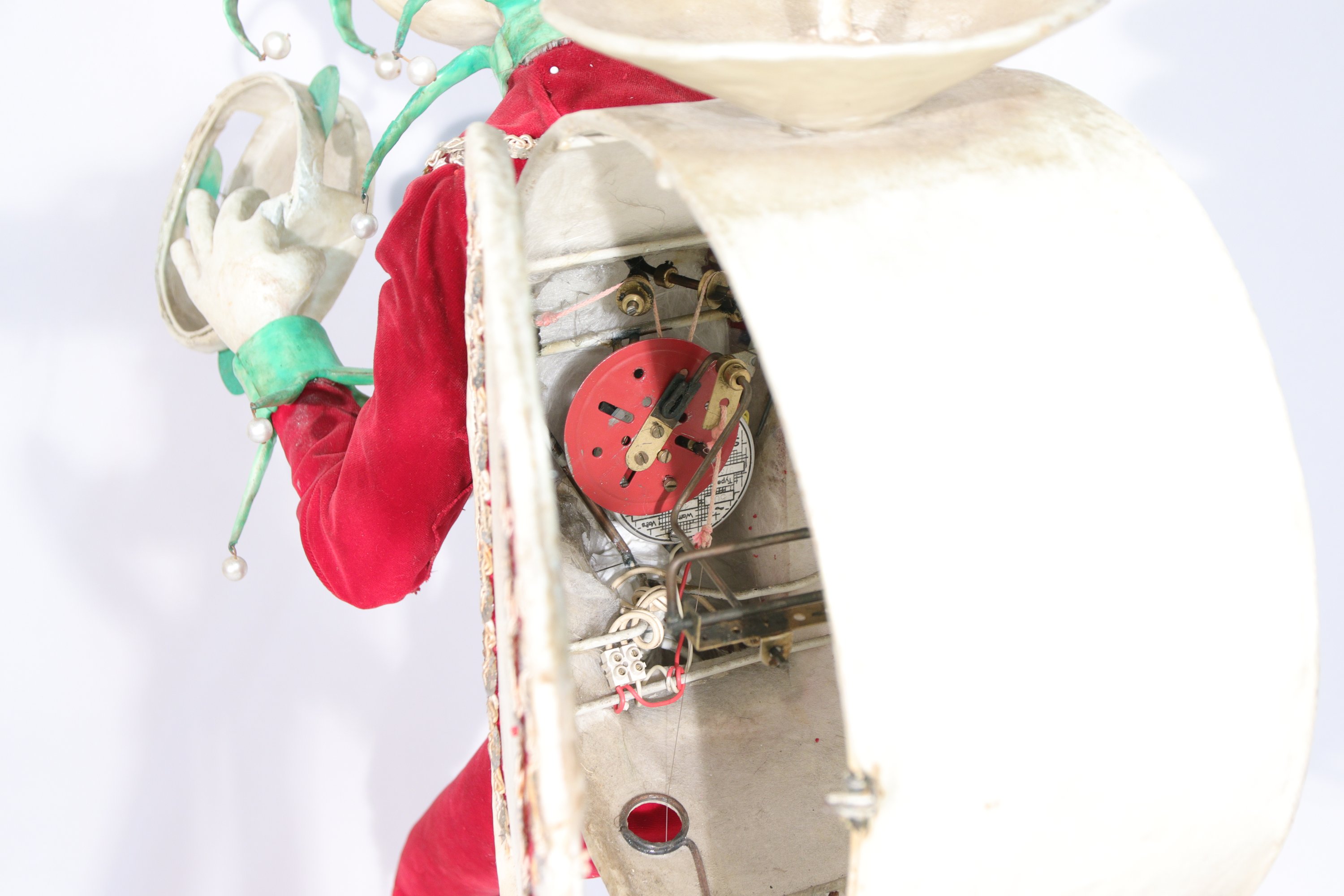 en fibre de verre recouverte de velours cramoisi. Habillé d'un bonnet, de bracelets et de chausses vertes à grelots, il joue du tambourin, tape du pied gauche, bat un tambour accroché dans son dos et active des cymbales. Animé par un moteur 220 volts SAPMI.