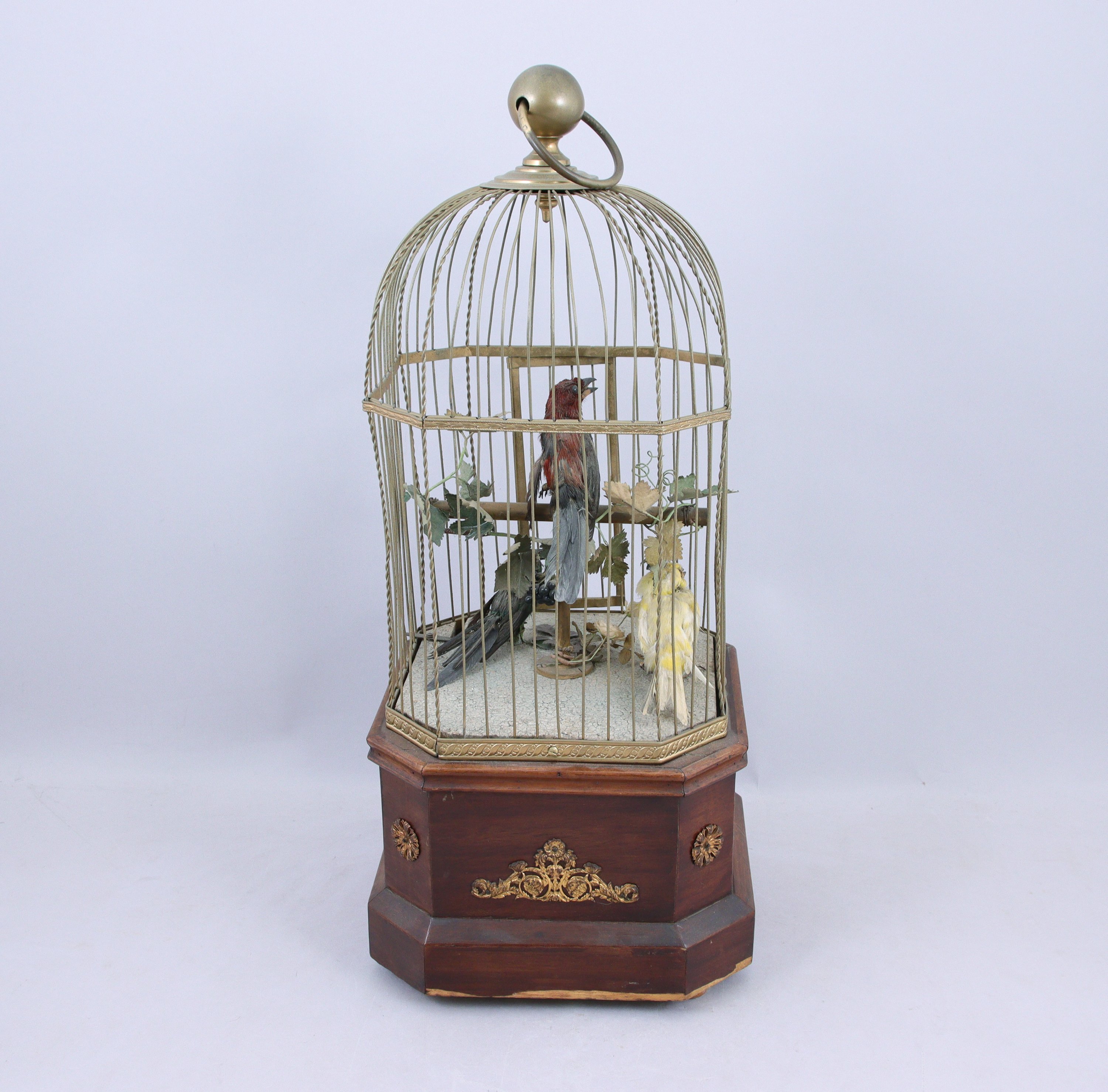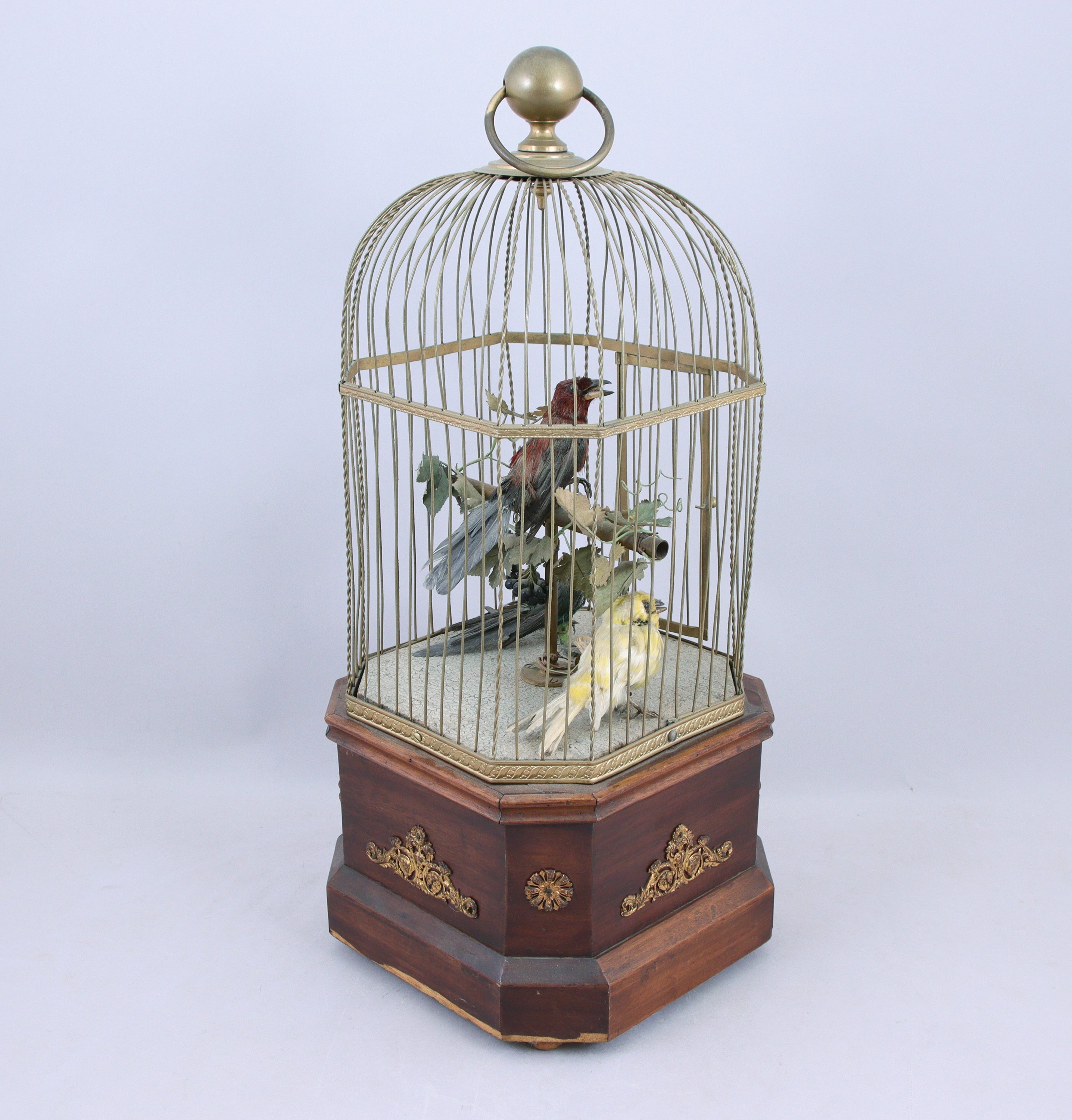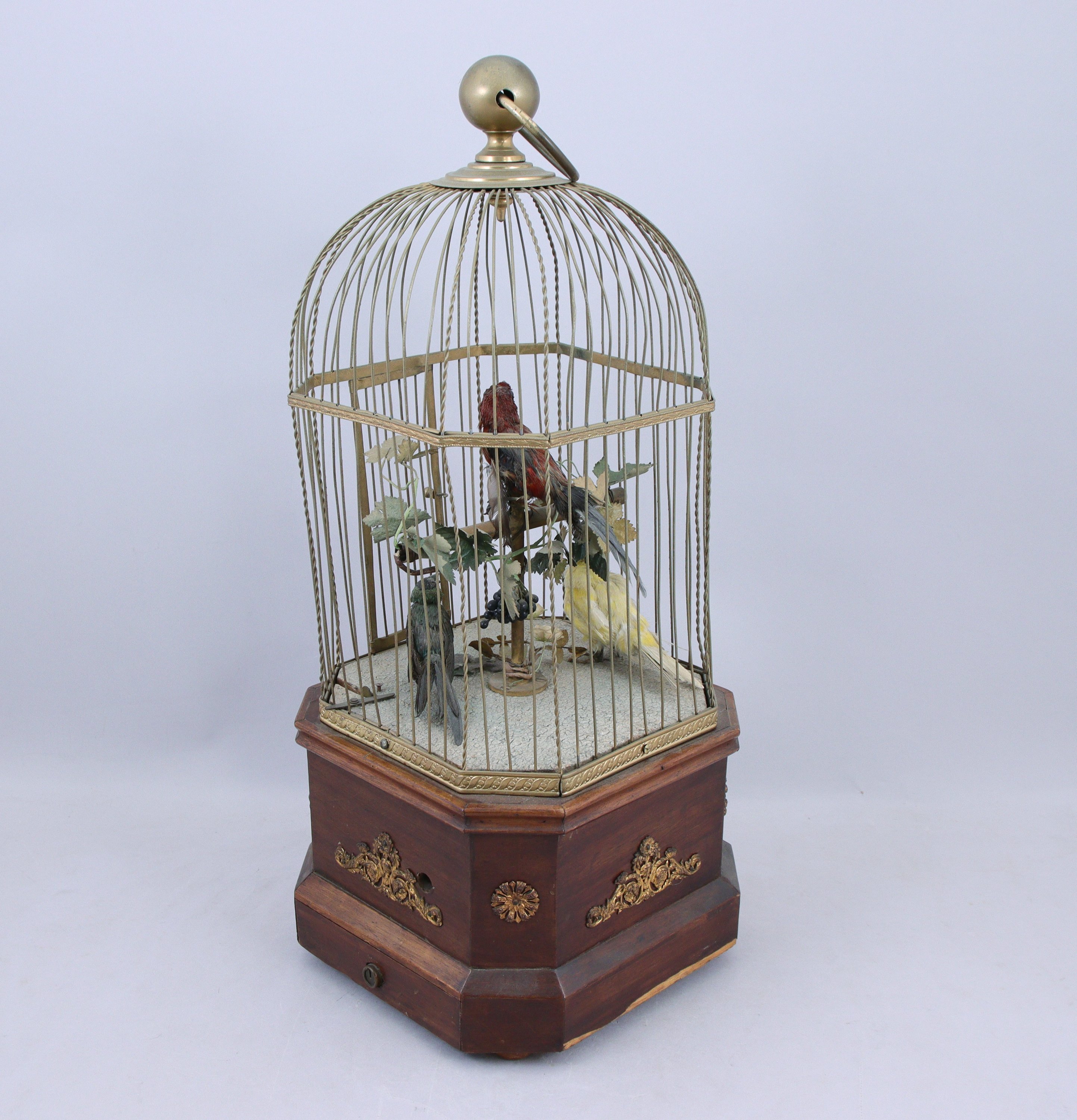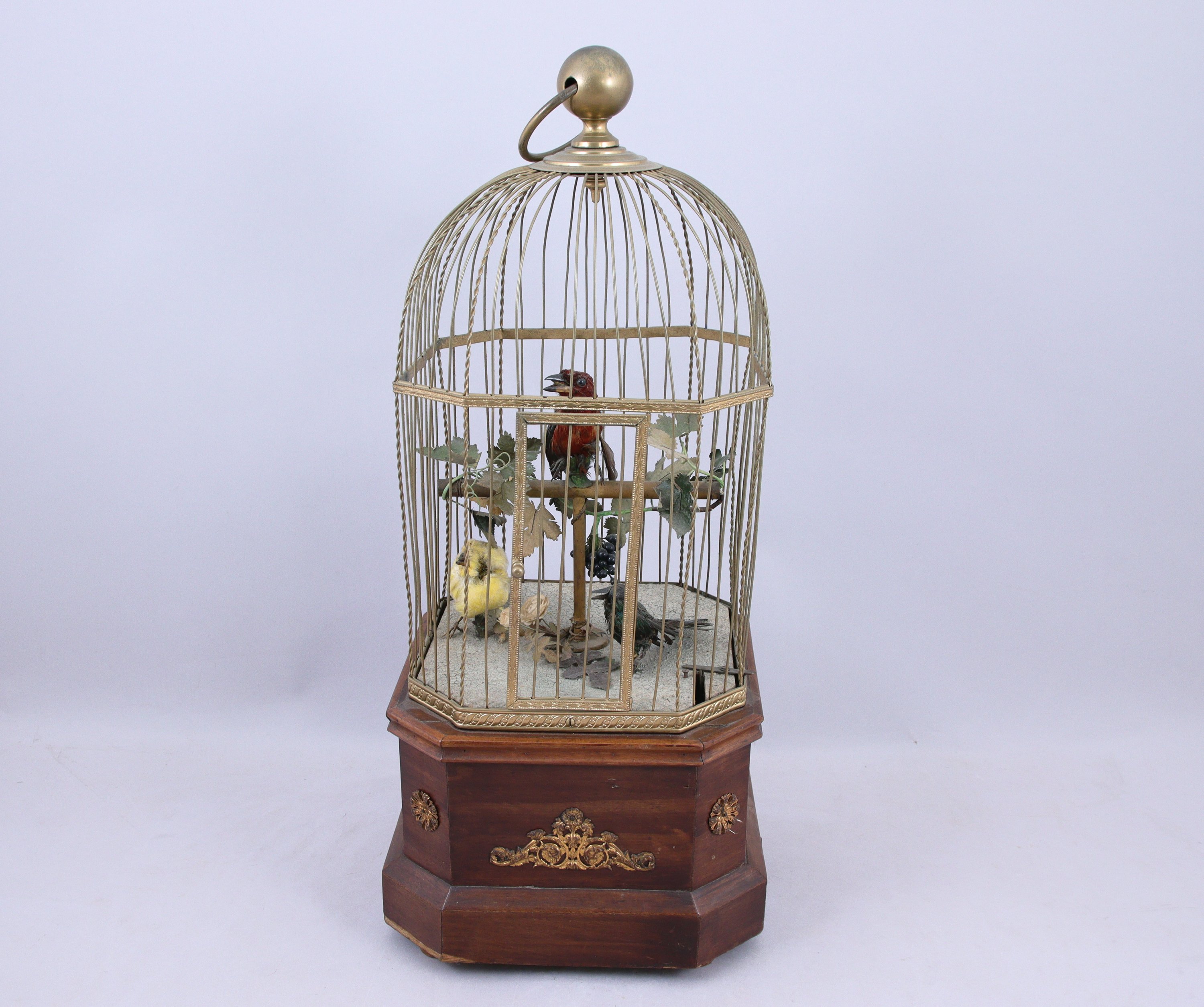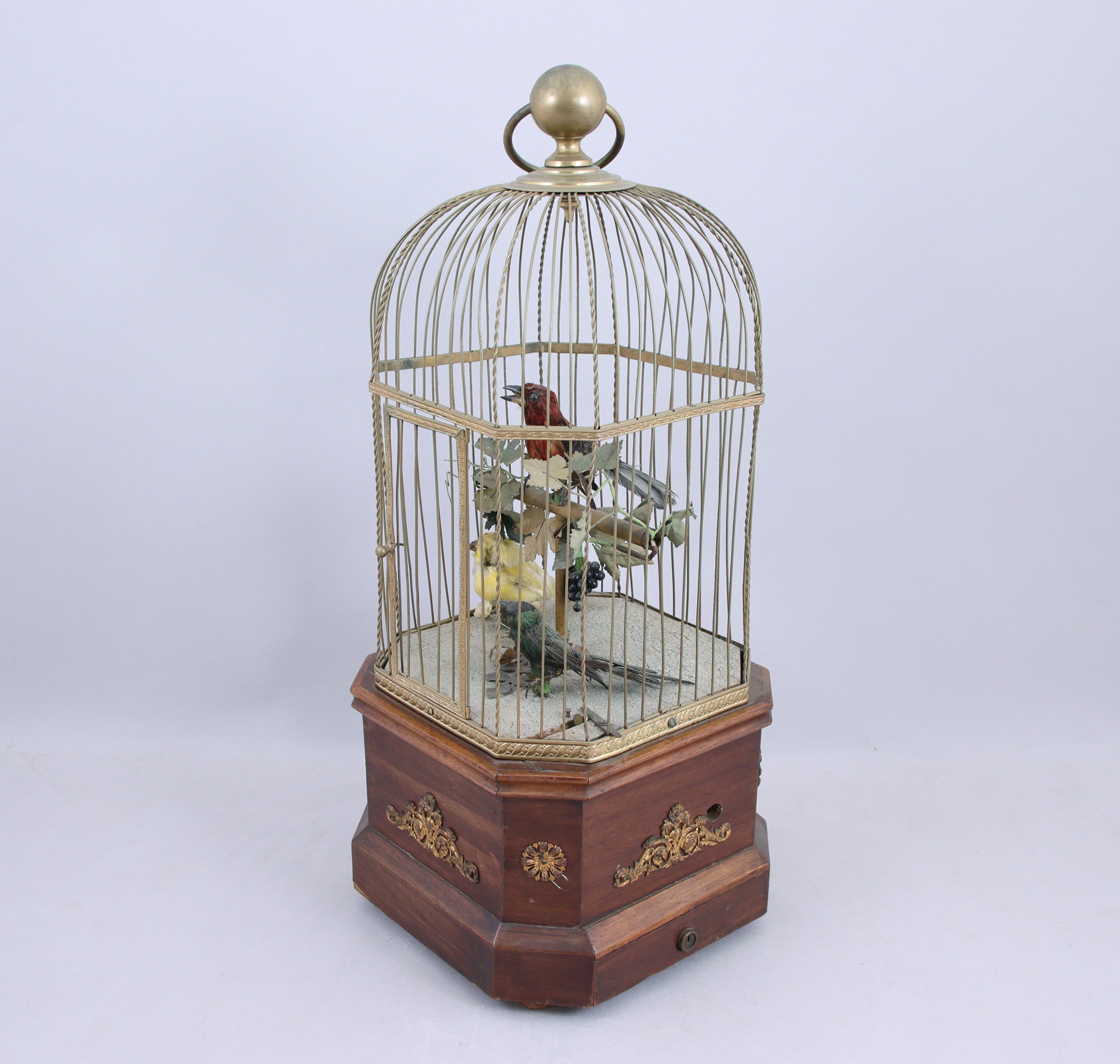 en métal doré et base en noyer et placage. Surmontée d'un anneau de suspension, elle ouvre en façade par une porte donnant accès à trois oiseaux naturalisés chantant et s'actionnant, dont un se tenant sur un perchoir décoré de pampres de vigne. La partie inférieure octogonale est enrichie d'appliques en métal doré sur chaque face. Remontoir du mécanisme à la base et tirette de fonctionnement en bas de la cage.
