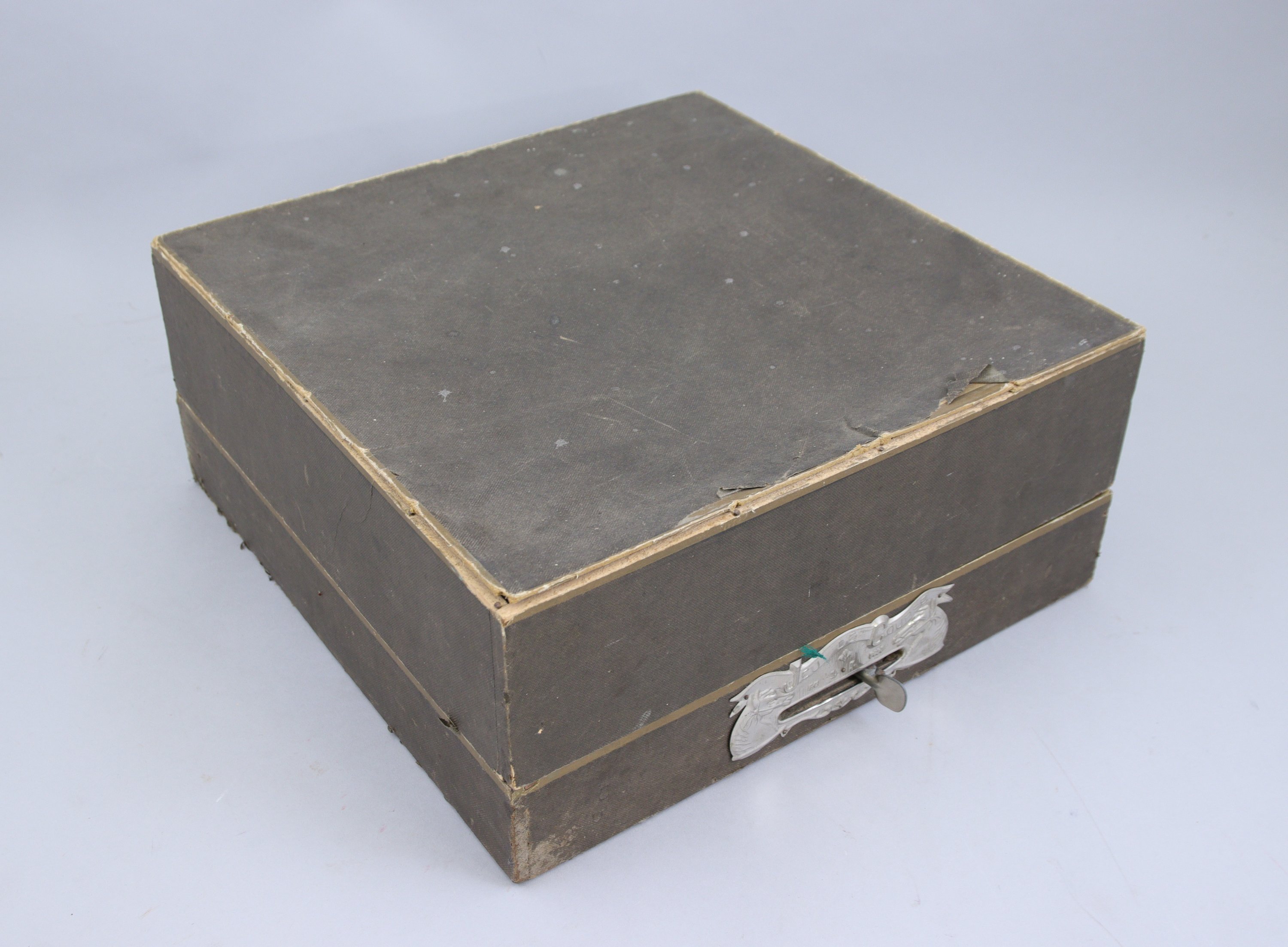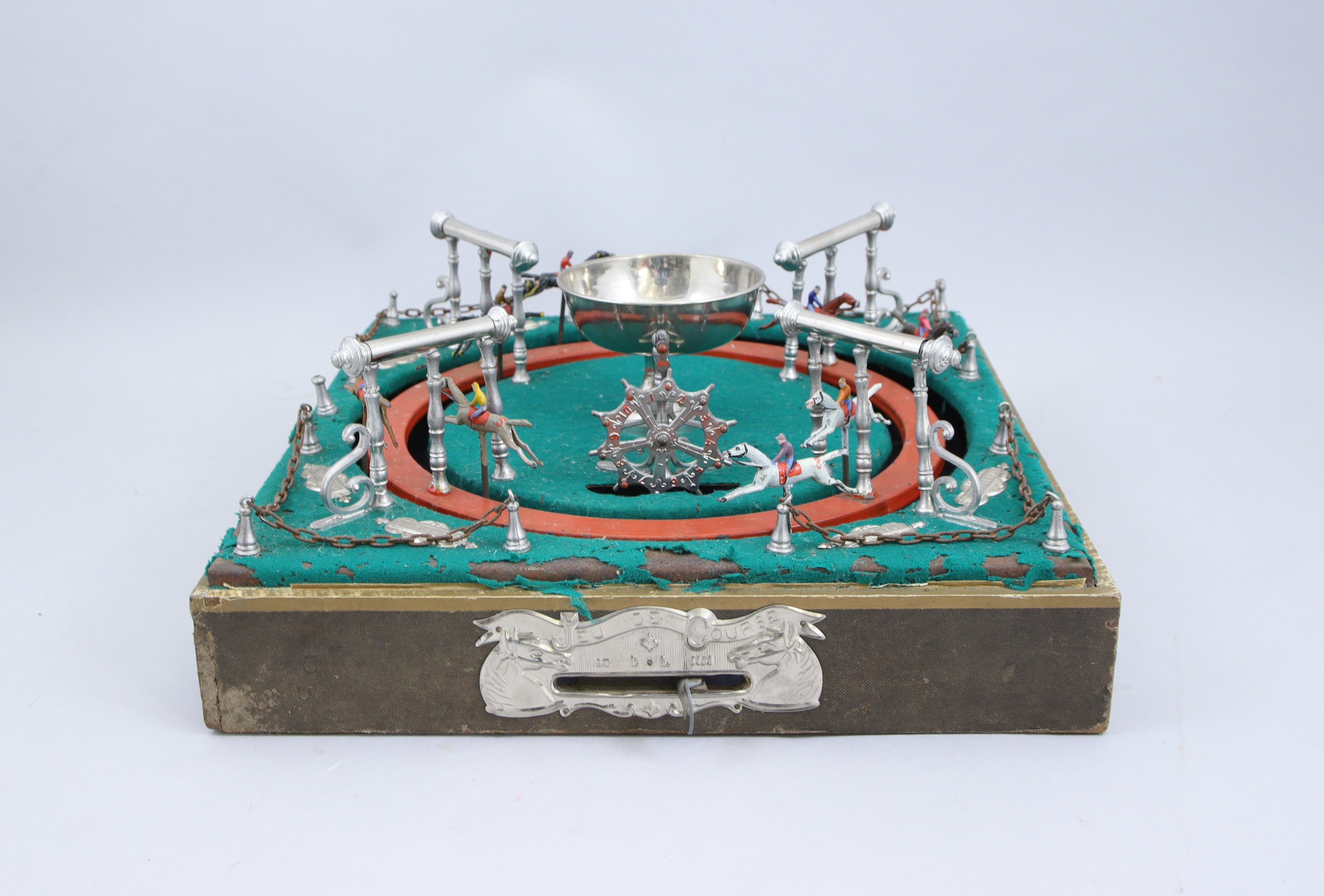 Ancien jeu mécanique à deux pistes et huit chevaux, en métal laqué et feutrine verte.