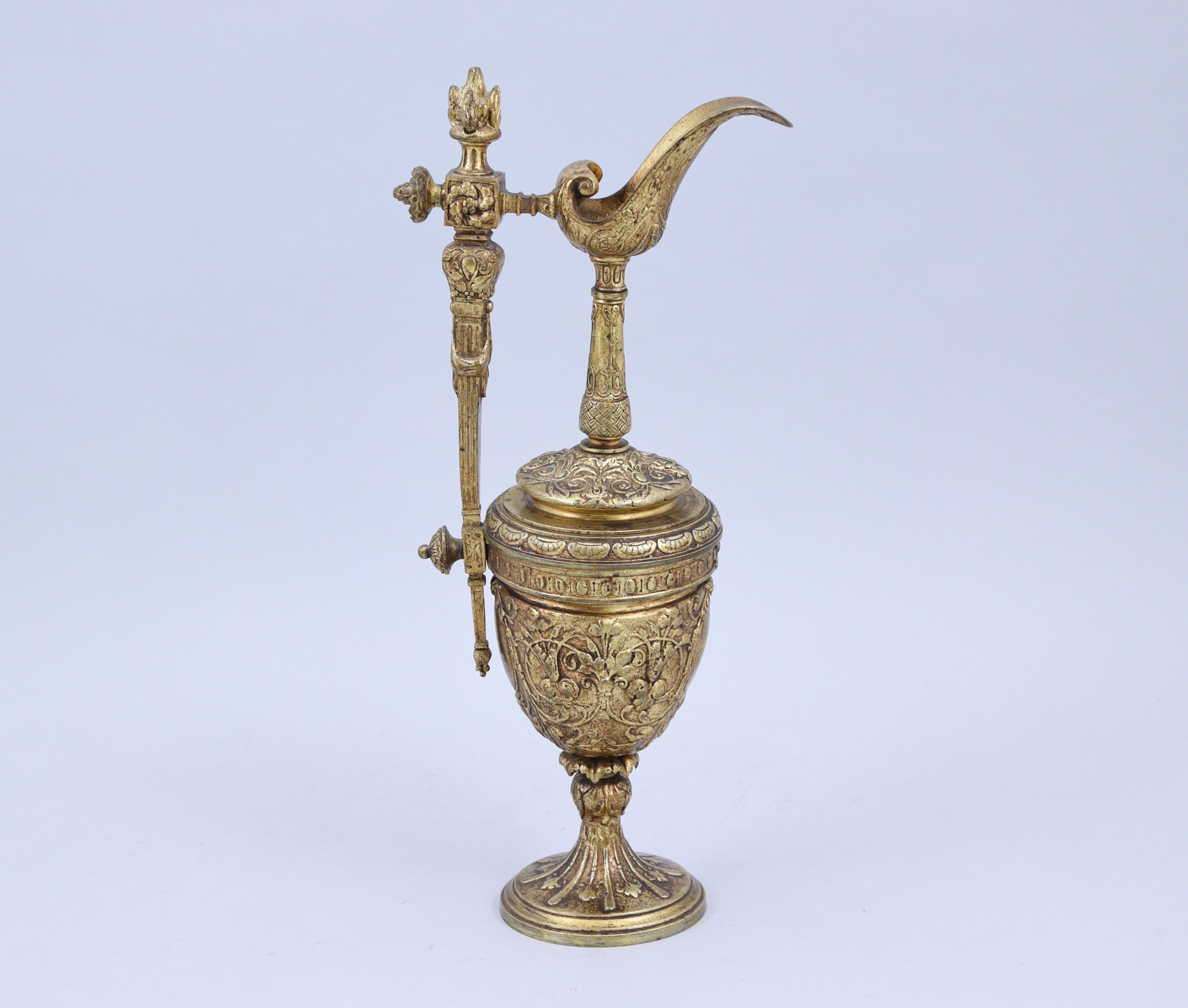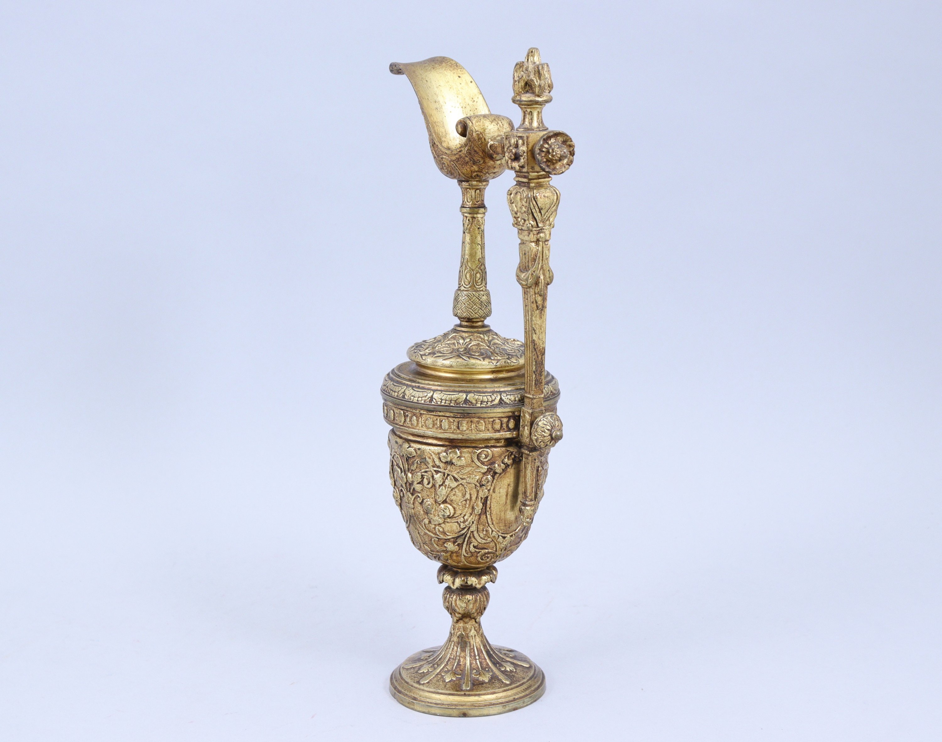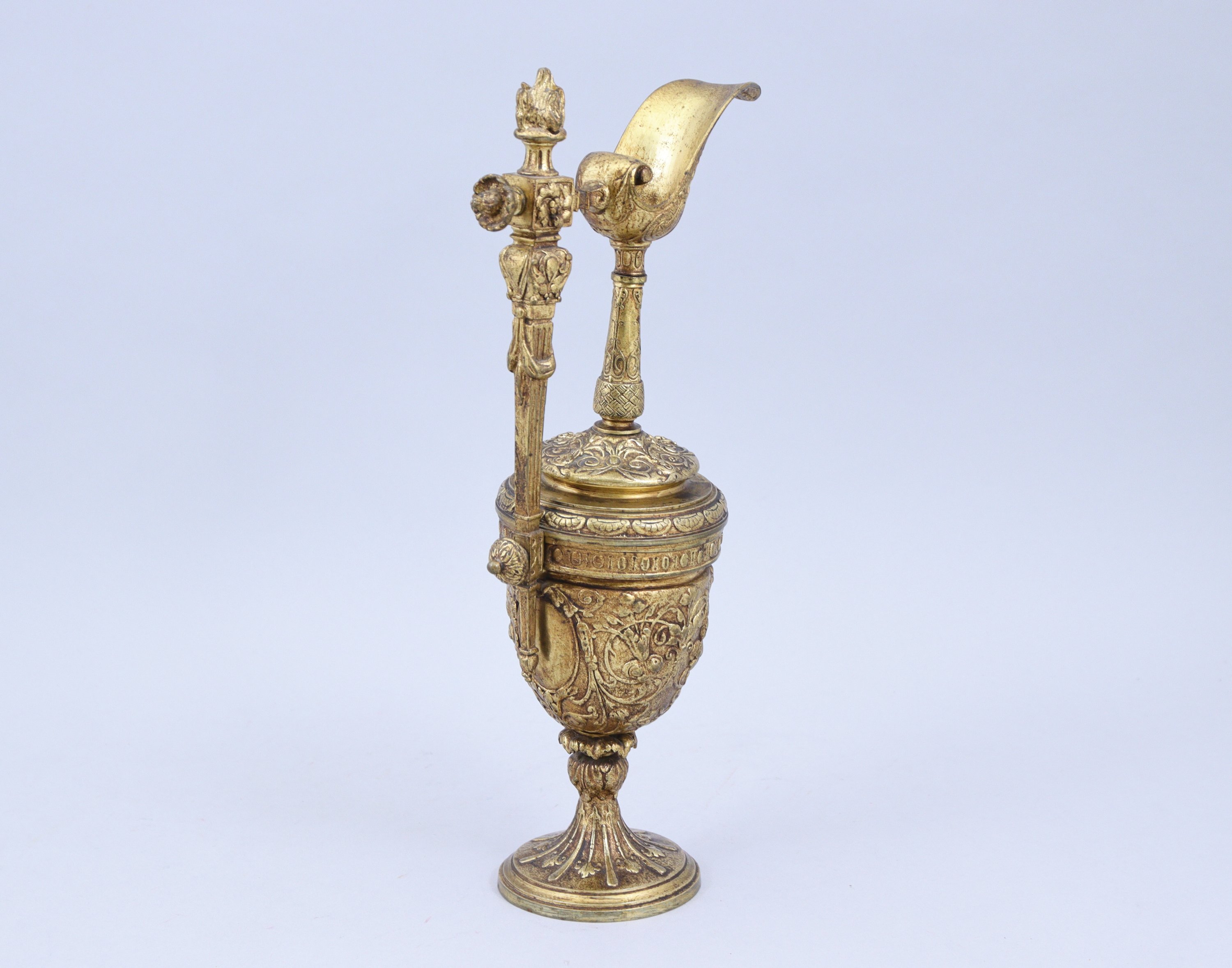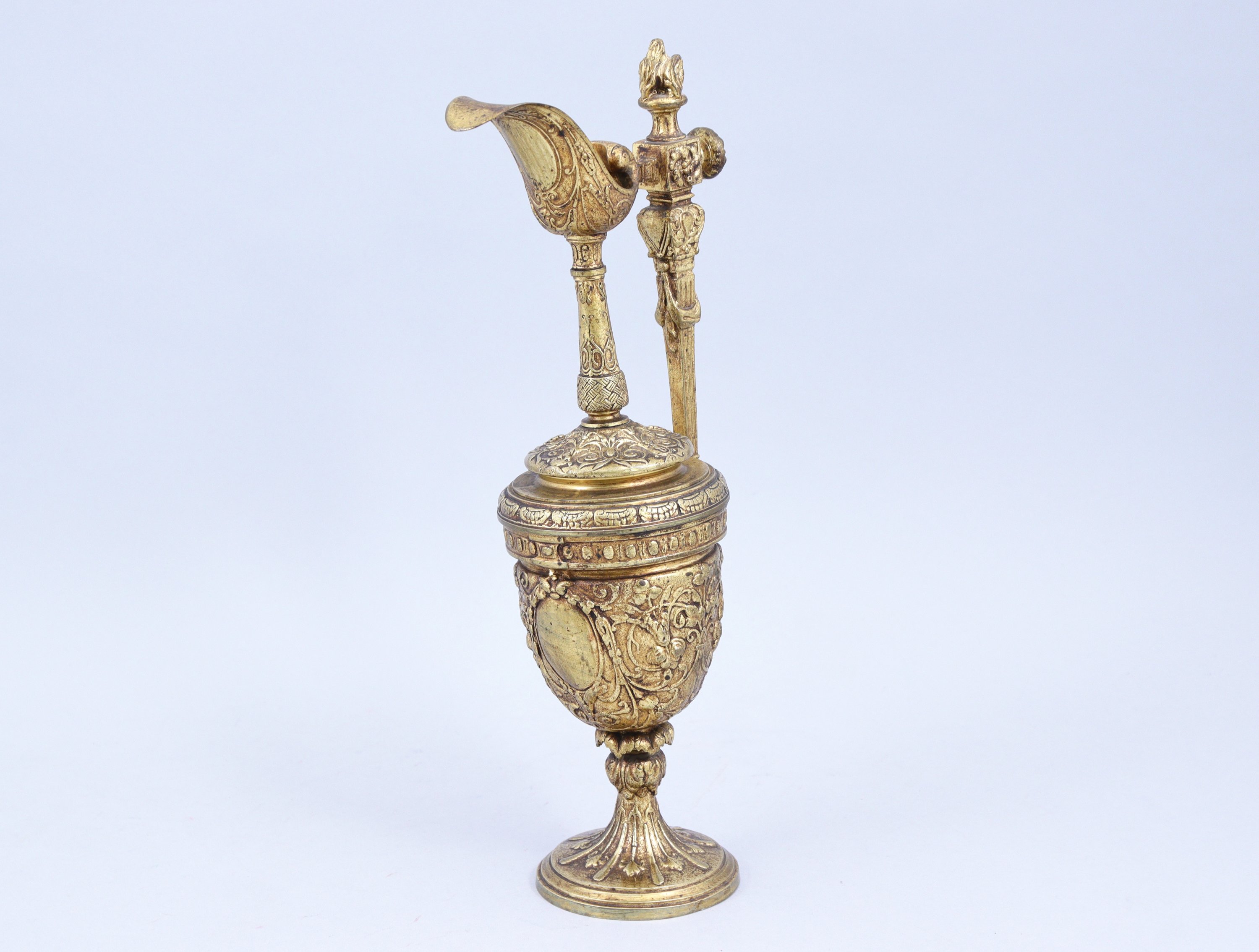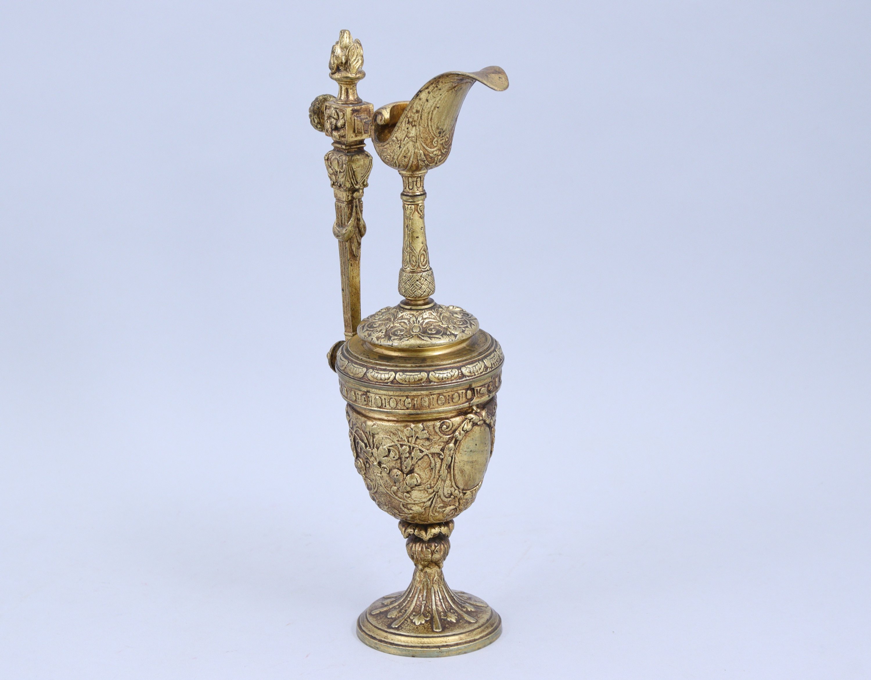 en bronze doré. L'anse coiffée d'un pot à feu, le bec verseur de forme évasée reposant sur un fin col. La panse est décorée de rinceaux entourant des médaillons à décor de guirlandes. Elle repose sur un pied circulaire à alternance de godrons et feuilles.