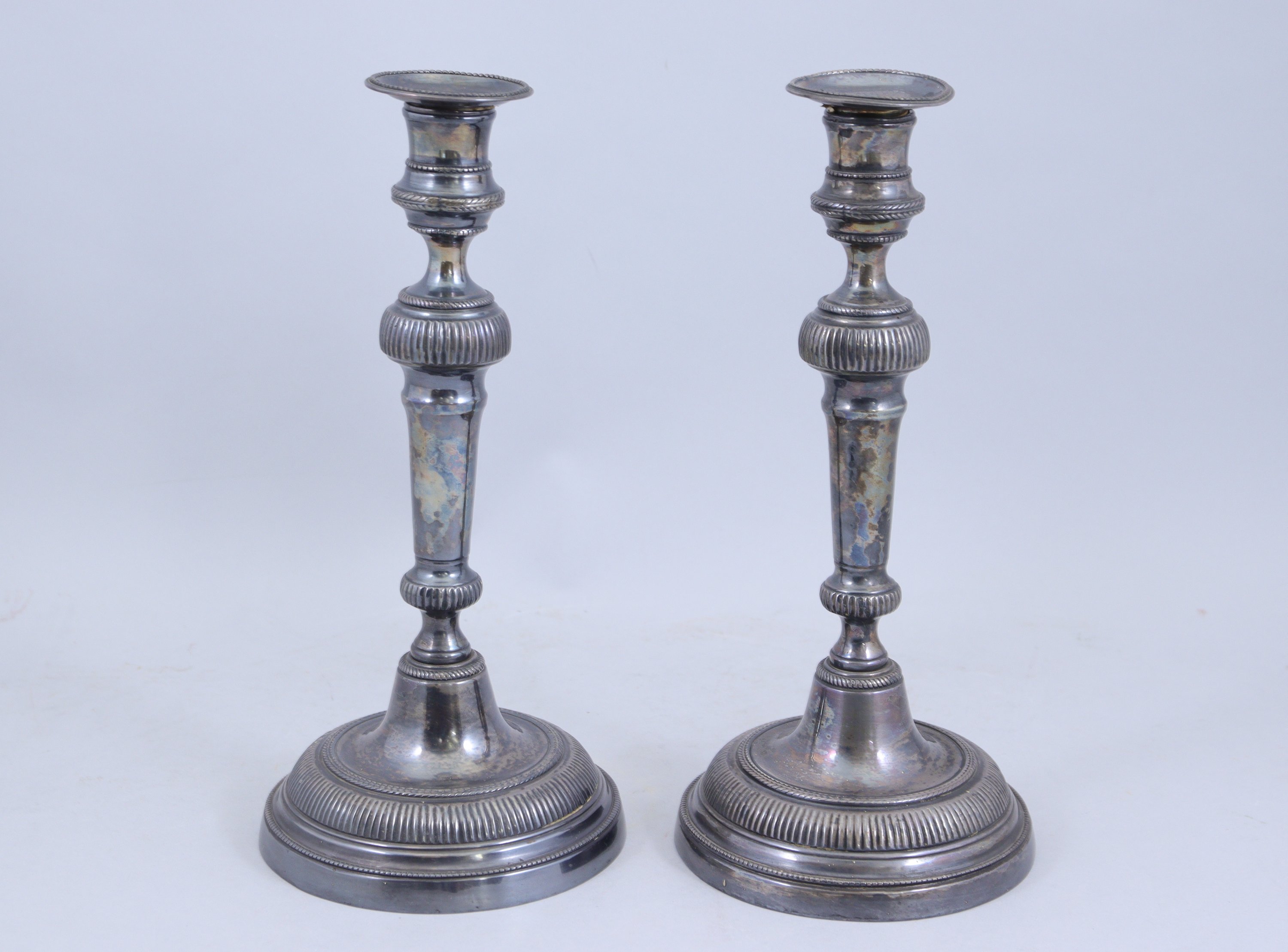 Joint : Paire de flambeaux en métal argenté, à décor de rangs de perles, torsades et godrons. Le fût fuselé reposant sur une base circulaire en cloche. Style louis XVI. Haut. 30 Diam. 14,2 cm. (une bobèche tordue).