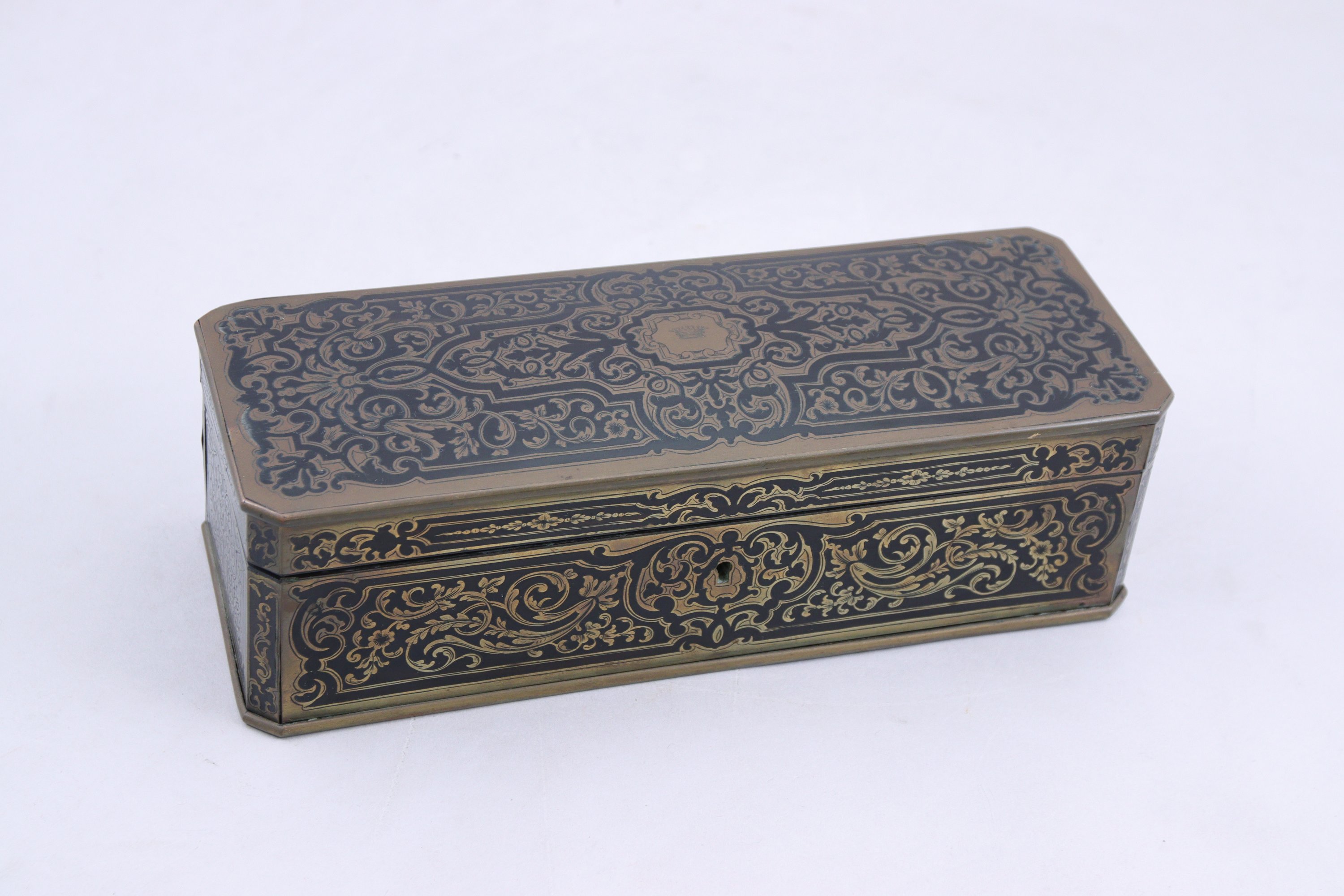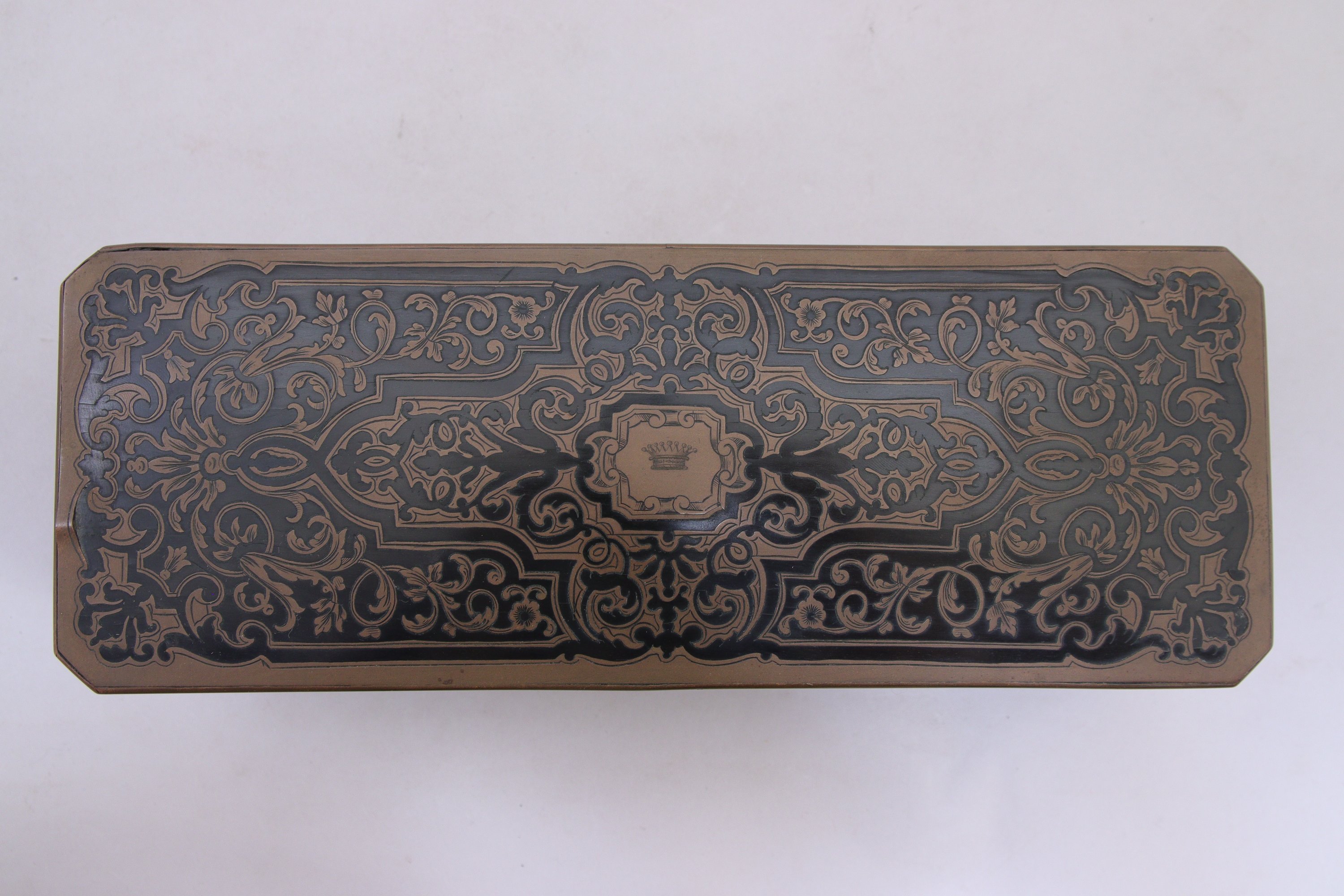 en marqueterie de laiton sur fond de bois teinté noir ouvrant par un couvercle et un petit abattant. Il est richement orné de rinceaux végétaux et présente sur le couvercle un cartouche orné d'une couronne comtale.