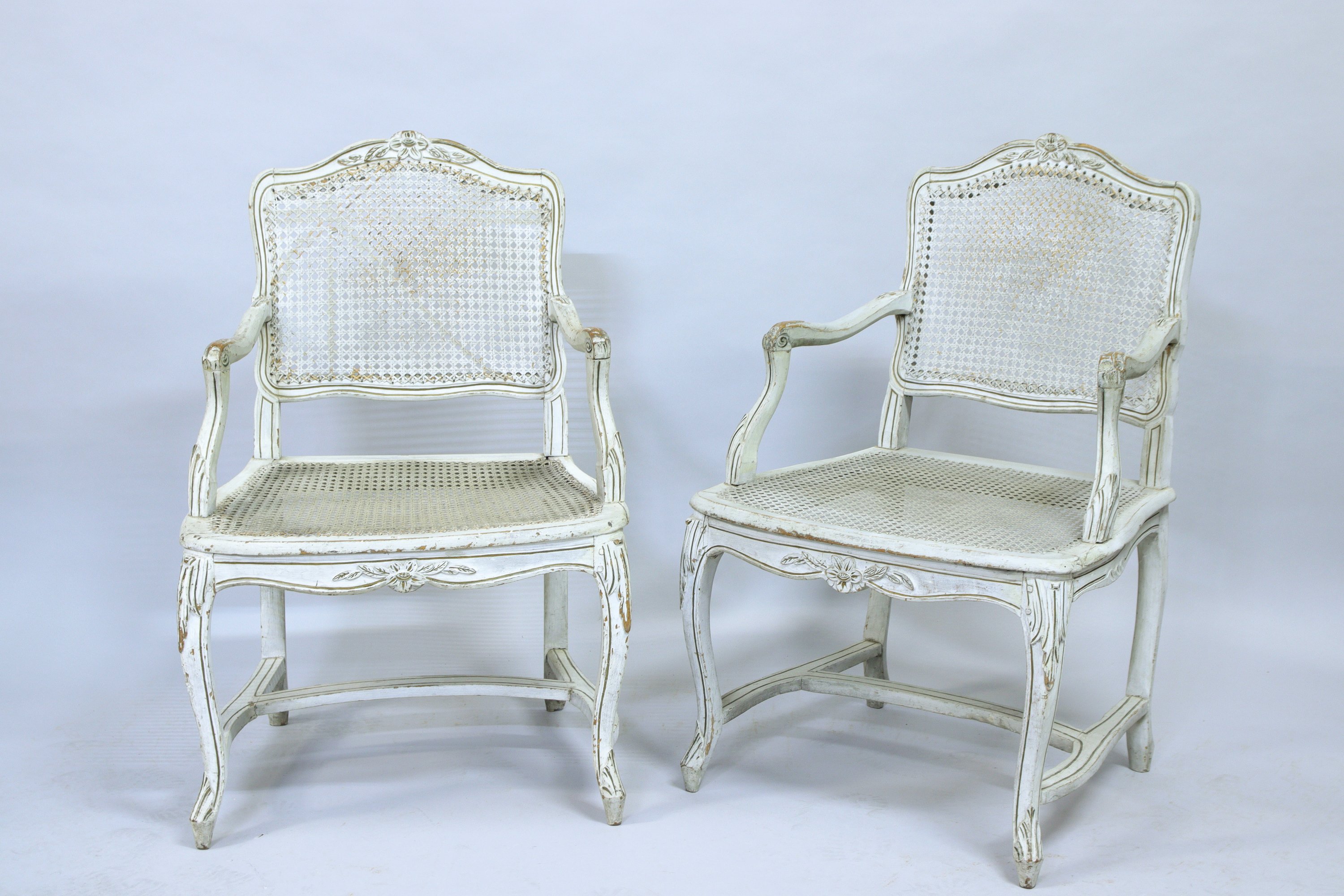 en bois mouluré, sculpté, laqué coloris gris et rehaussé. L'amortissement du dossier et la ceinture à décor d'une fleur ouverte entourée de feuillage. Les accotoirs légèrement mouvementés reposent sur des consoles sculptées d'une feuille d'acanthe. Ils reposent sur quatre pieds cambrés réunis par une entrejambe en H.