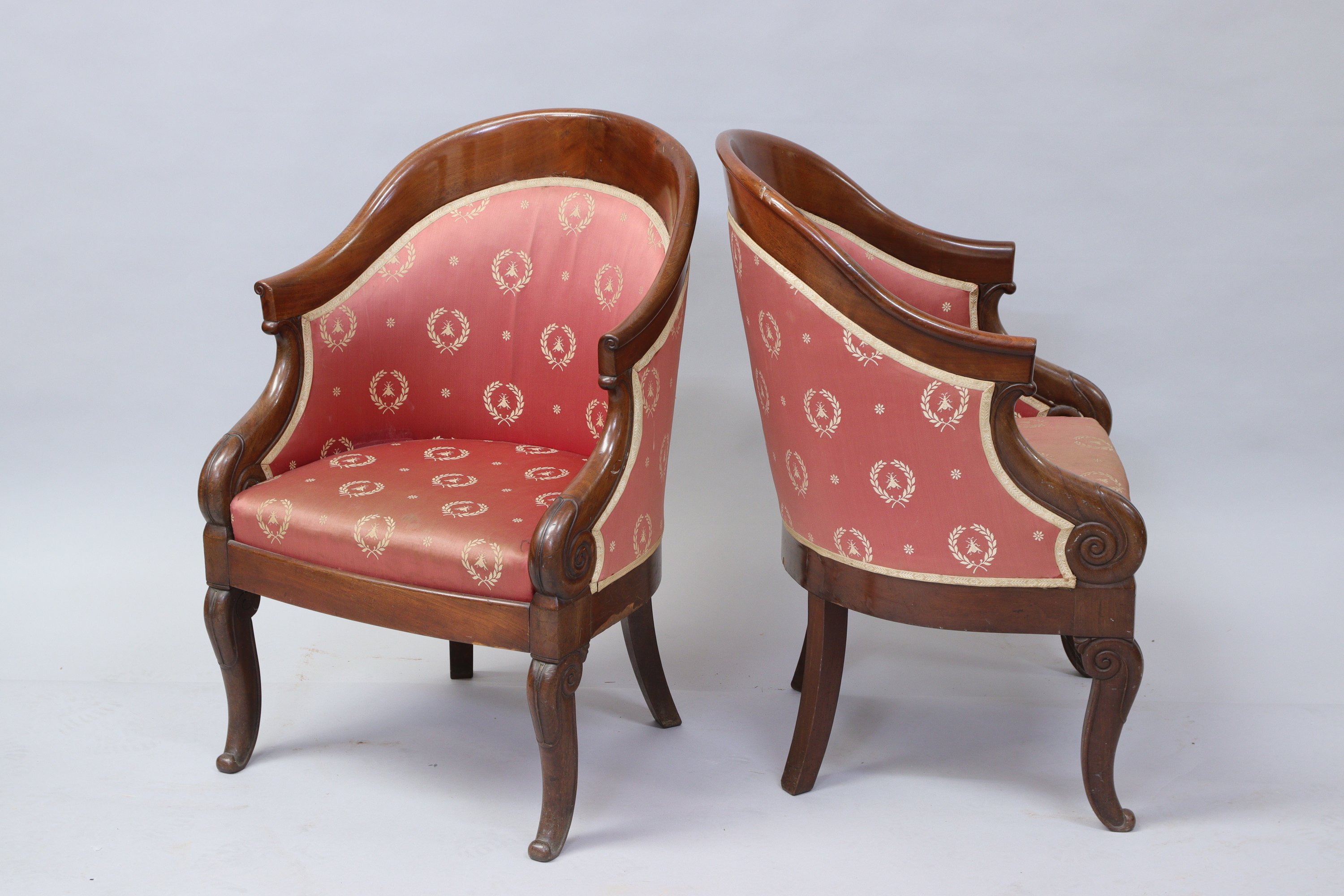 en acajou et placage d'acajou. Ils reposent sur quatre pieds, les antérieurs en jarret, les postérieurs en sabre. Garniture de soie à fond rose à décor de semis d'abeilles dans des couronnes de branches de laurier.
