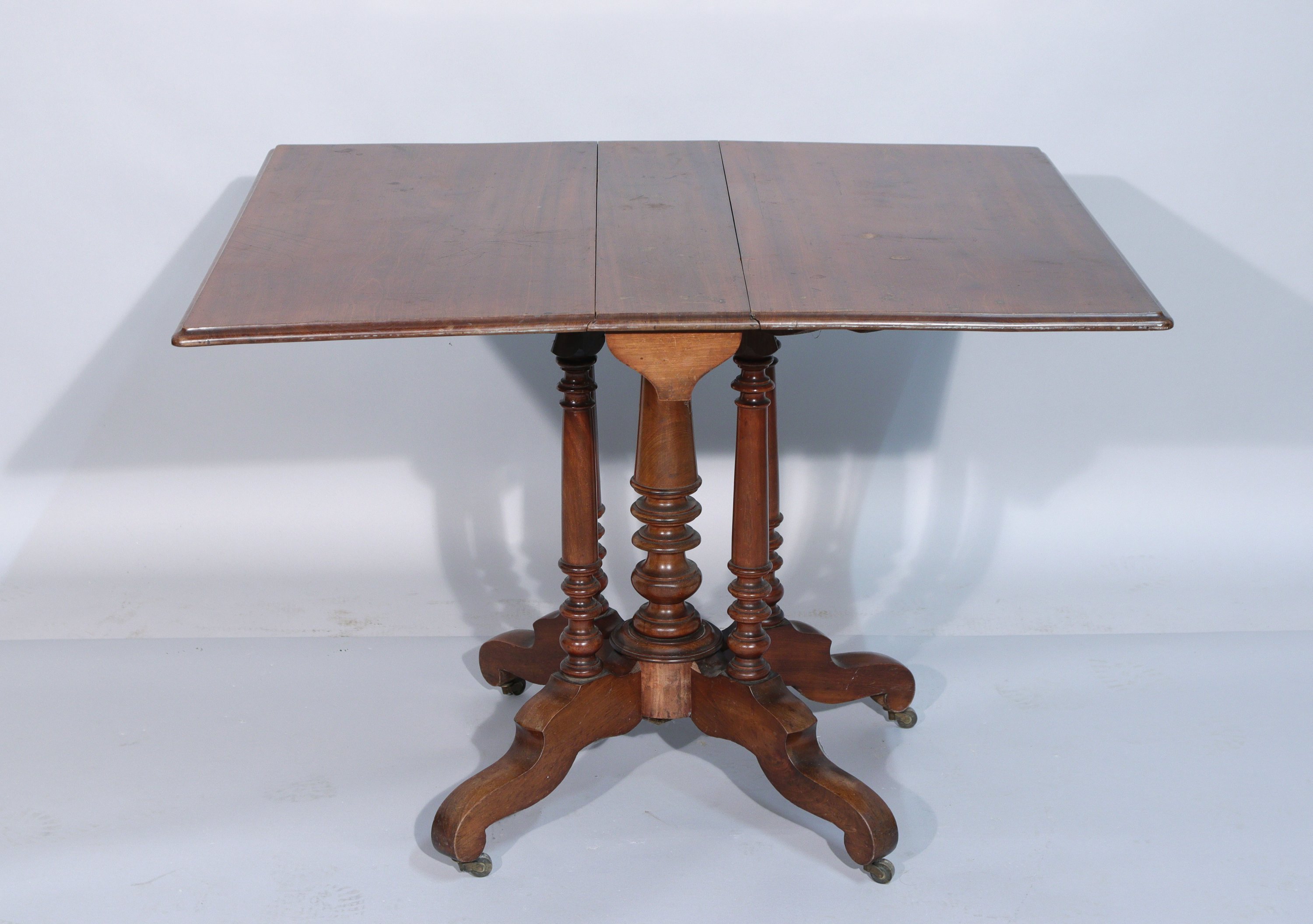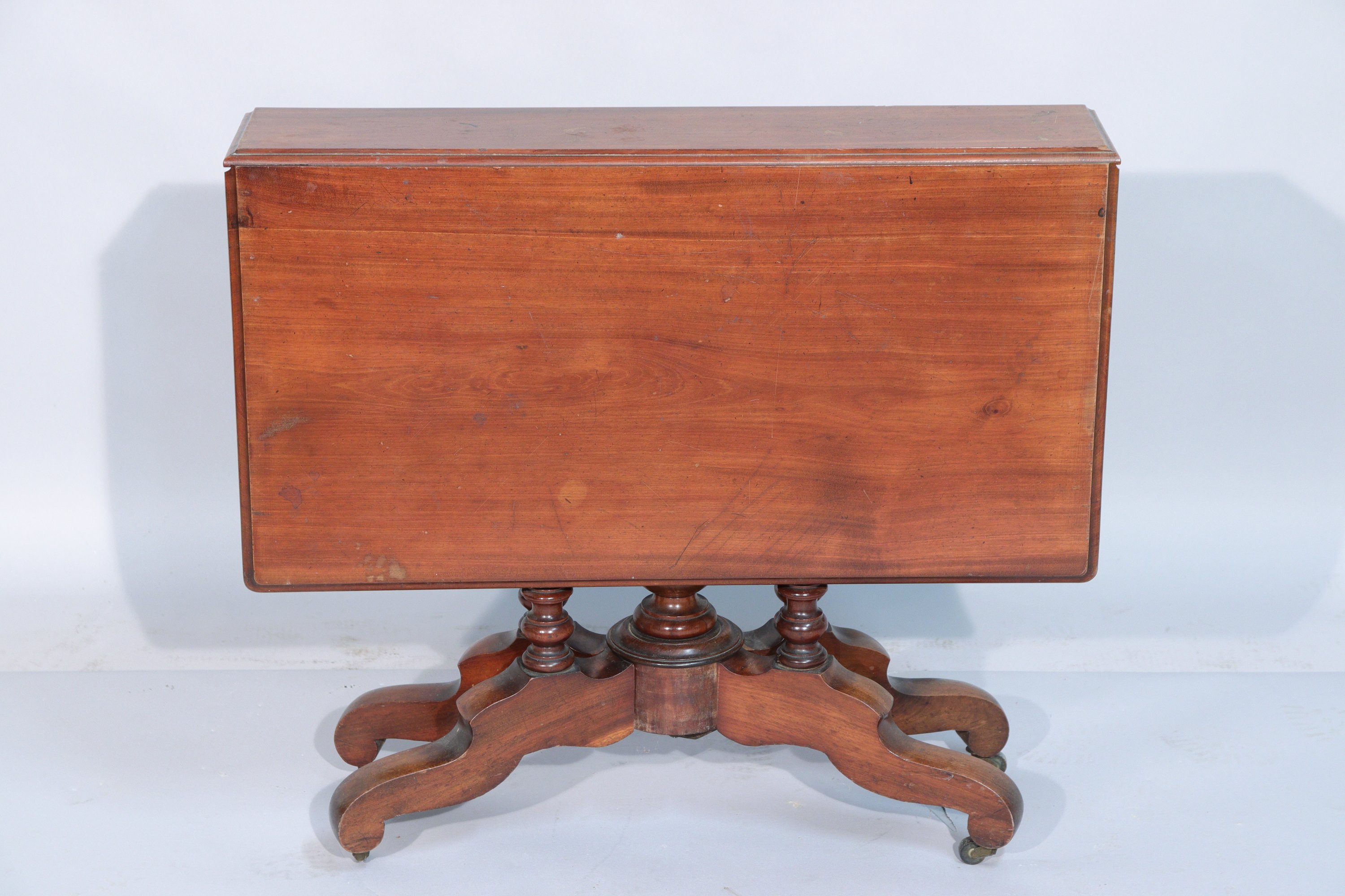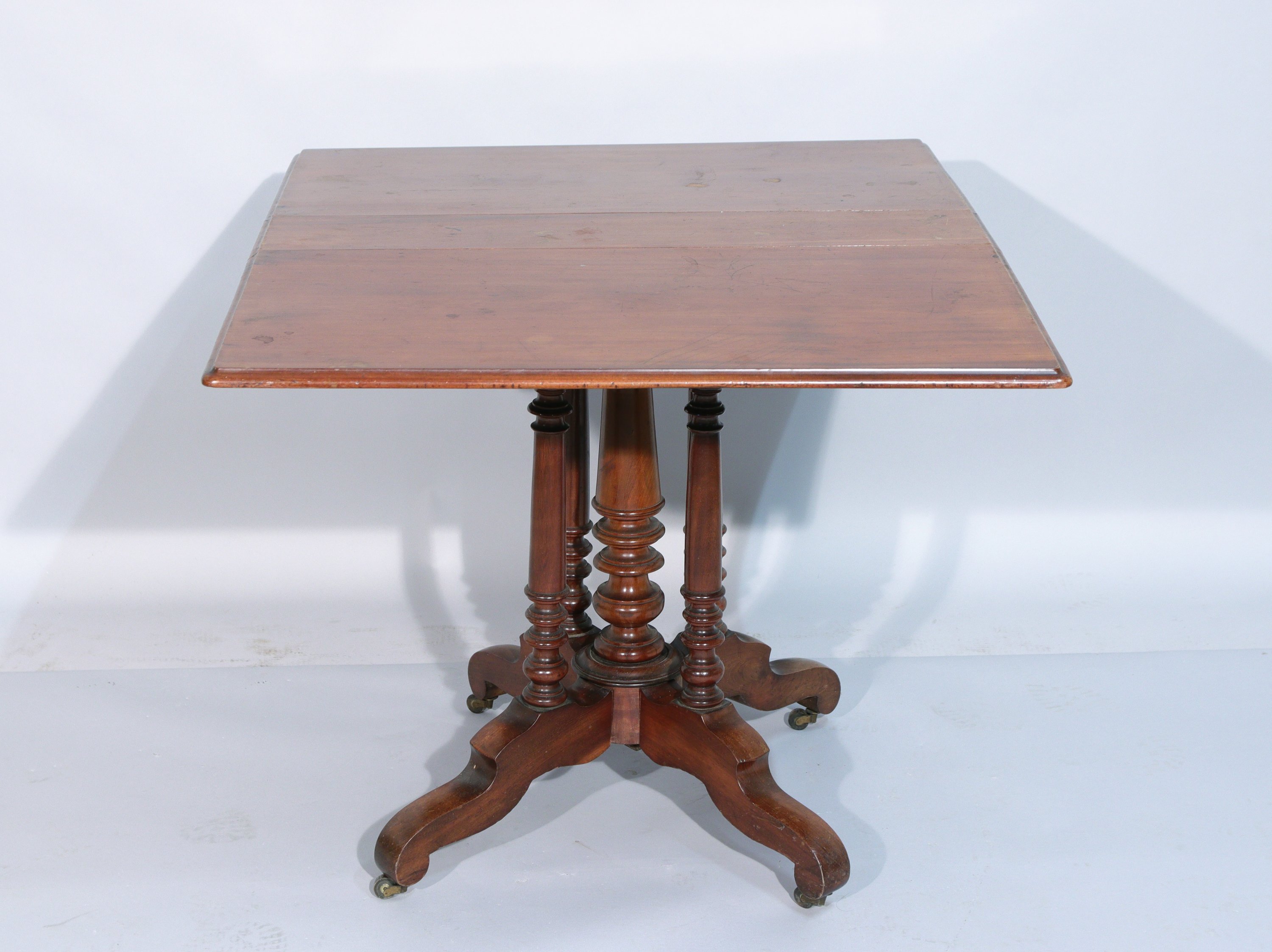 en acajou et placage. Le plateau rectangulaire aux angles arrondis à deux volets. Un pied central entouré de quatre pieds moulurés terminés par un piétement sur roulettes.