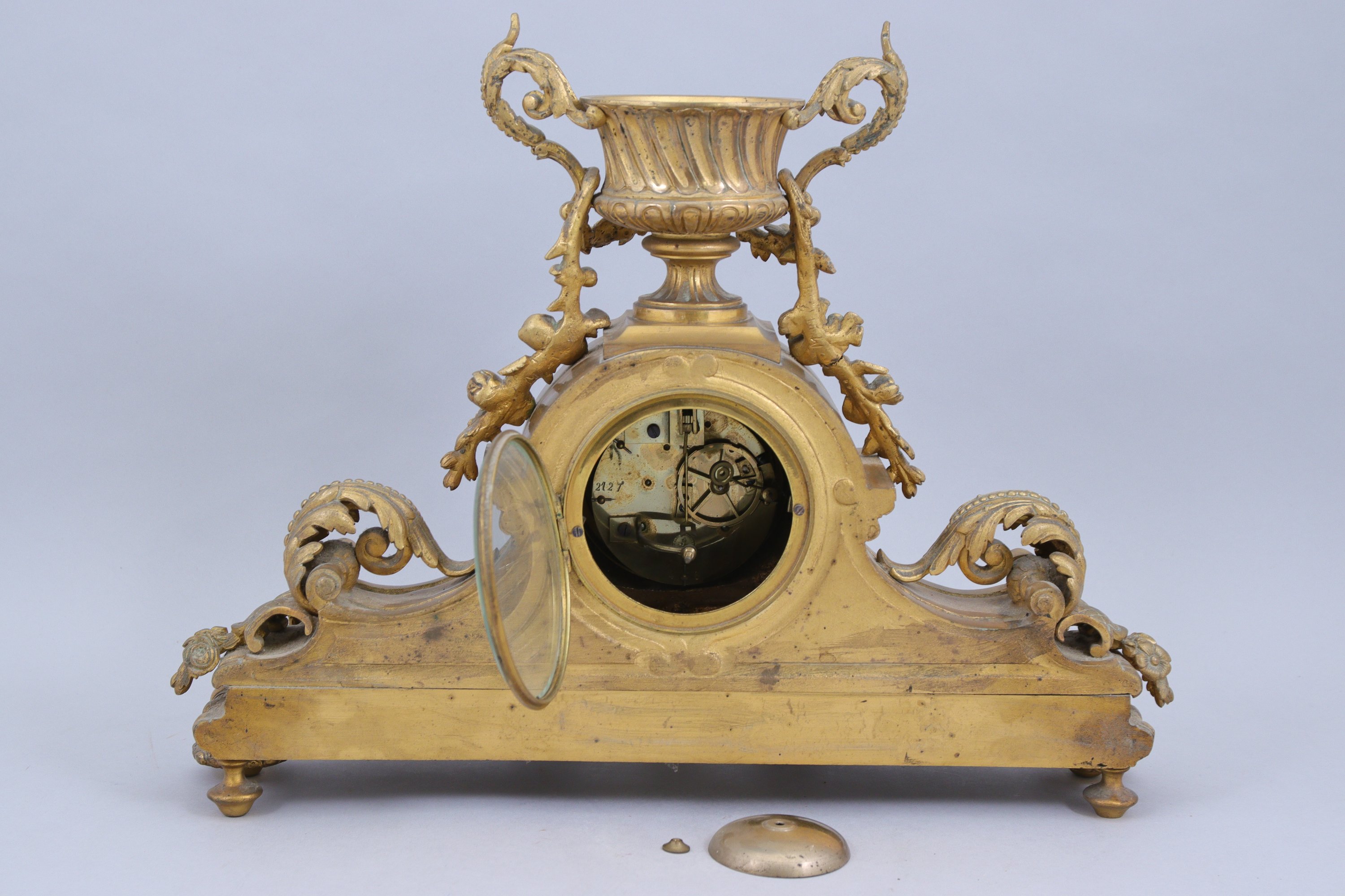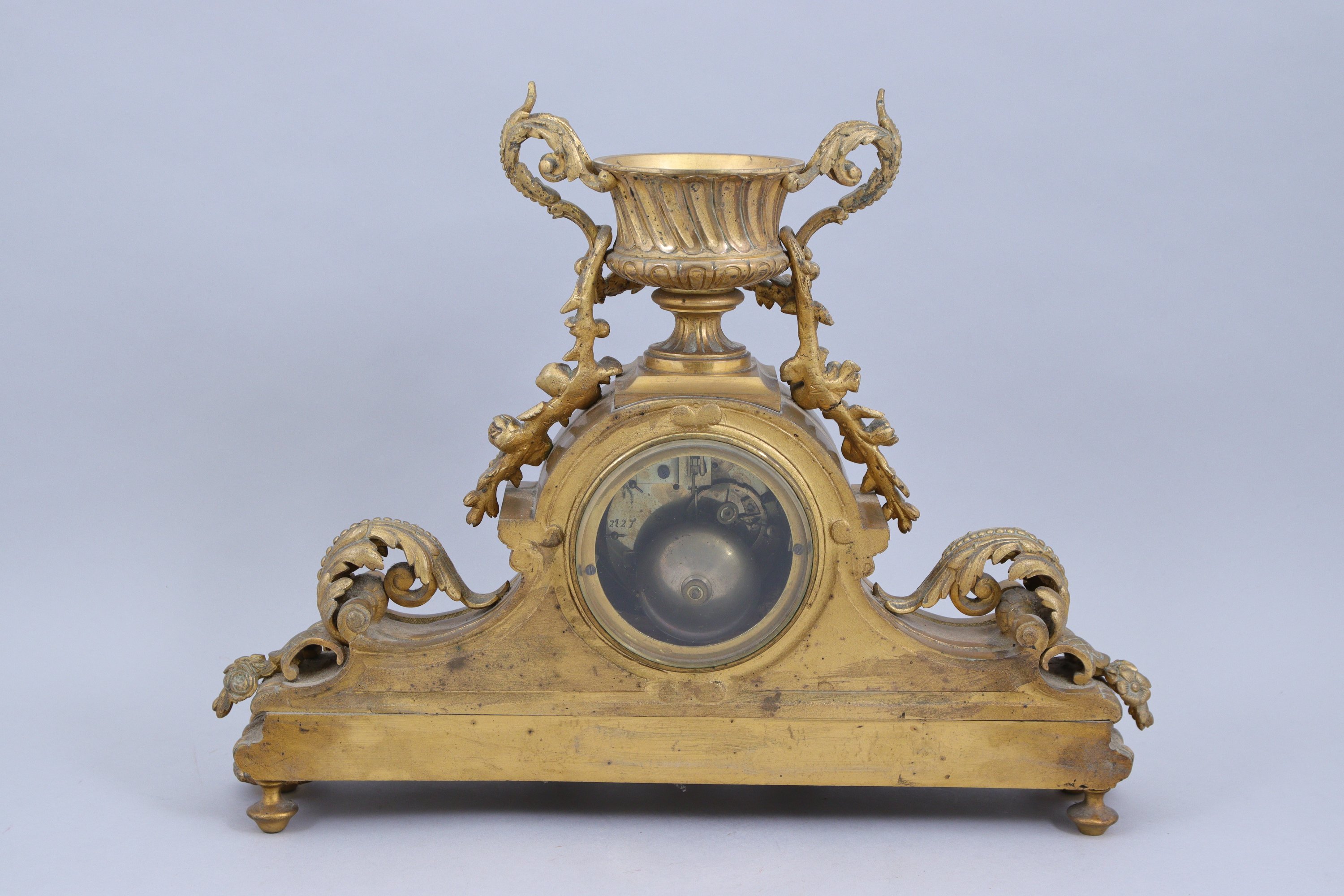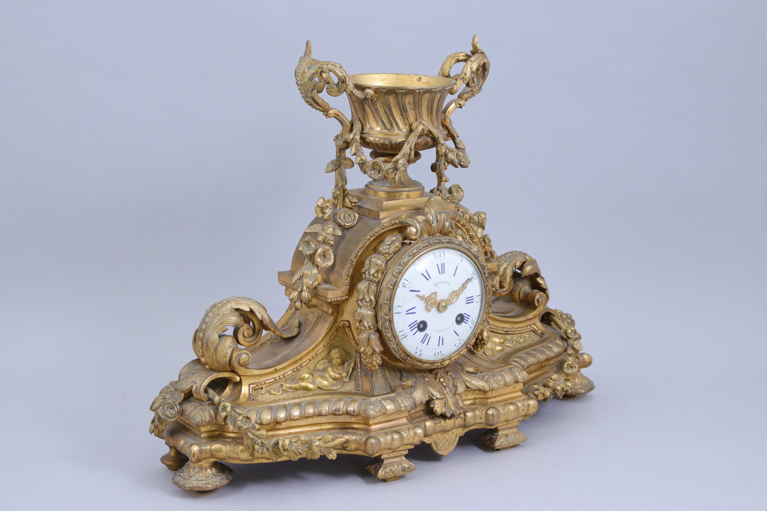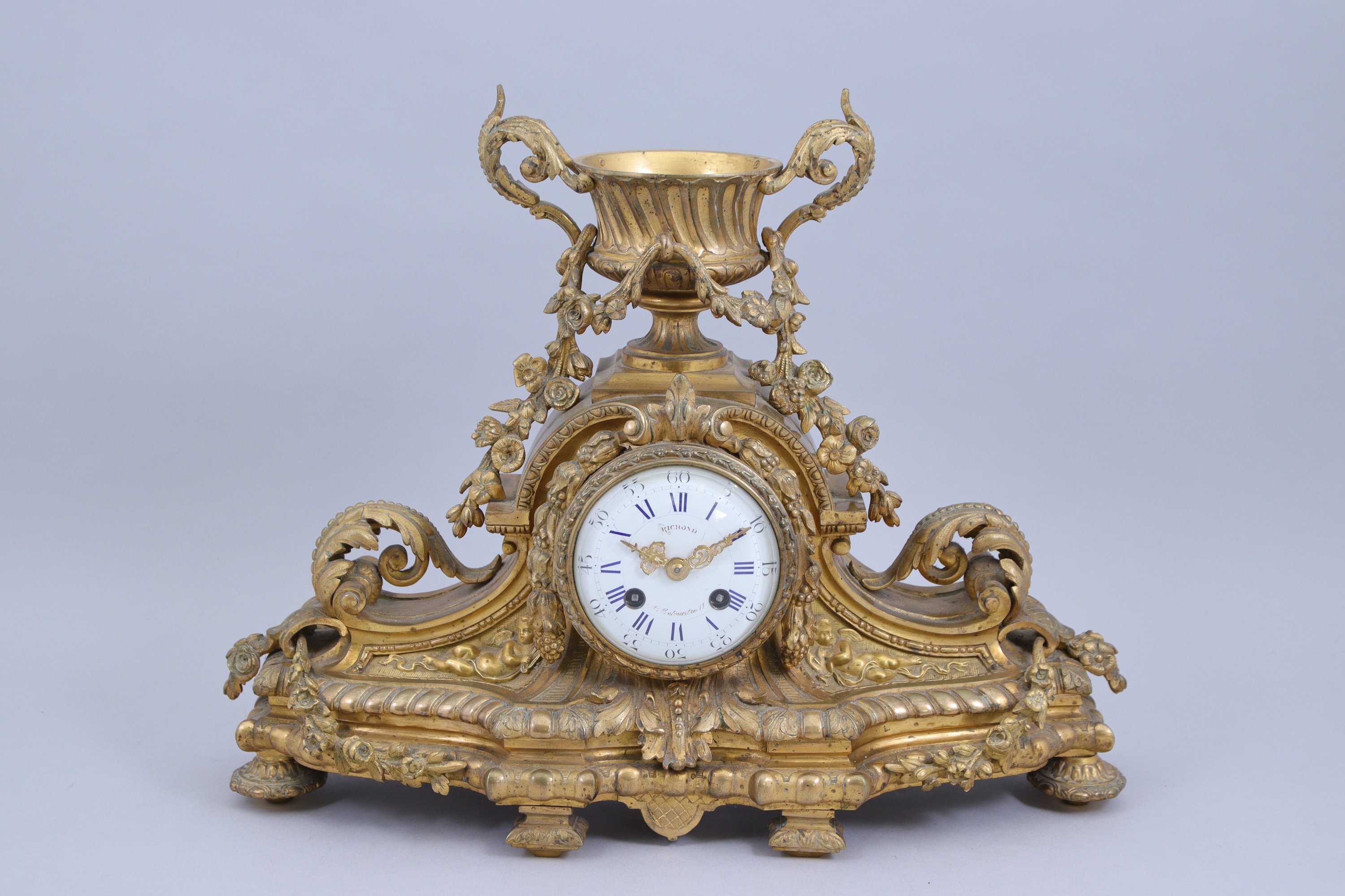 en bronze doré. Le cadran émaillé blanc indiquant les heures en chiffres romains, les minutes en chiffres arabes et un chemin de fer. Il est signé "Richon / boulevard Montmartre 11" et surmonté d'un vase godronné à deux anses à décor d'acanthe dans lequel figure une guirlande de fleurs. Deux feuilles d'acanthe entourent le cadran. Elle repose sur six pieds.