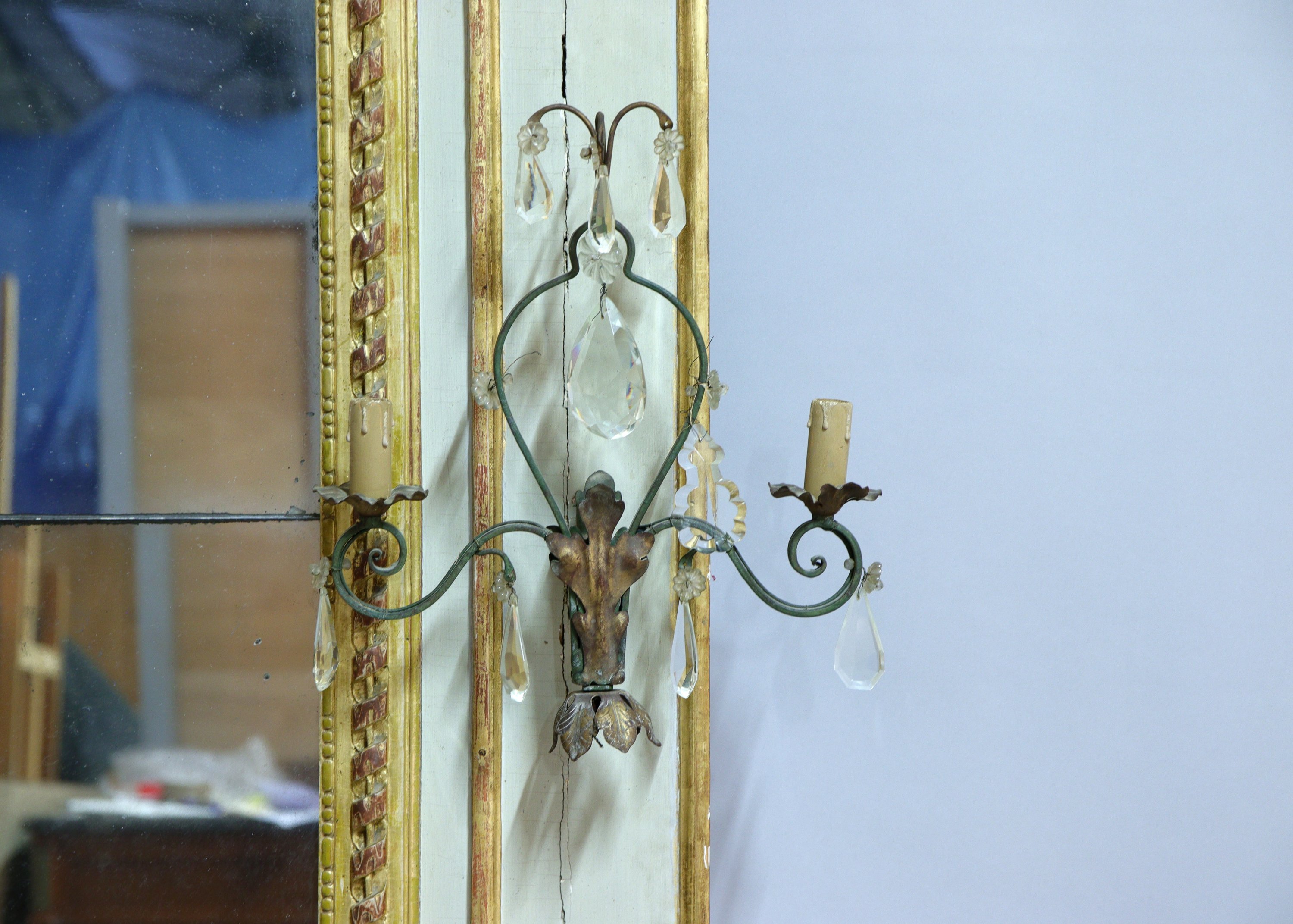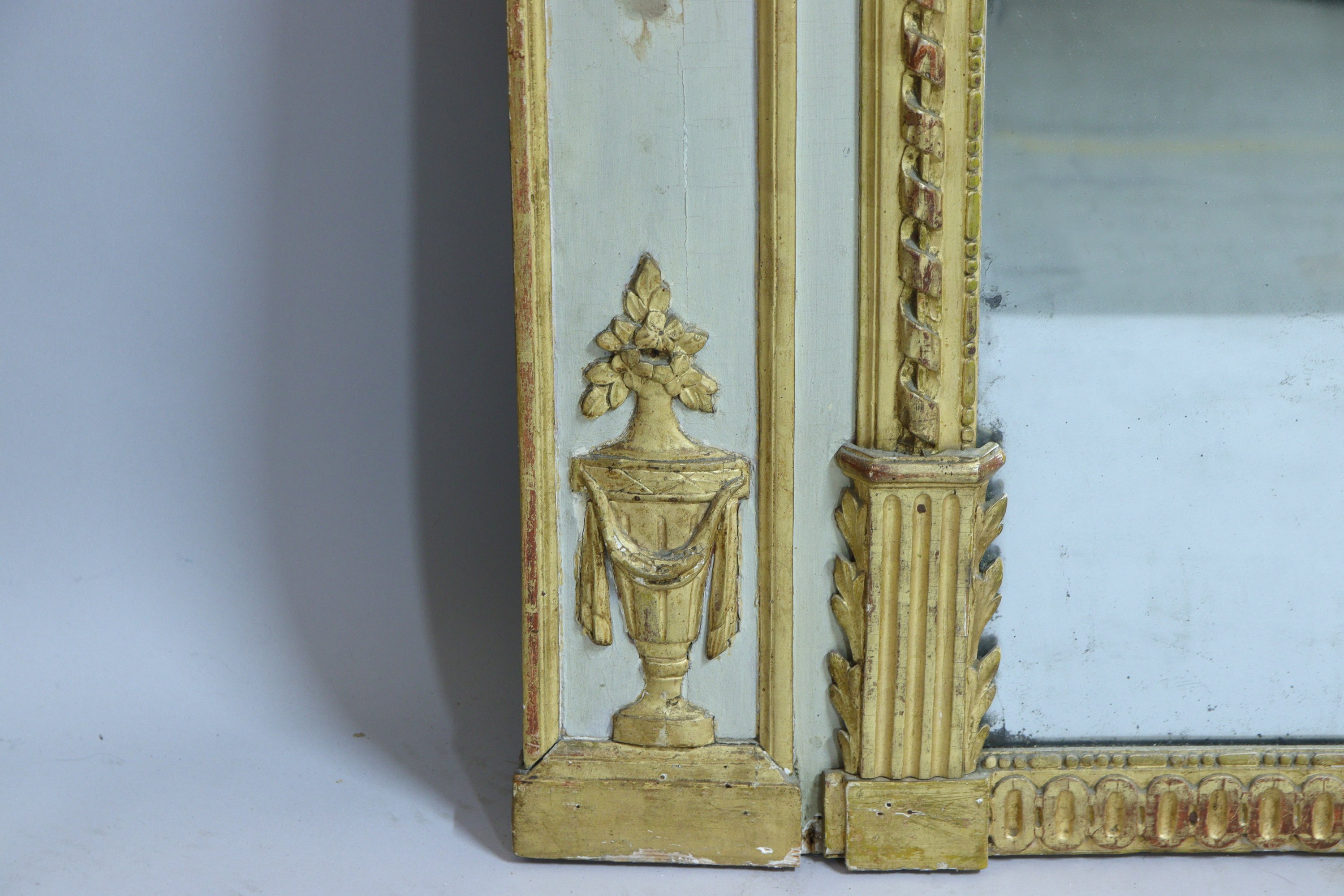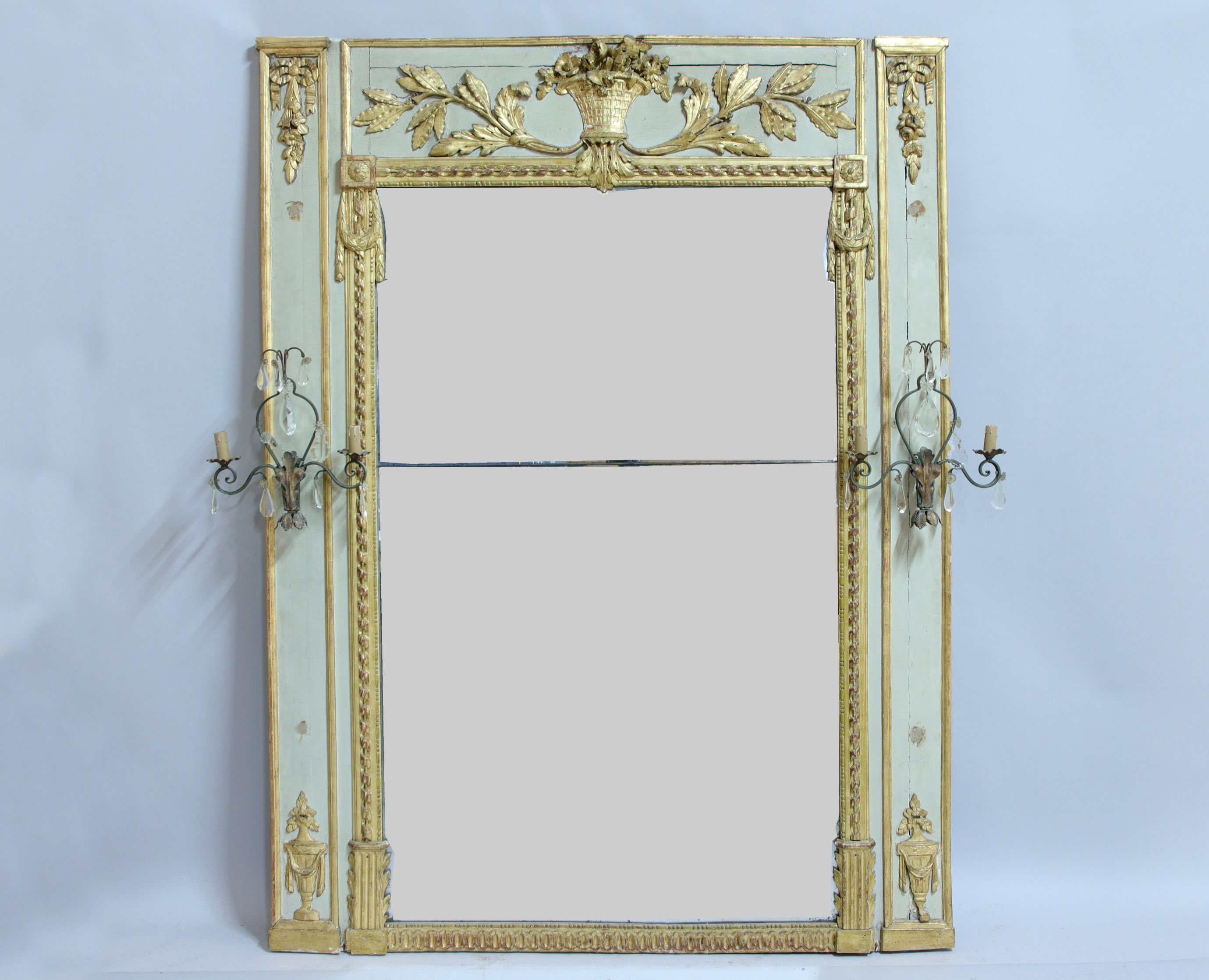 en bois doré, sculpté et laqué gris. Il est décoré en partie supérieure d'une panière fleurie entourée de deux branches de laurier. Deux pilastres de chaque côté coiffés de noeuds et terminés par des vases à l'antique. Le miroir en deux parties est souligné par une frise de rubans noués et raccordements à fleurettes. Une paire de bras de lumière à deux feux à décor de feuilles ouvragées et de pampilles éclairent lensemble.