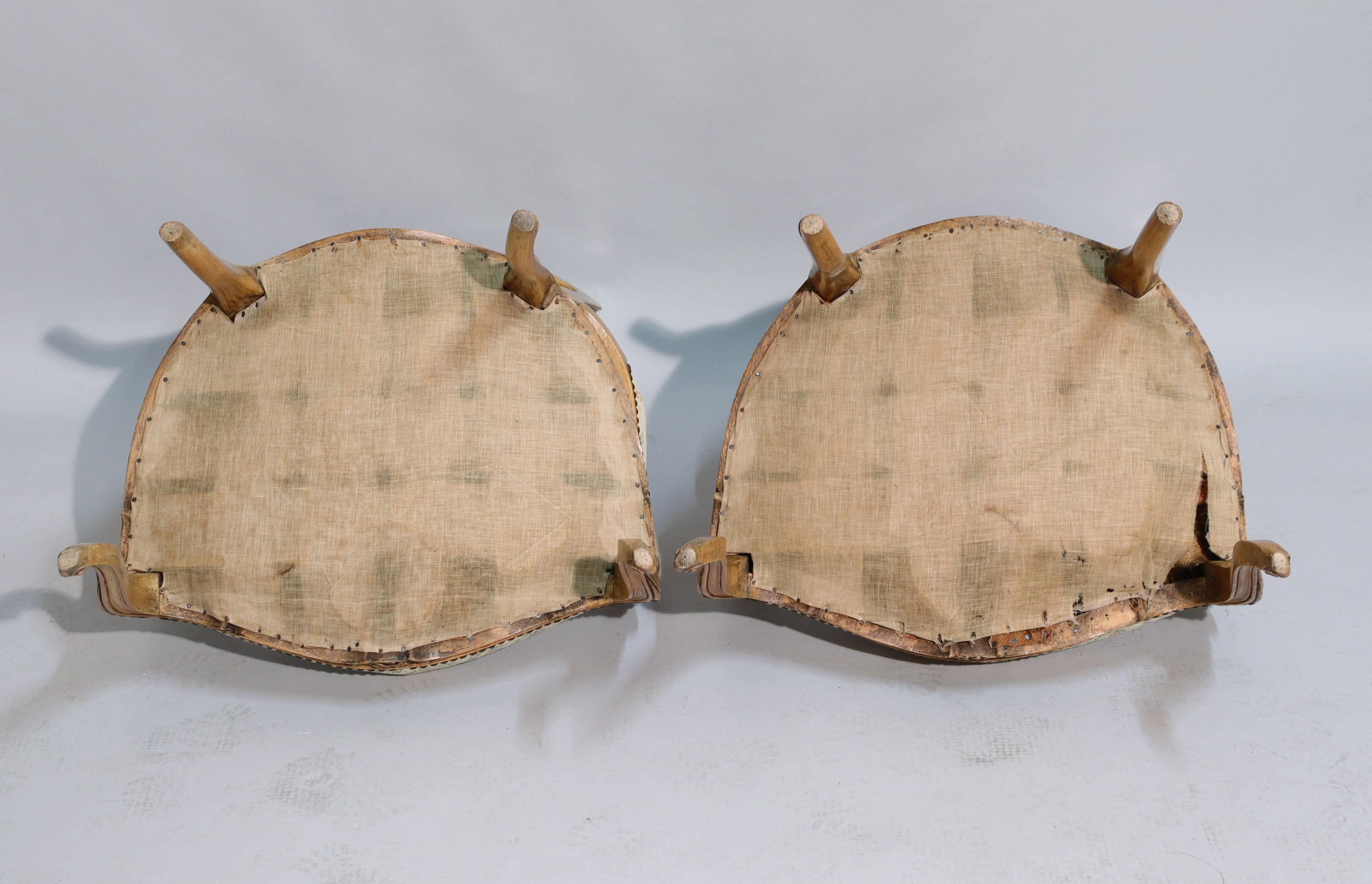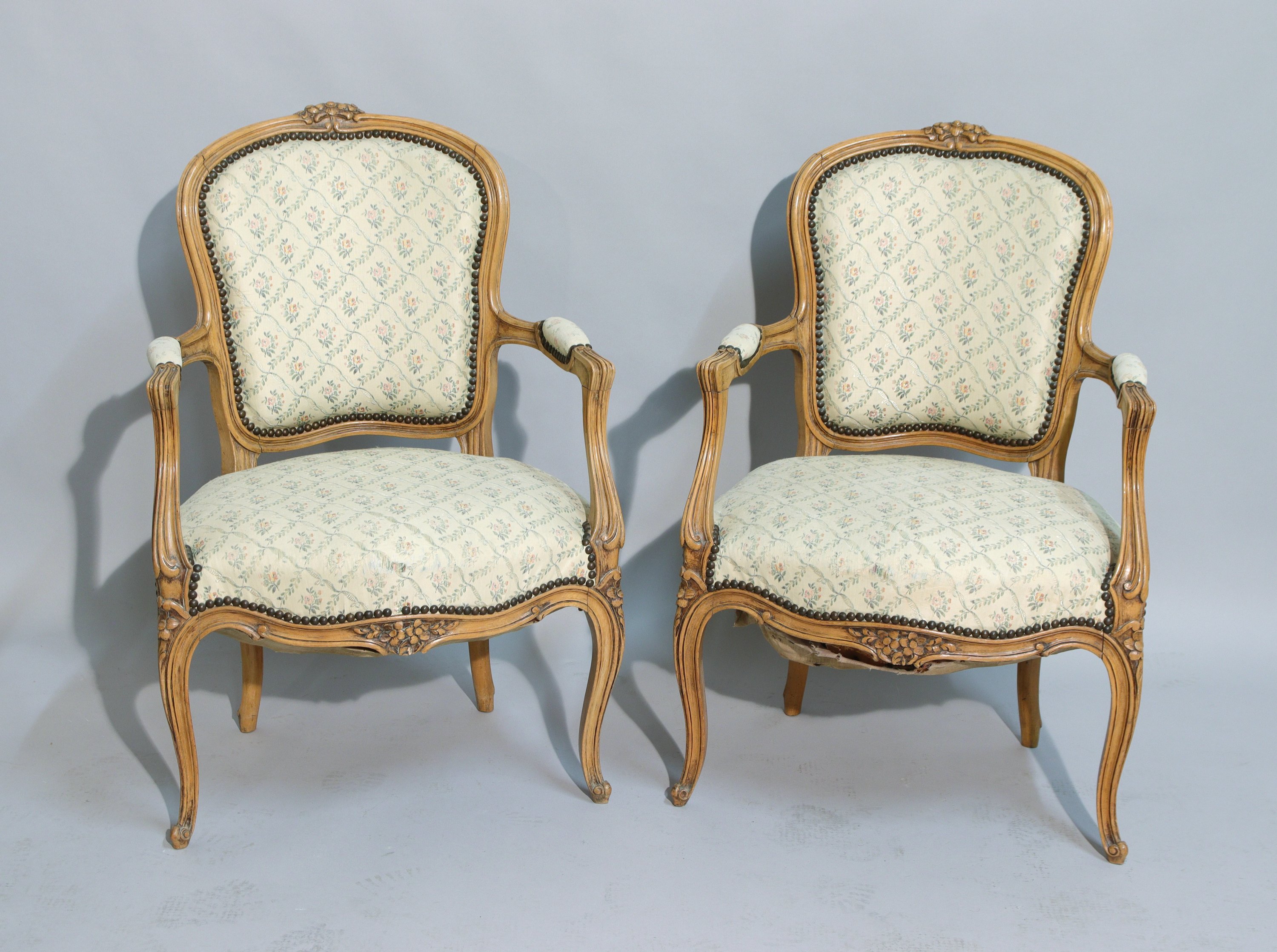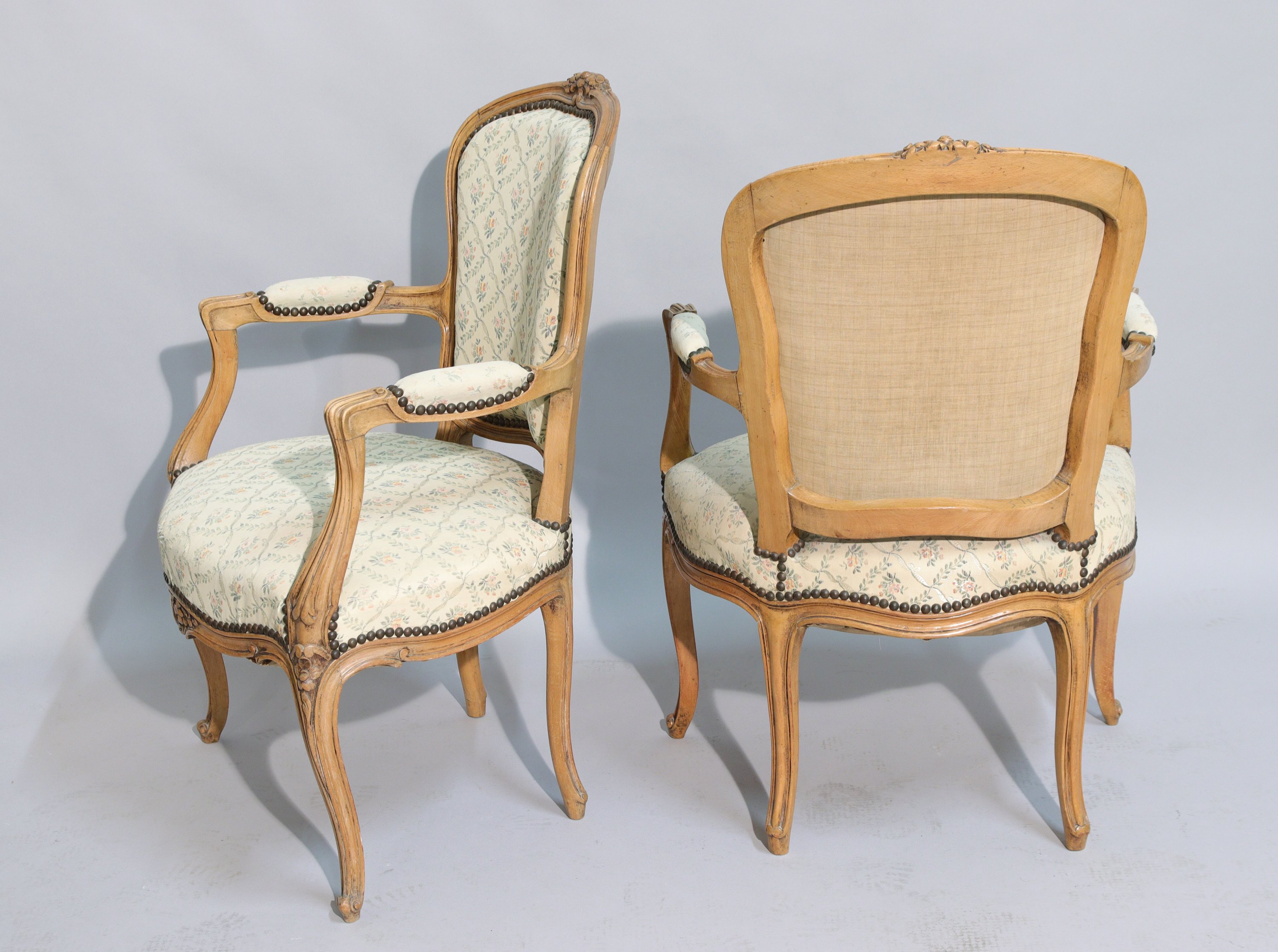 en hêtre mouluré et sculpté, à dossier violonné, décoré à l'amortissement d'une fleurette. La ceinture reprenant le même décor, les accotoirs à manchettes. Ils reposent sur quatre pieds galbés.