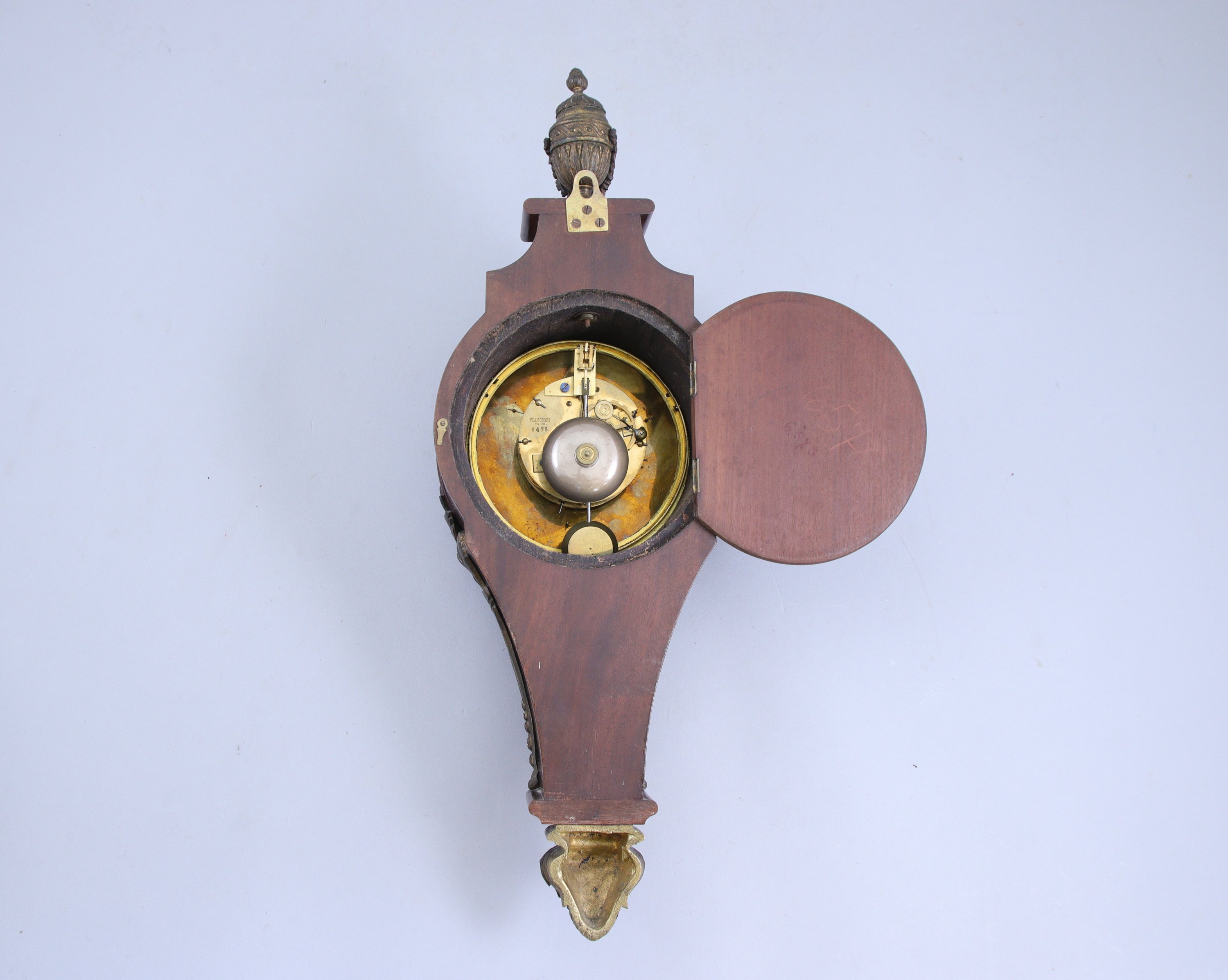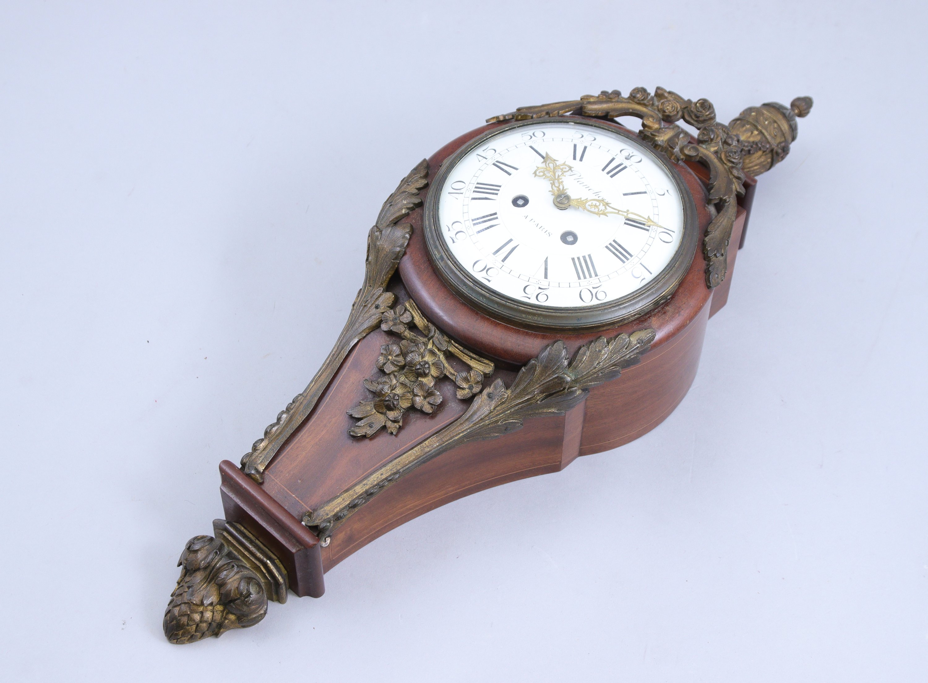 en bois naturel et bronze doré, au décor de roses, feuilles d’acanthe, divers motifs végétaux et volutes. L’ensemble est surmonté d’un vase pomme de pin orné d’une guirlande de fleurs. Le cadran, émaillé blanc indique les heures en chiffres romains et arabes, est signé « PLANCHON A PARIS ». Mouvement 8 jours.