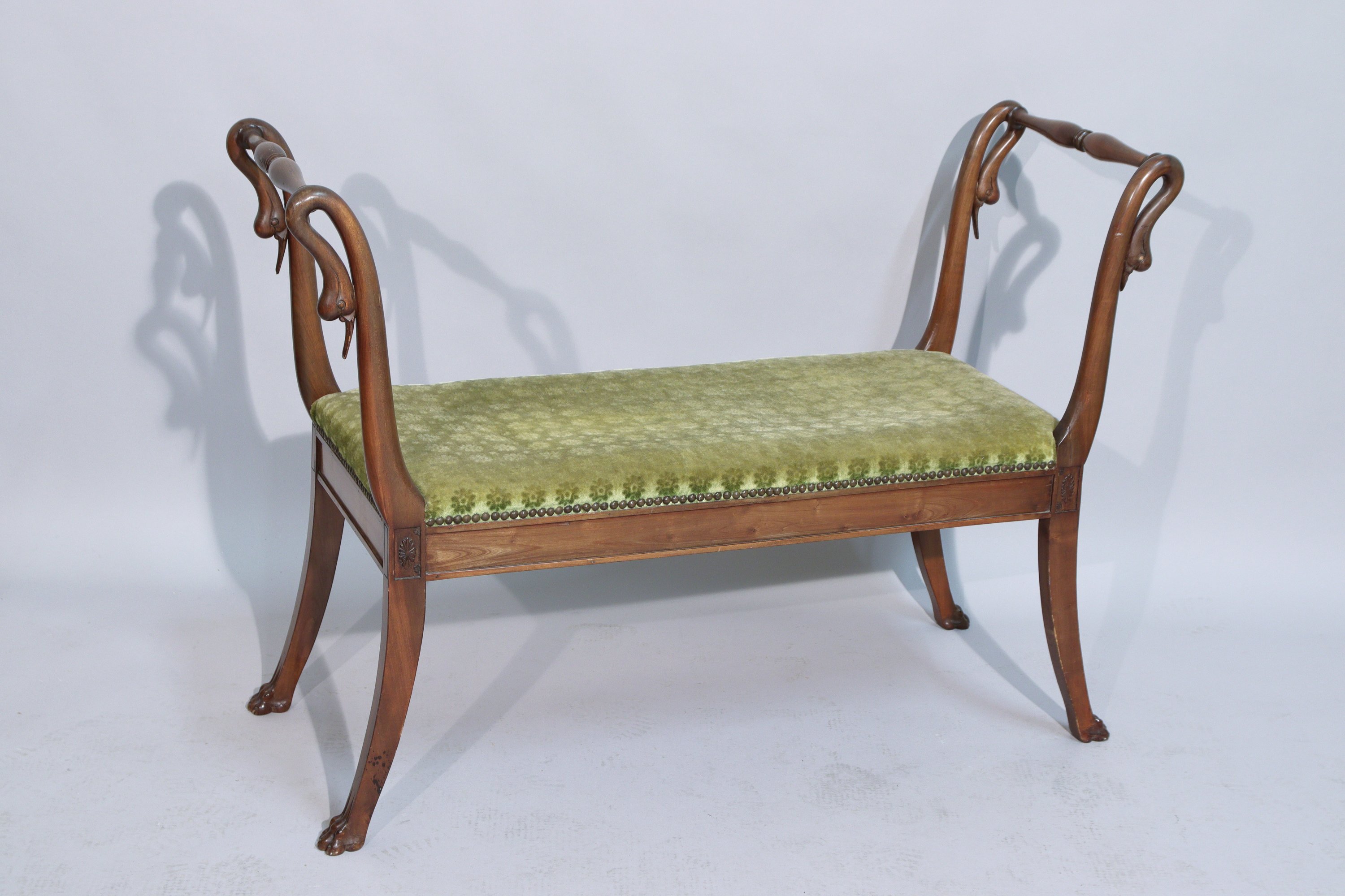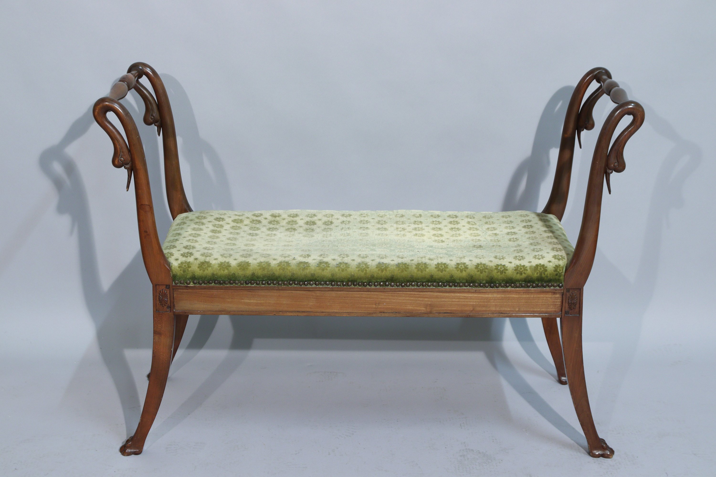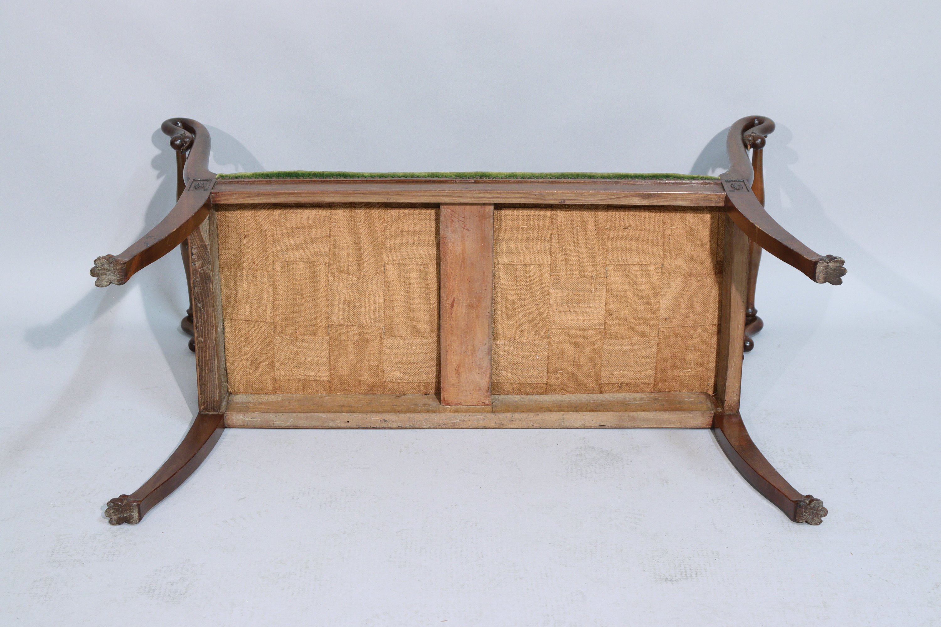 en acajou et placage d'acajou, les accotoirs tournés supportés par des cols de cygne. Quatre pieds en sabre de section carrée terminés par des pattes de lion.