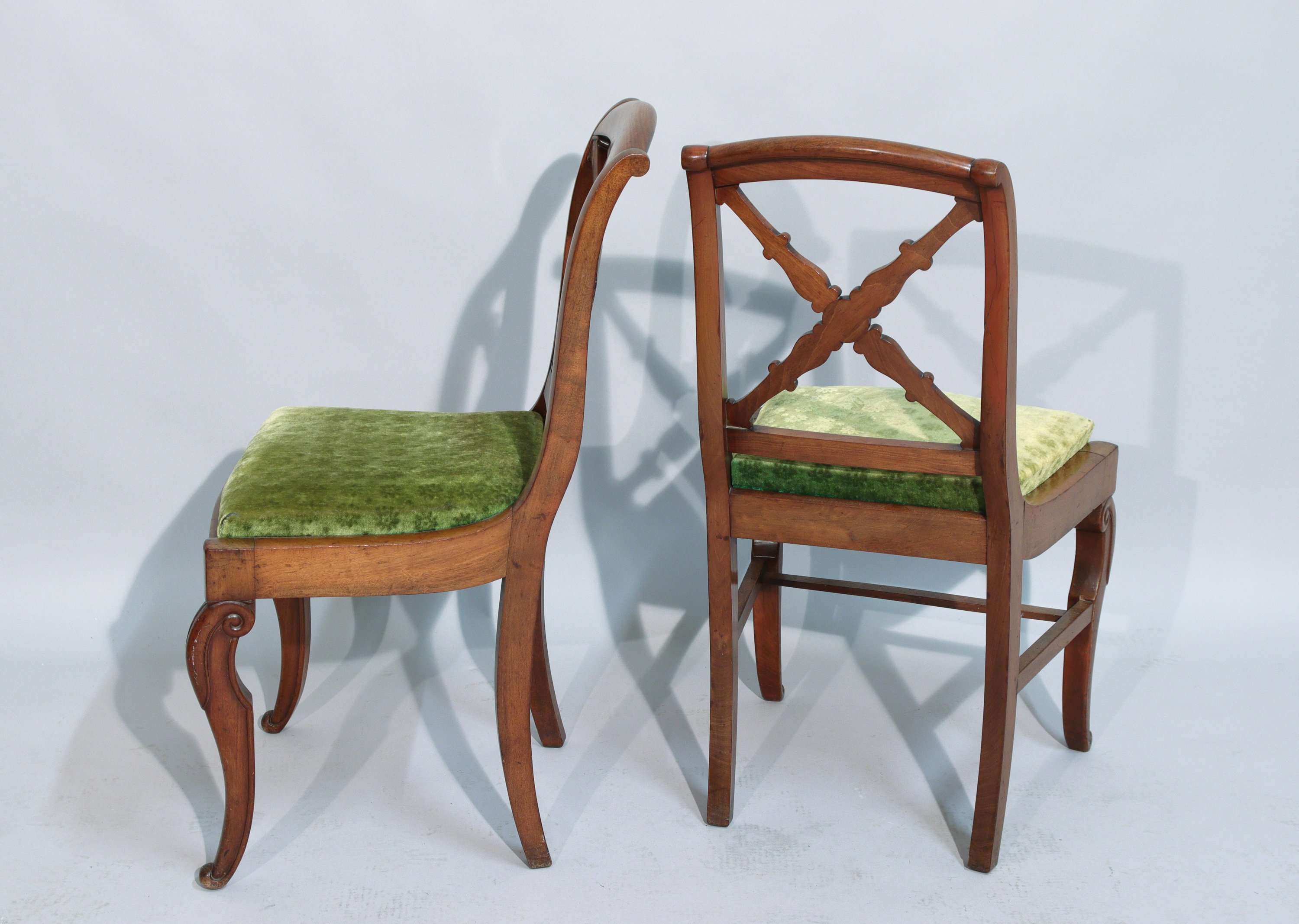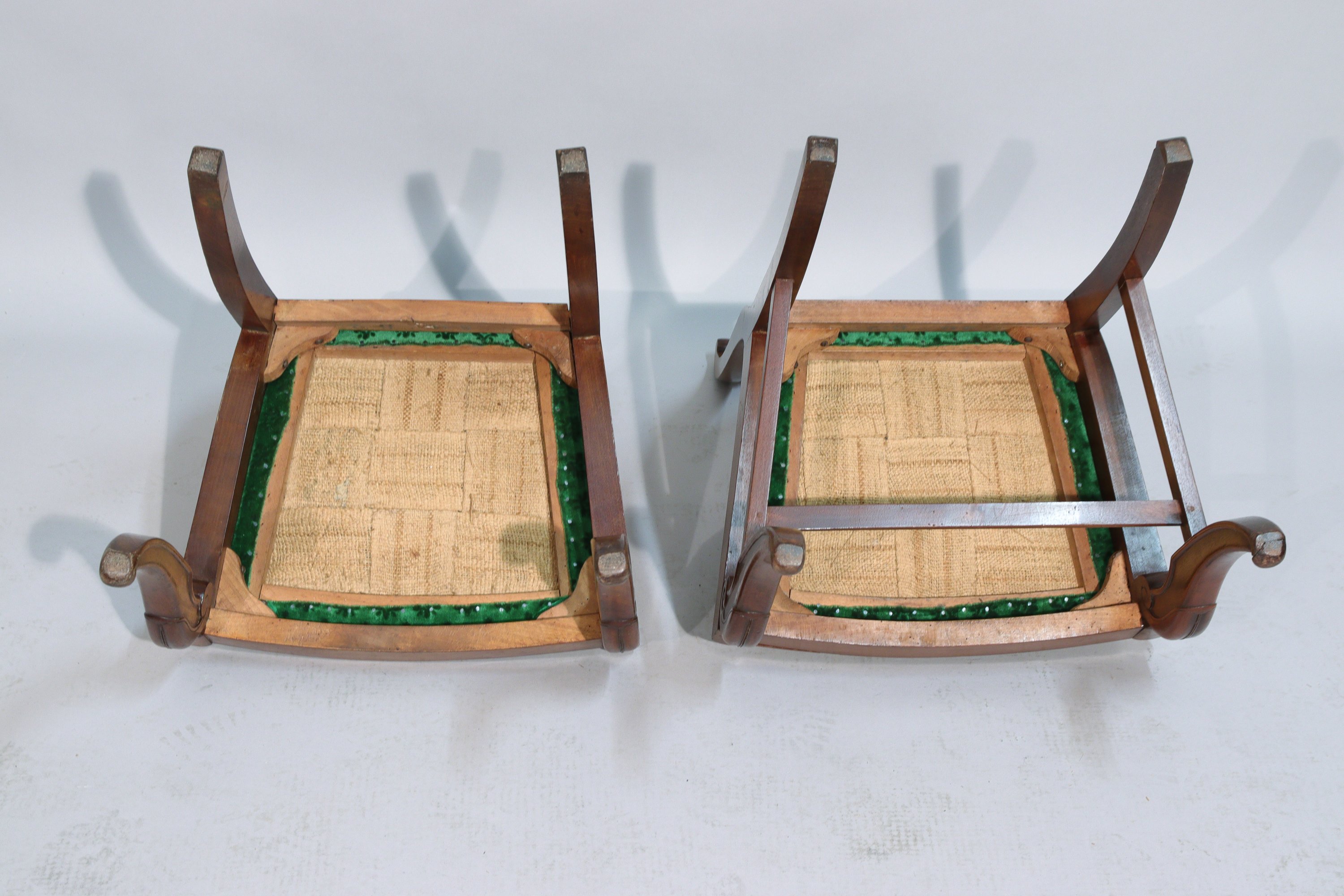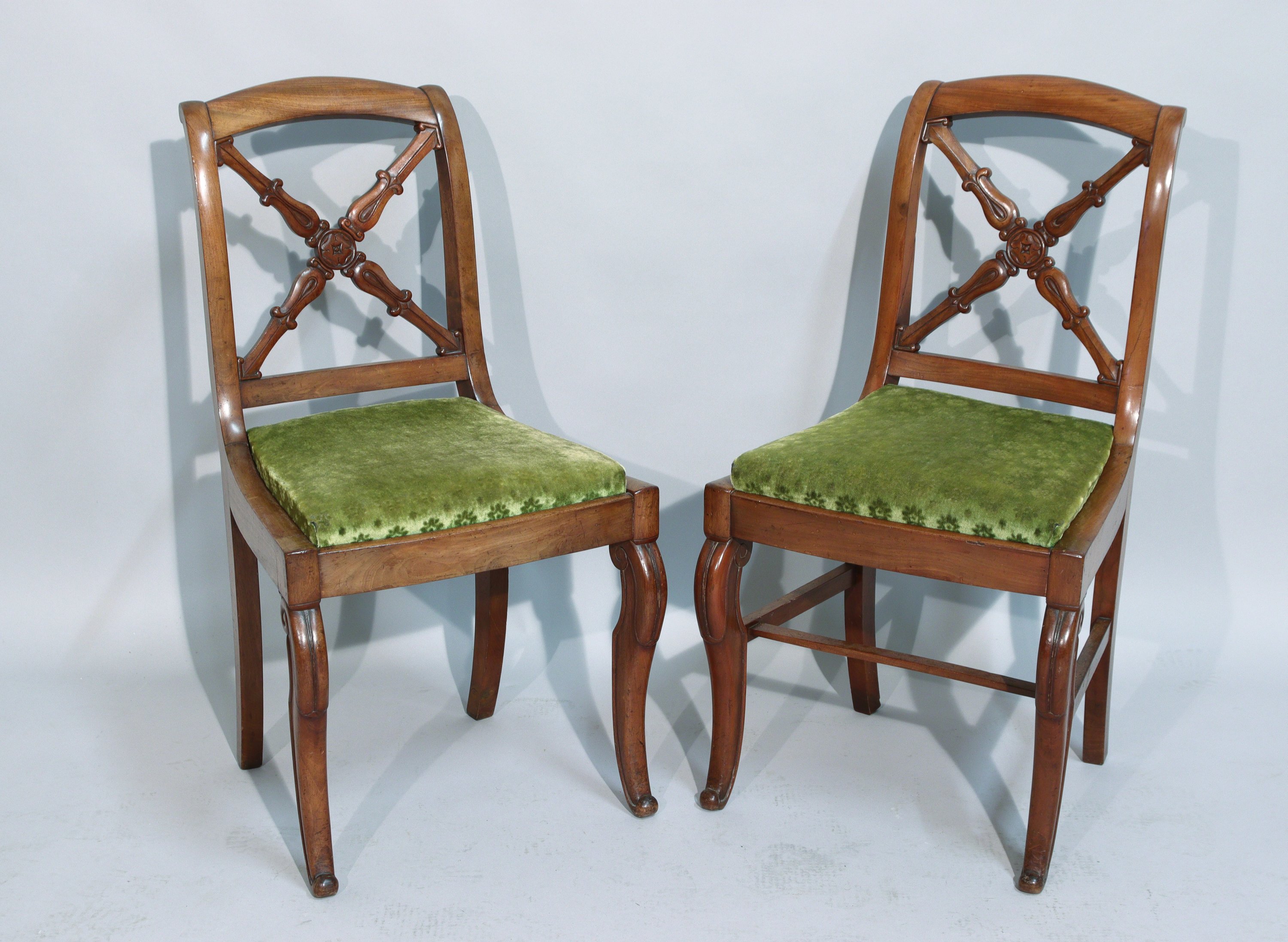 - Paire de chaises en acajou et placage mouluré et sculpté. Le dossier, légèrement renversé, est ajouré et les croisillons formant un X se rejoignent au centre par un médaillon décoré dune fleur. Les pieds arrière en sabre, les antérieurs en jarret, rehaussés dun motif de volute, se terminant en légère courbure. Époque Restauration. Lassise est recouverte dun velours vert deux tons au motif floral. Haut. 82,5 Larg. 46 Prof. 43 cm (usure dusage, légers éclats).