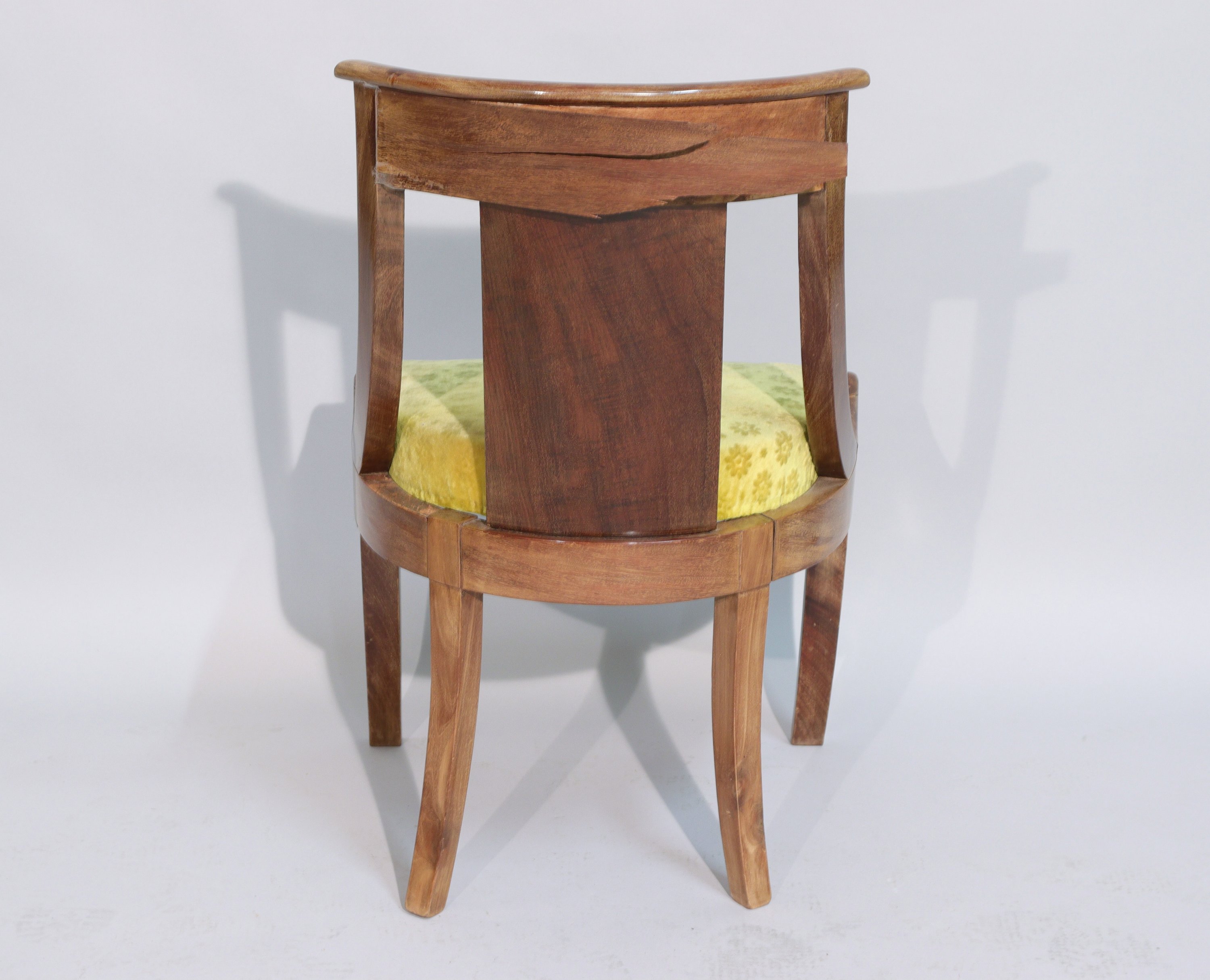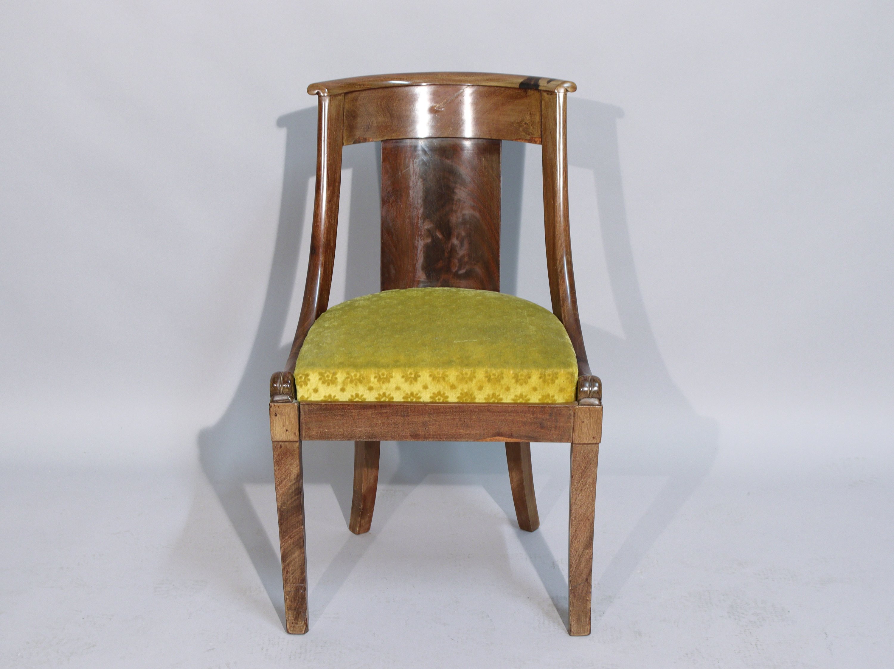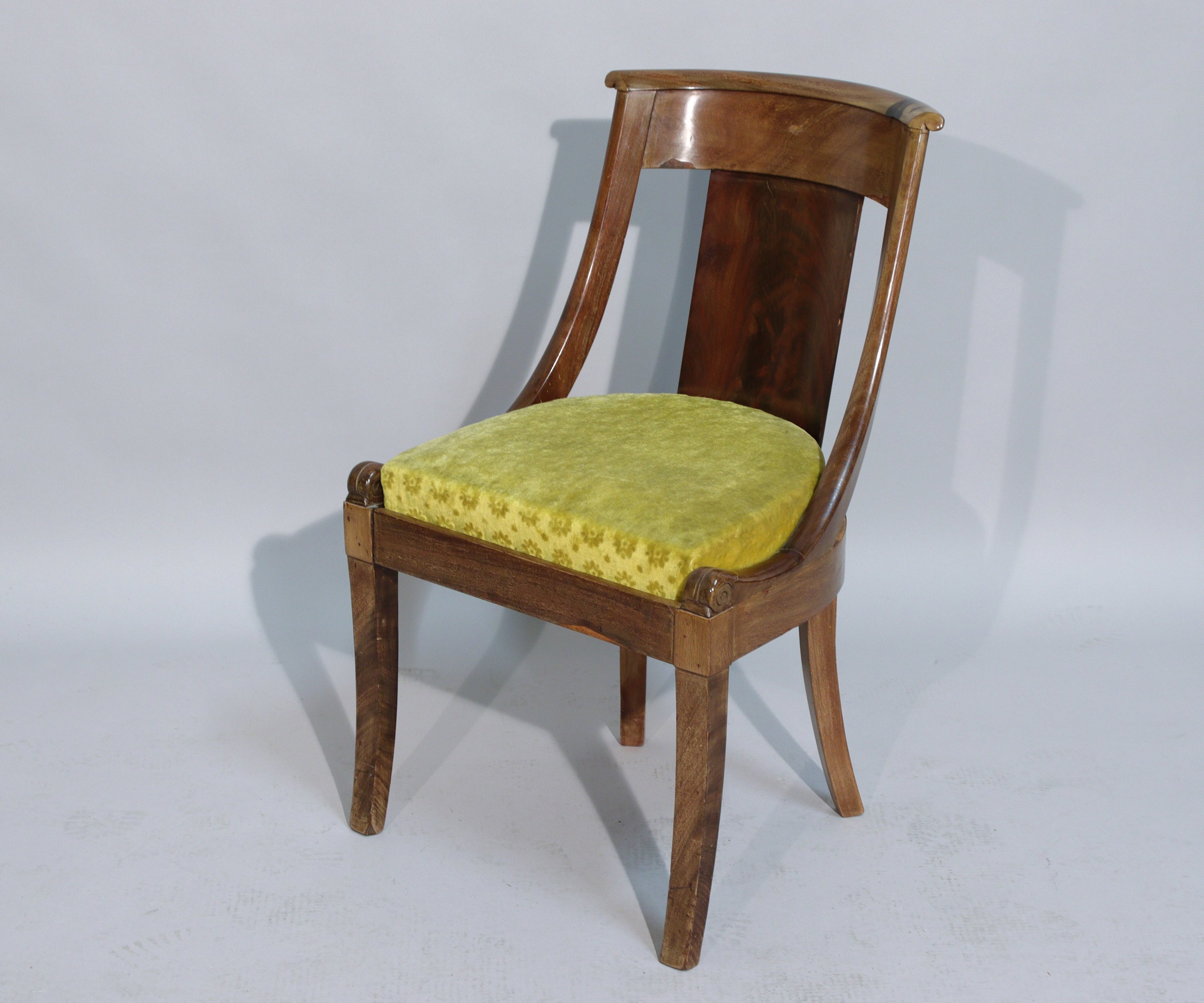 - Petite chaise gondole en bois et placage dacajou. Quatre pieds en sabre de section carrée. Travail de style Empire, XIXe siècle. Haut. 77,5 Larg. 49 Prof. 43,5 cm (nombreux manques et décollements sur le placage, usures).