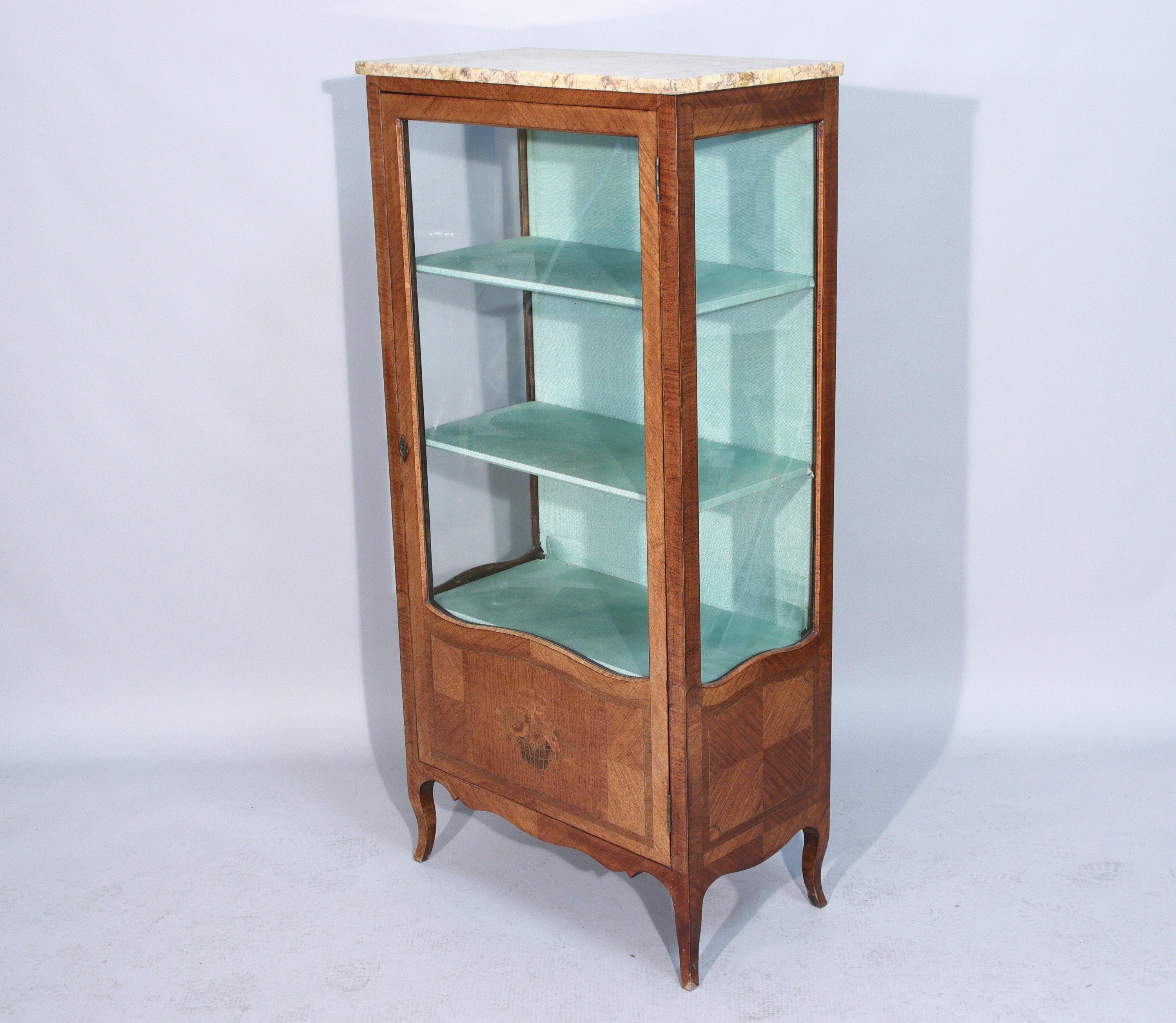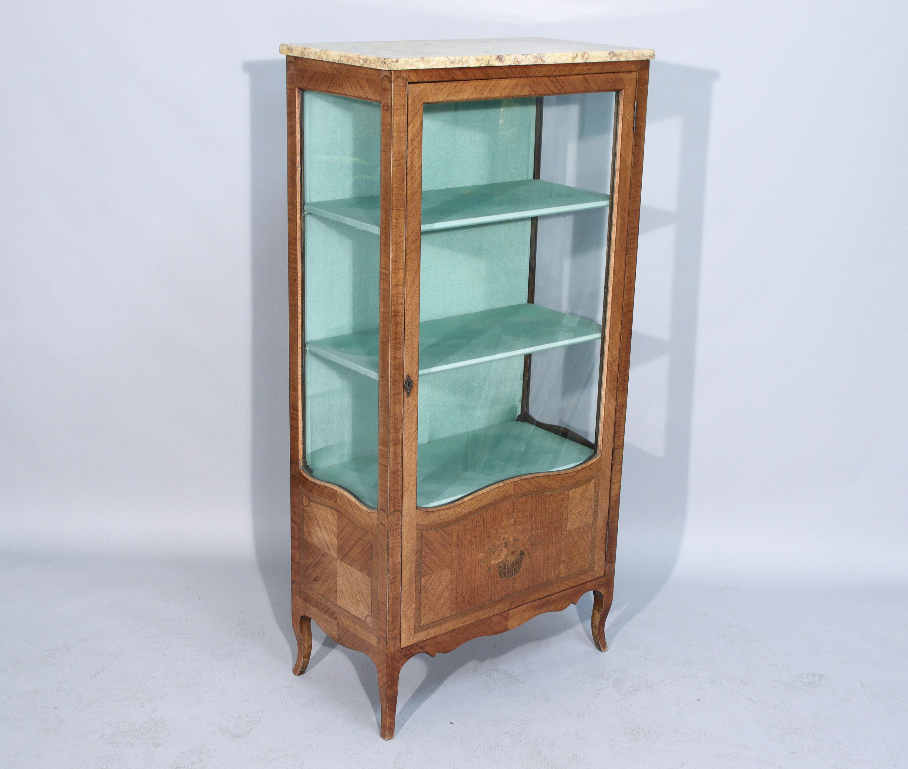 en placage de bois de rose rehaussé de filets de bois exotique. Elle ouvre en façade par une porte vitrée décorée d'une panière fleurie révélant à l'intérieur trois niveaux détagères recouvertes, ainsi que le fond du meuble, dun tissu bleu turquoise. La ceinture chantournée, les pieds cambrés. Dessus de marbre brèche.