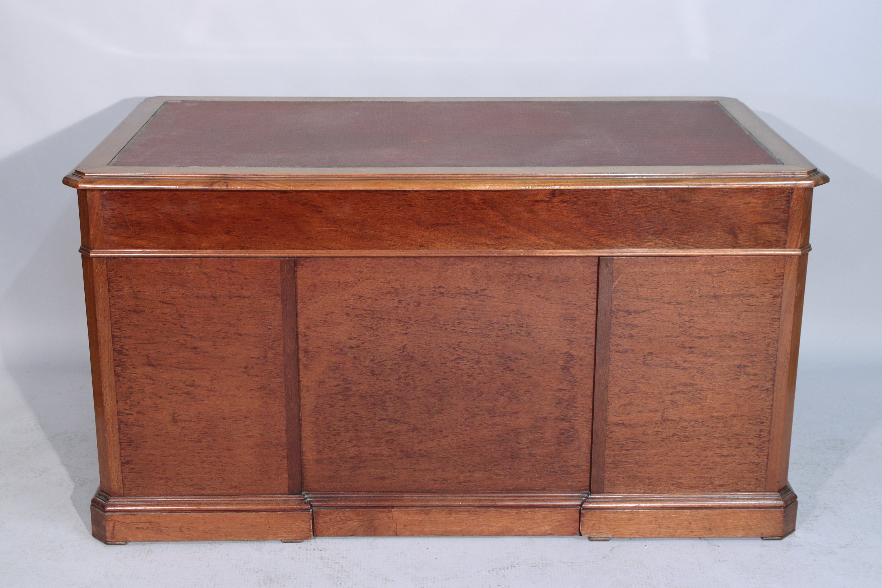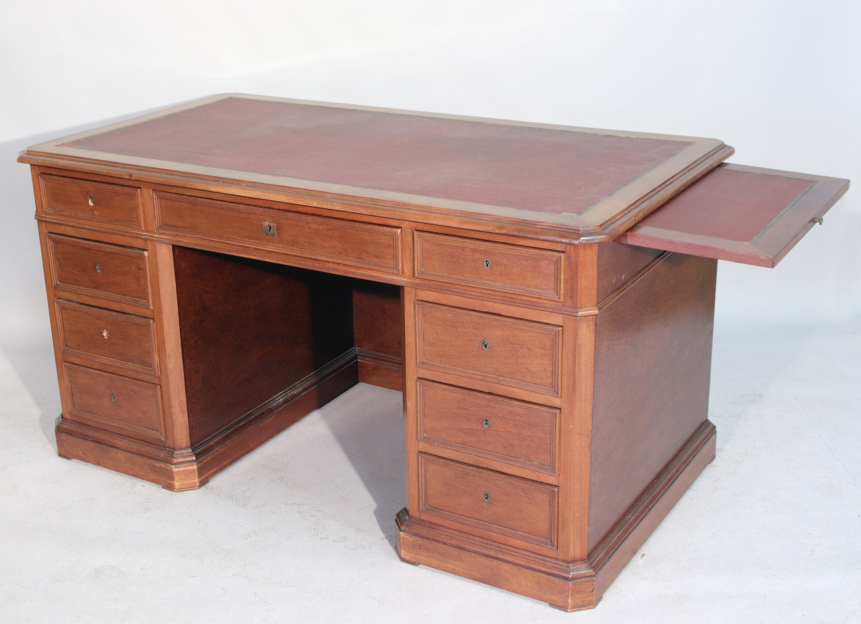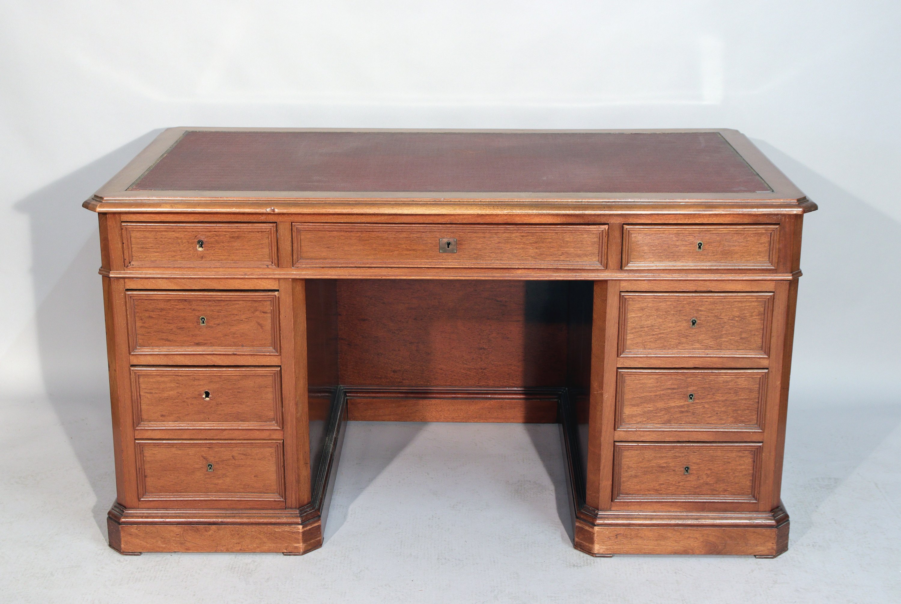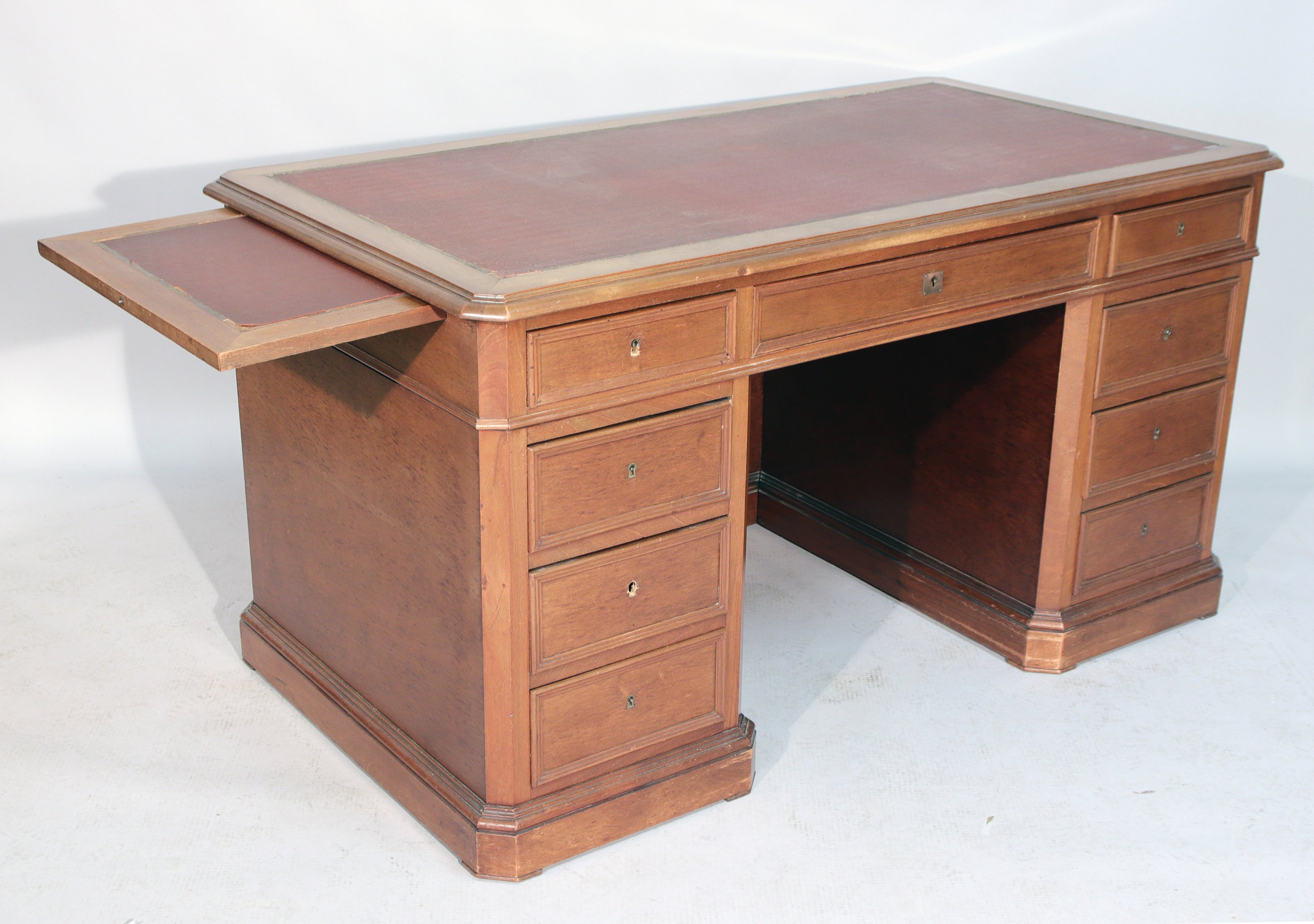 en bois naturel mouluré ouvrant sur une face par un tiroir central entouré de caissons composés chacun de quatre tiroirs. Deux tablettes latérales escamotables garnies de cuir bordeaux. Les côtés à pans. L'ensemble repose sur une plinthe.