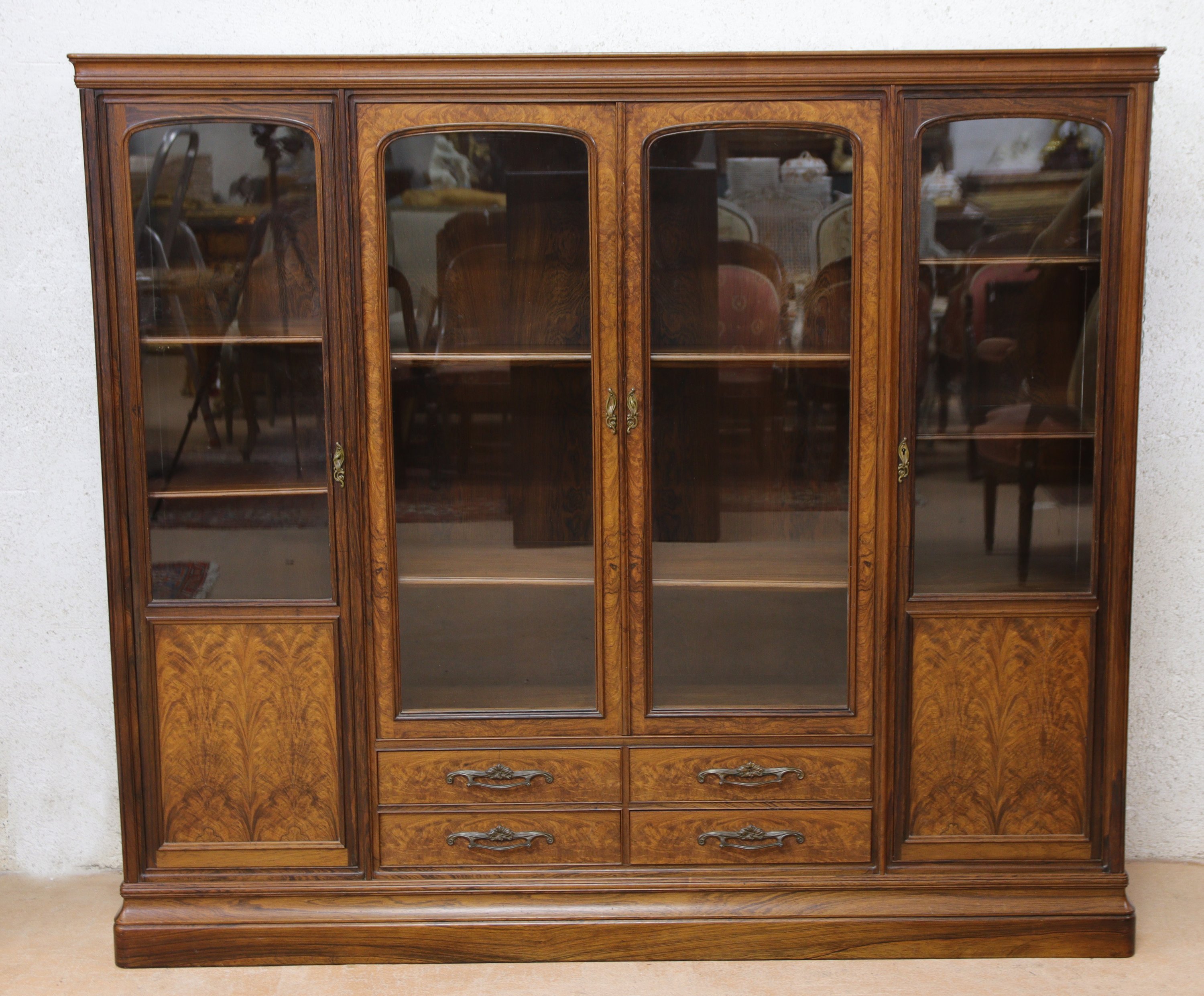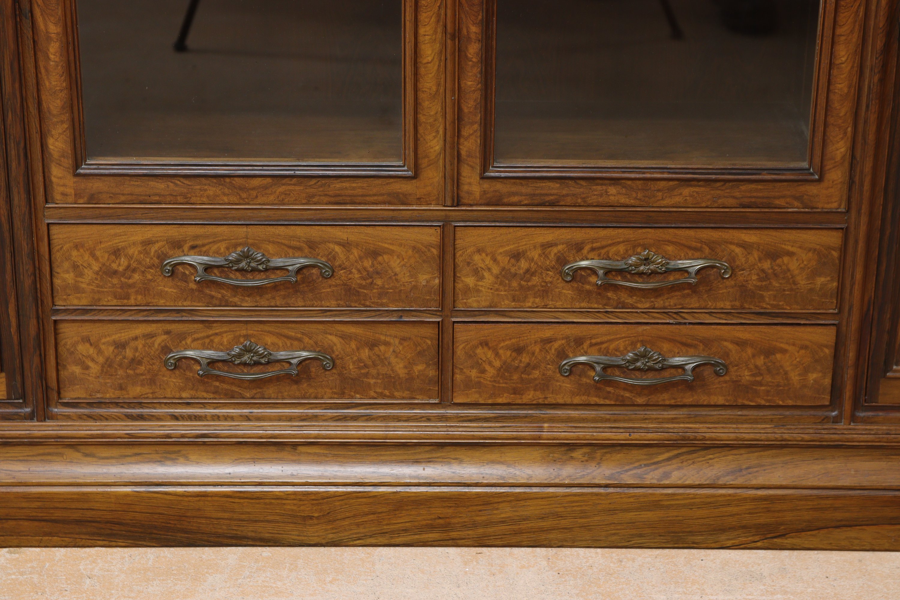 en palissandre et placage de palissandre, et loupe ouvrant par deux vantaux vitrés surmontant, en partie centrale, quatre tiroirs entourés sur les côtés de deux portes vitrées dévoilant plusieurs niveaux détagères. Délicates entrées de serrure et poignées de tiroirs aux motifs végétaux stylisés.