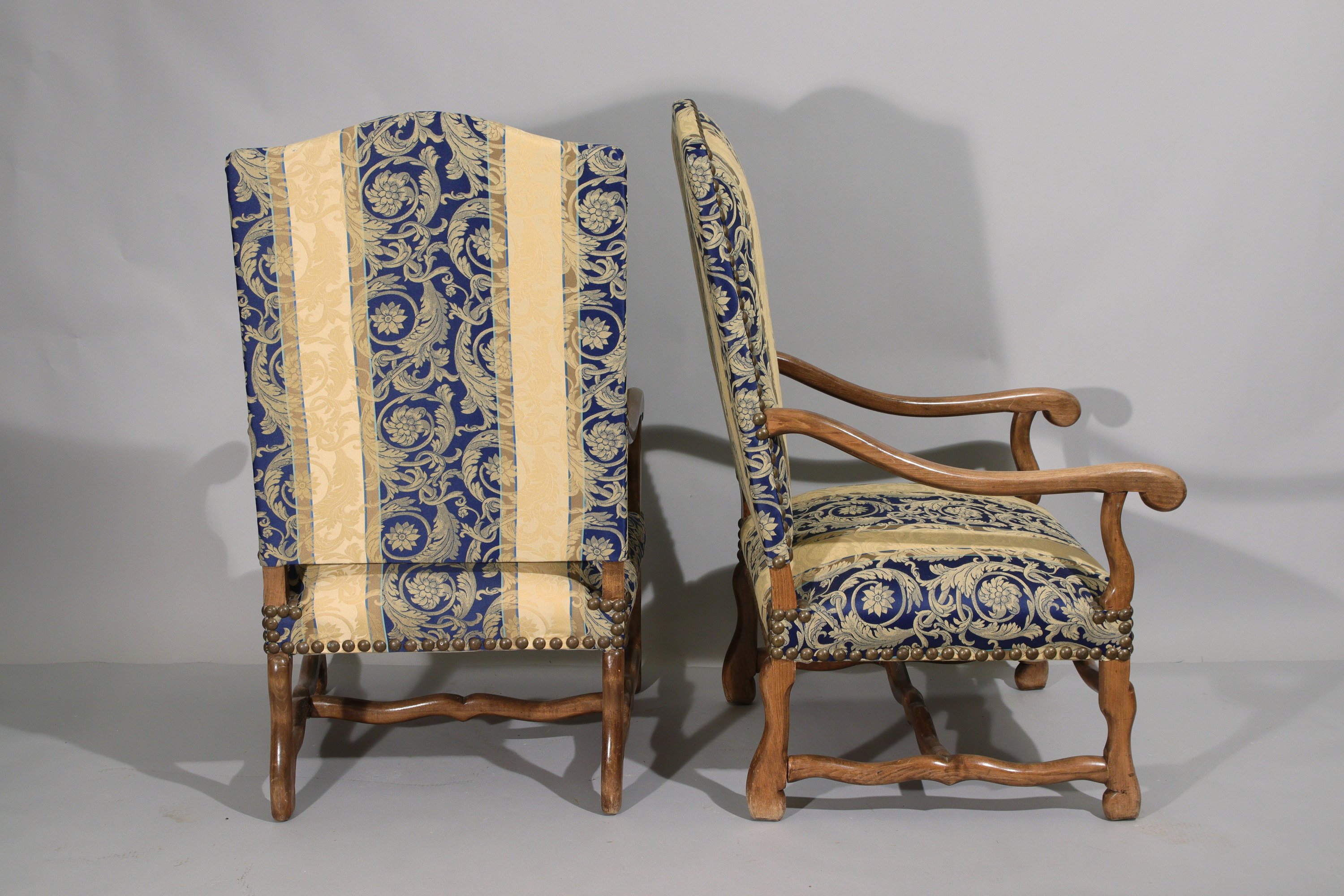 en noyer à haut dossier légèrement incliné. Les accotoirs mouvementés, piétement en os de mouton réuni par une entretoise en H.