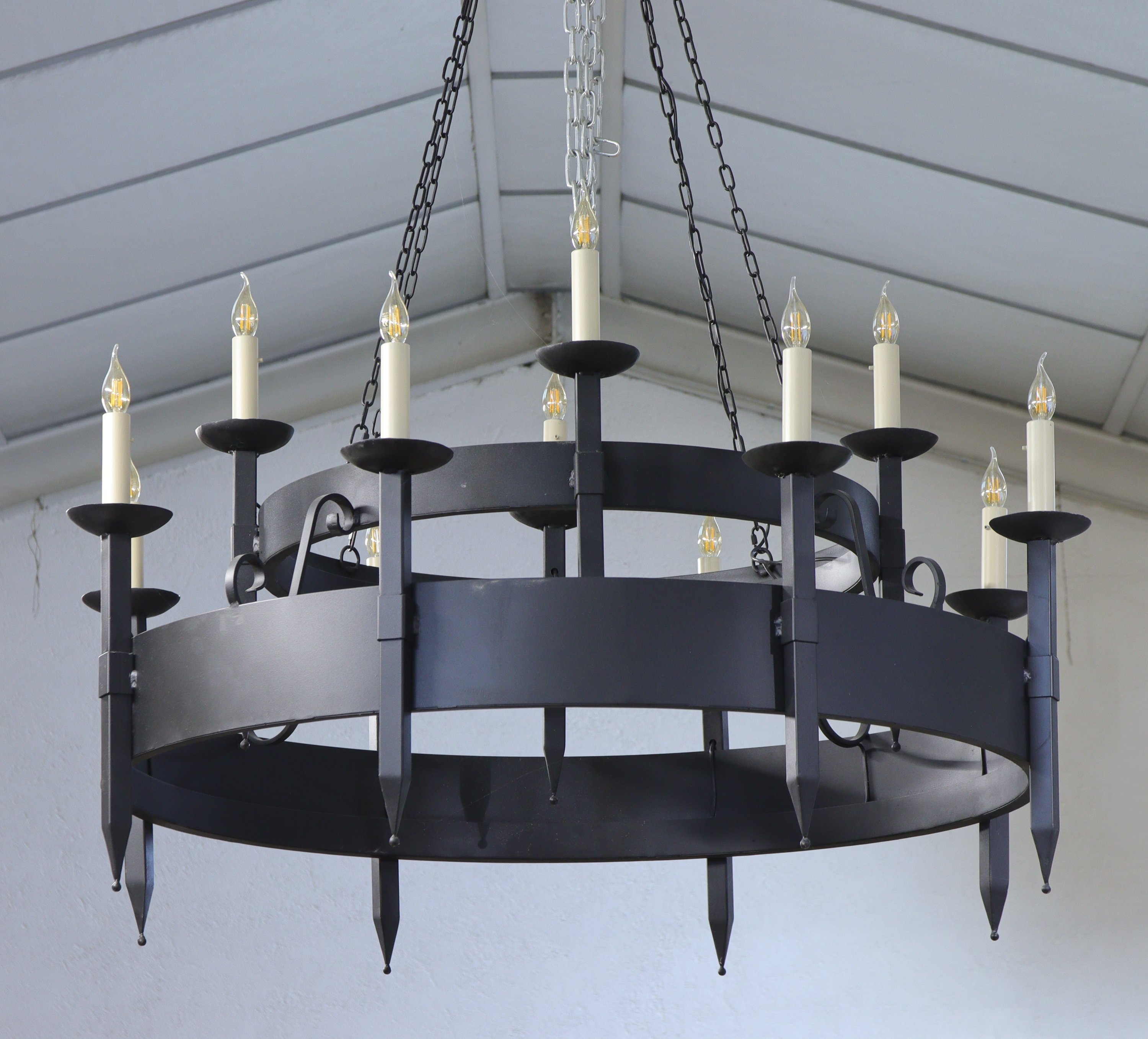 en métal laqué noir à douze lumières sur deux registres réunis par des entrelacs. Les lumières présentées sur des torches.
