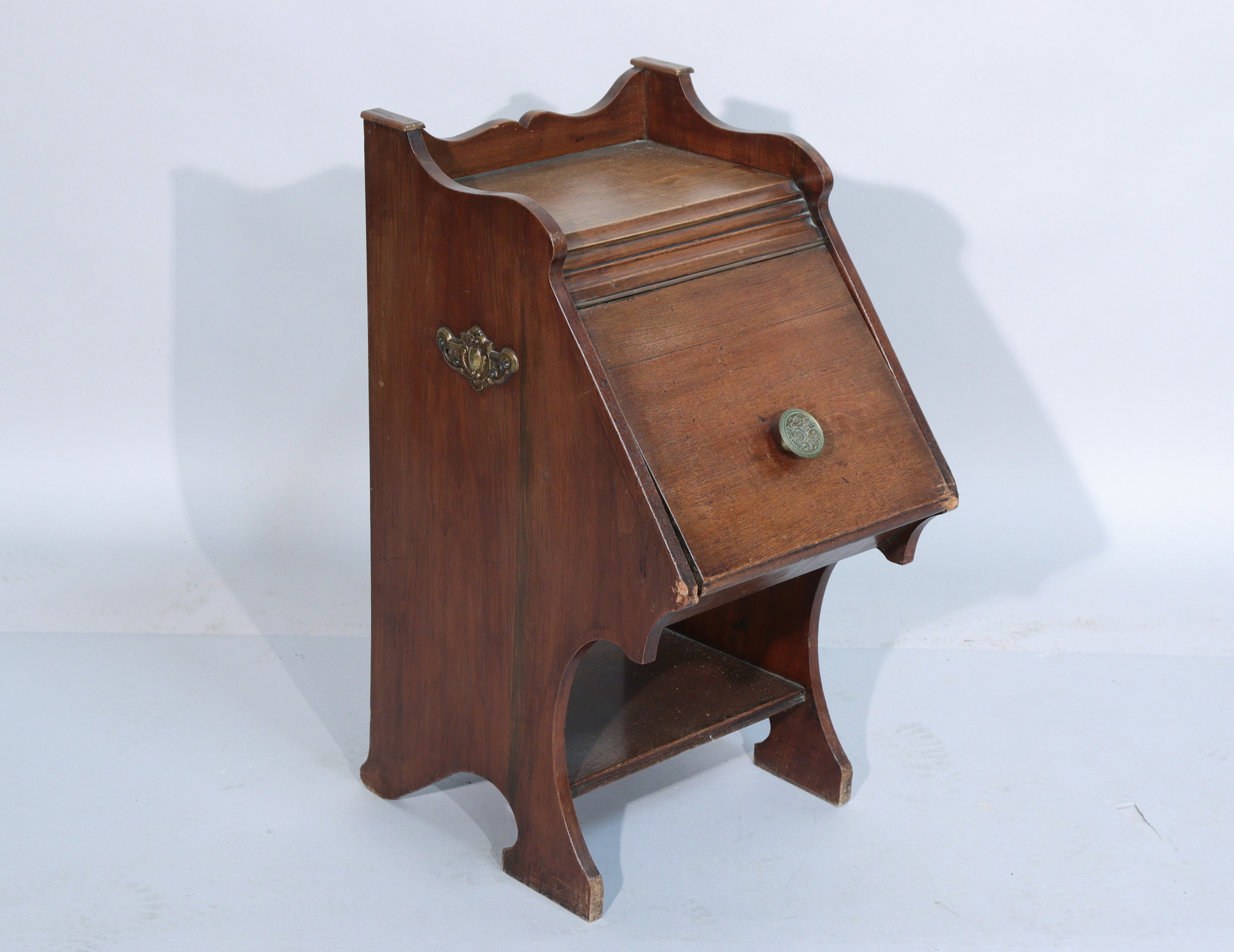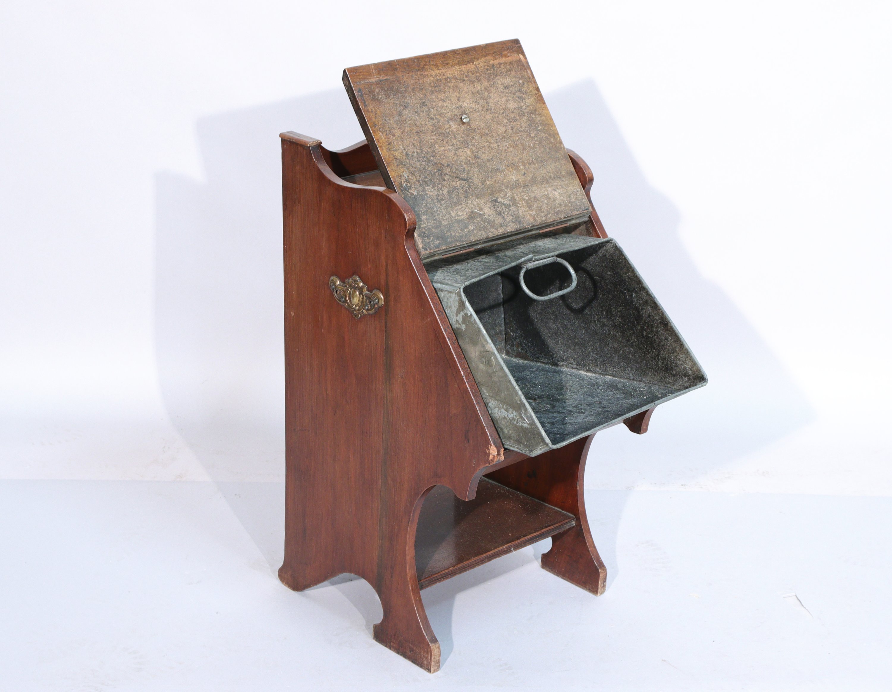 en noyer, ouvrant par une porte sur un compartiment à charbon en zinc. Les pieds réunis par une tablette. Poignées et bouton d'ouverture de la porte en laiton.