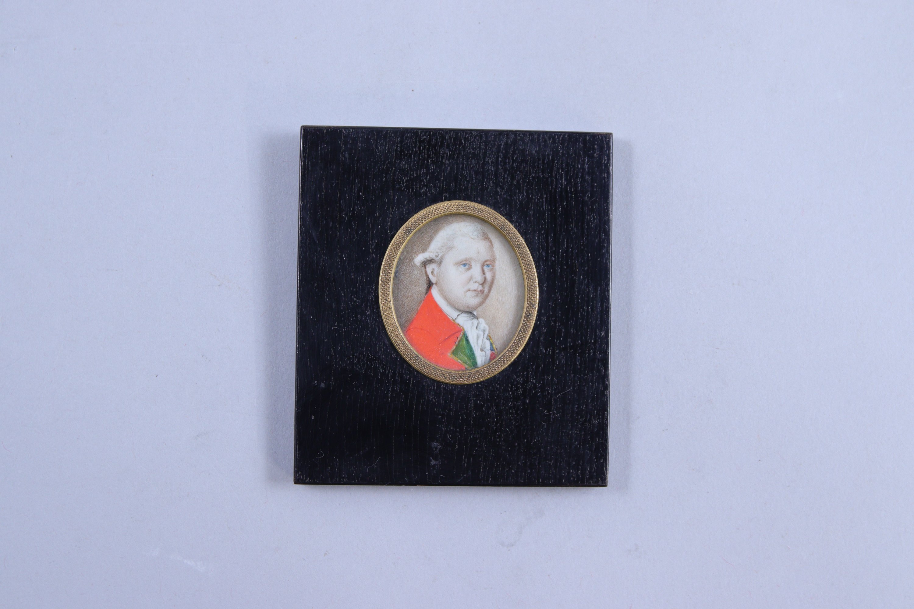 Joint : École française de la fin du XVIIIe-début du XIXe siècles. Portrait d'homme à la veste rouge. Miniature. Haut. 3,8, Larg. 3,3 cm. Dans un cadre en bois noirci (Haut. 8 Larg. 7 cm.)