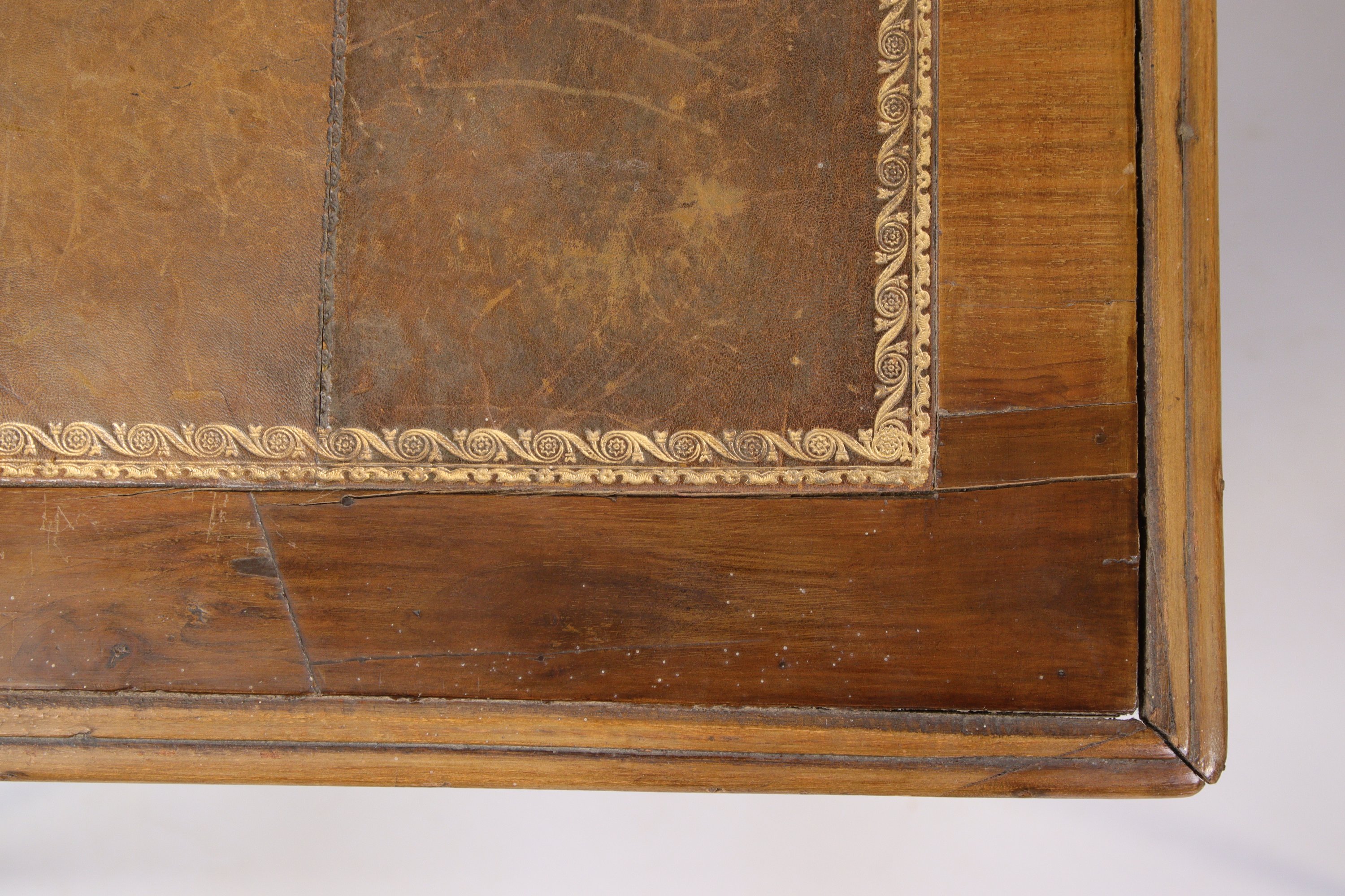 en bois fruitier ouvrant en ceinture par un tiroir central entouré de quatre tiroirs en caisson sur deux rangs. Il repose sur quatre pieds gaines. Le plateau est foncé d'un maroquin décoré aux petits fers. Petite ornementation en laiton comme sabots, entrées de serrure à décor de nuds et de rubans.