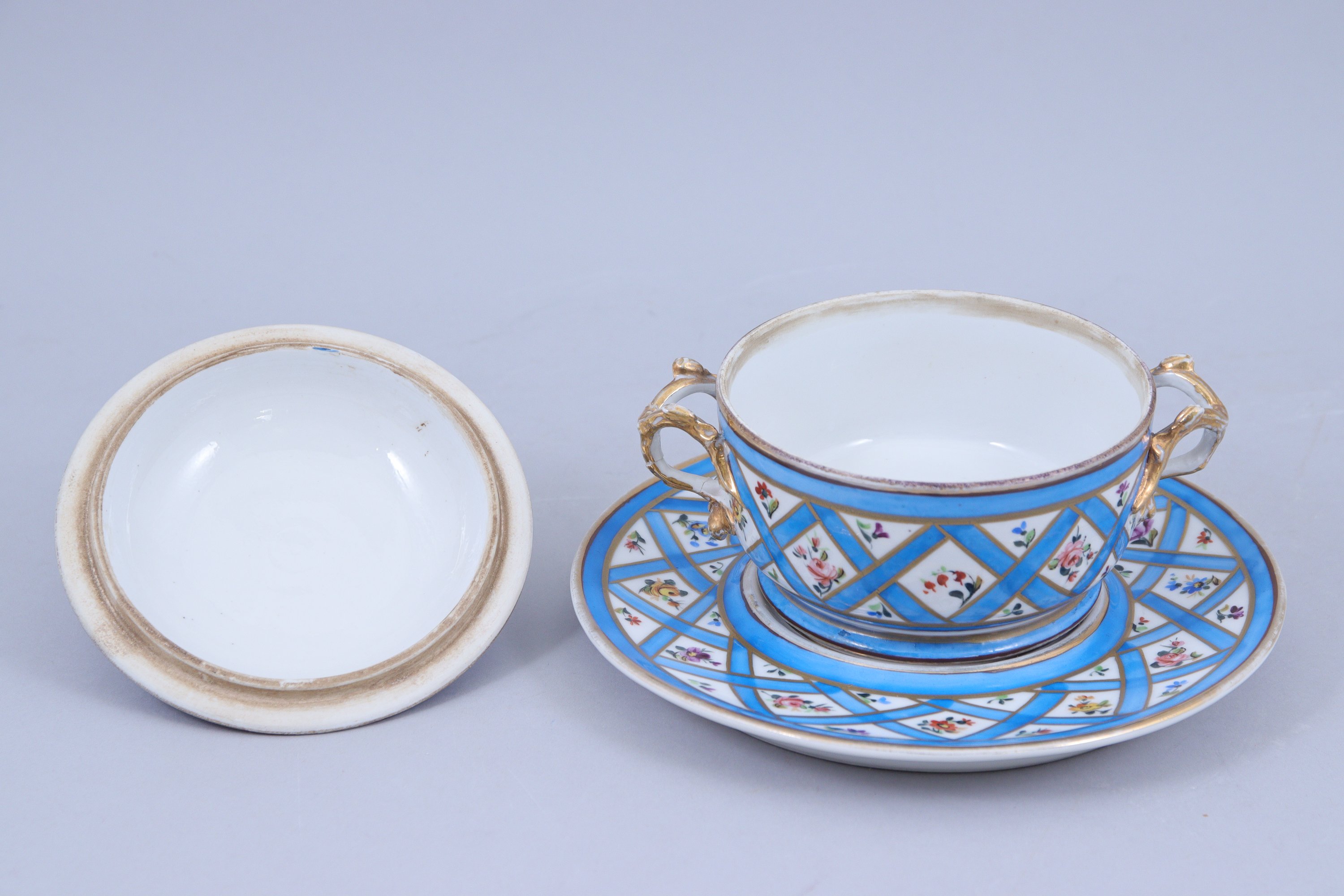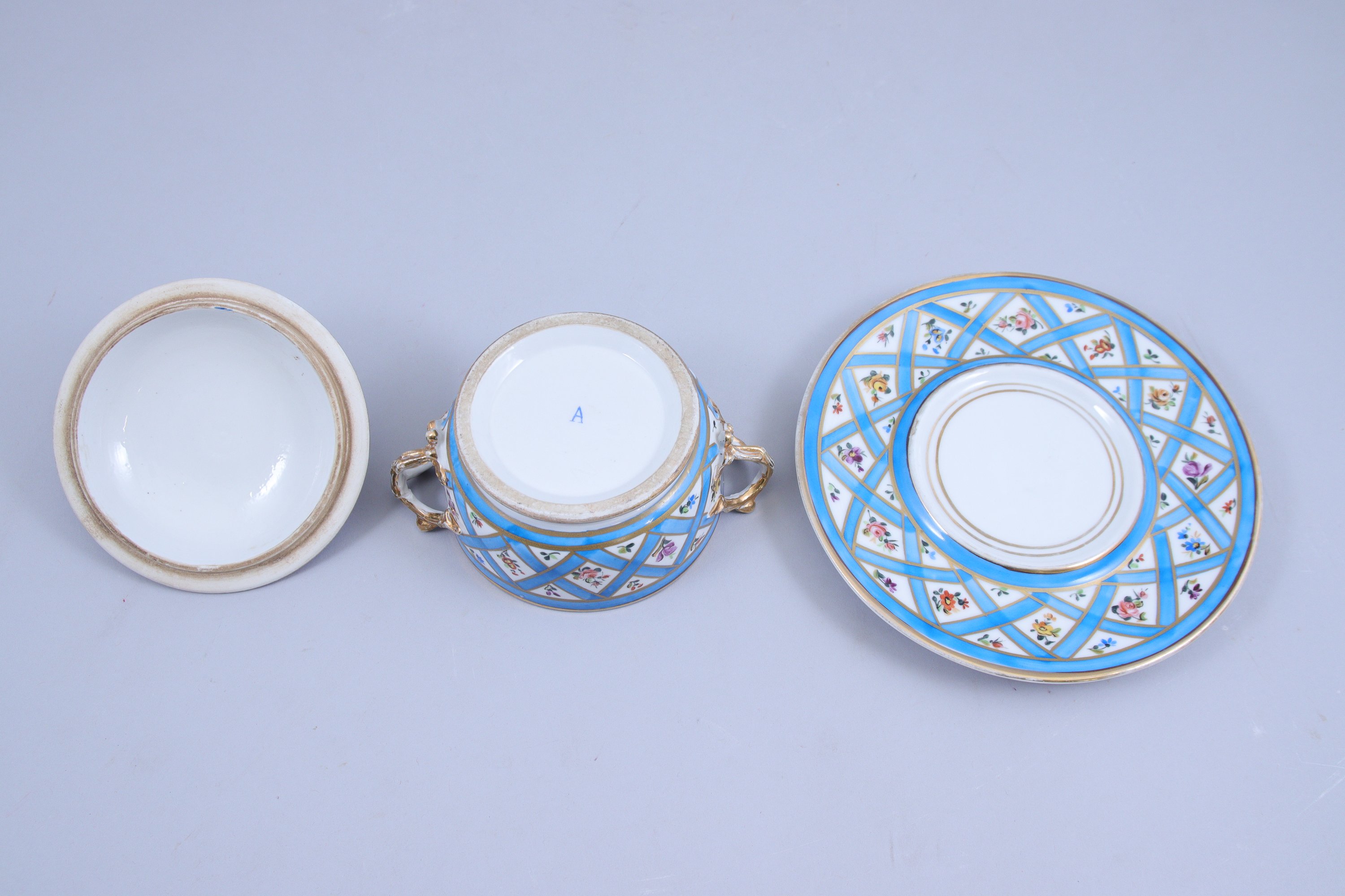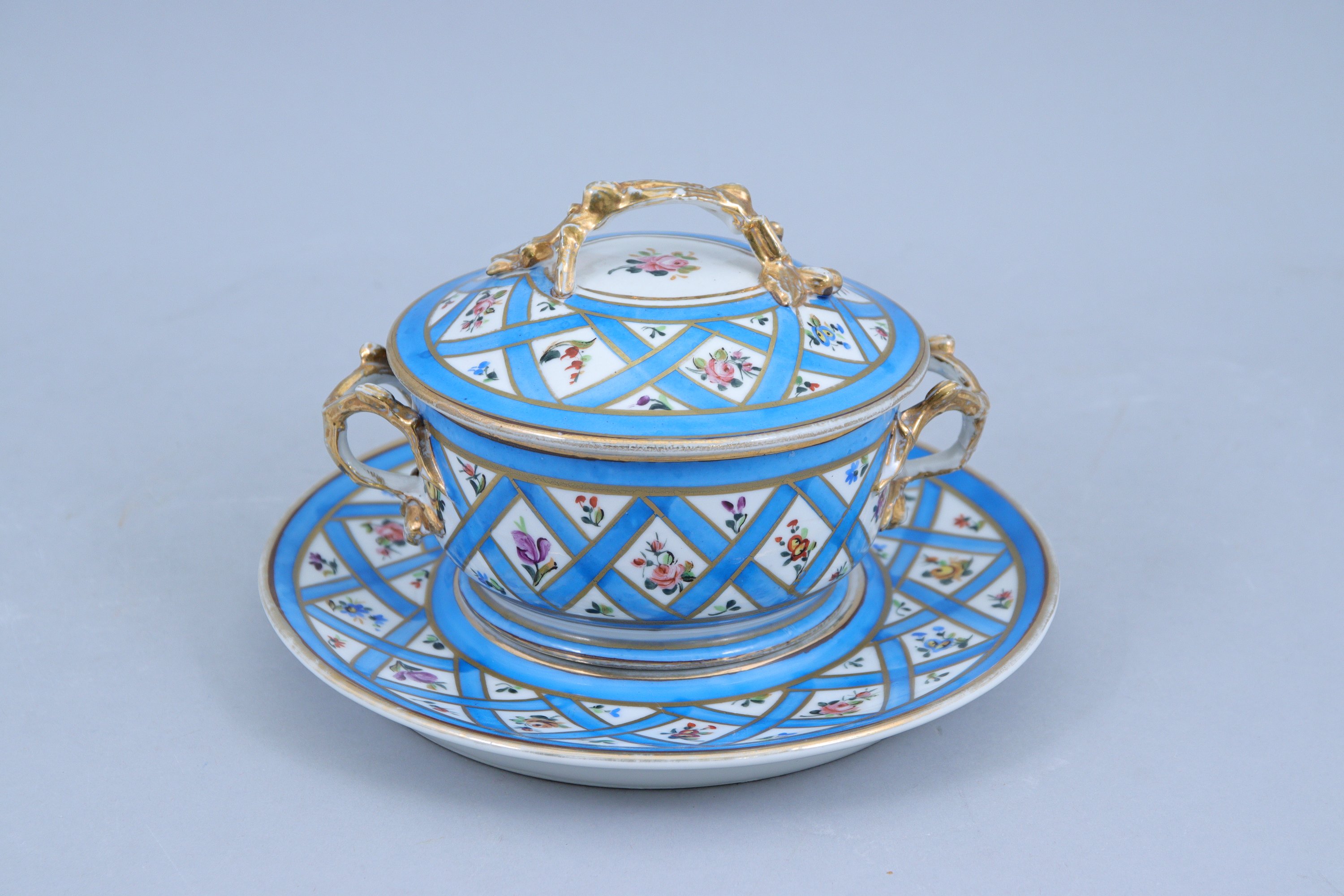 en porcelaine blanche décorée de fleurs polychromes variées et de croisillons bleu céleste aux liserés dor. Les anses du bouillon et du couvercle présentent des motifs végétaux dorés.