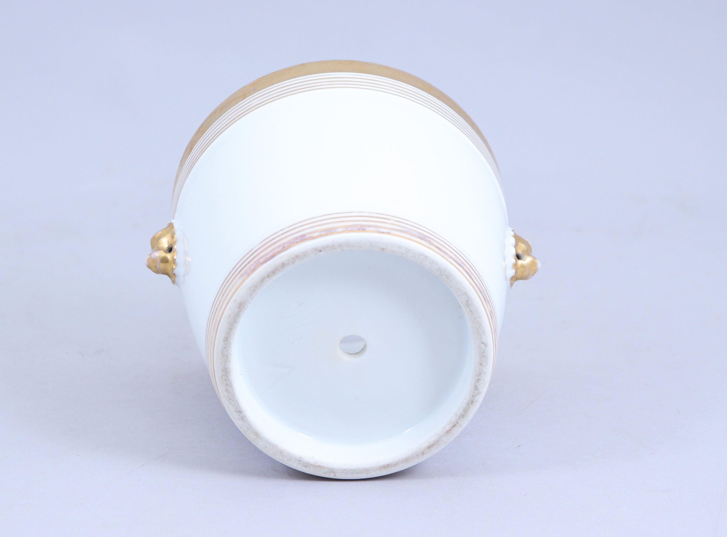 en porcelaine blanche rehaussée dor et décorée de deux têtes de lion dorées.