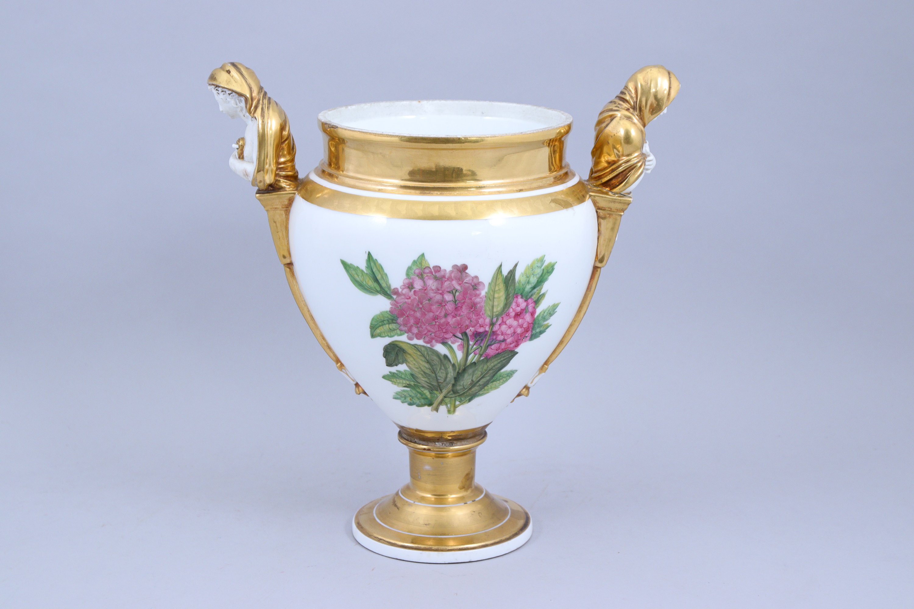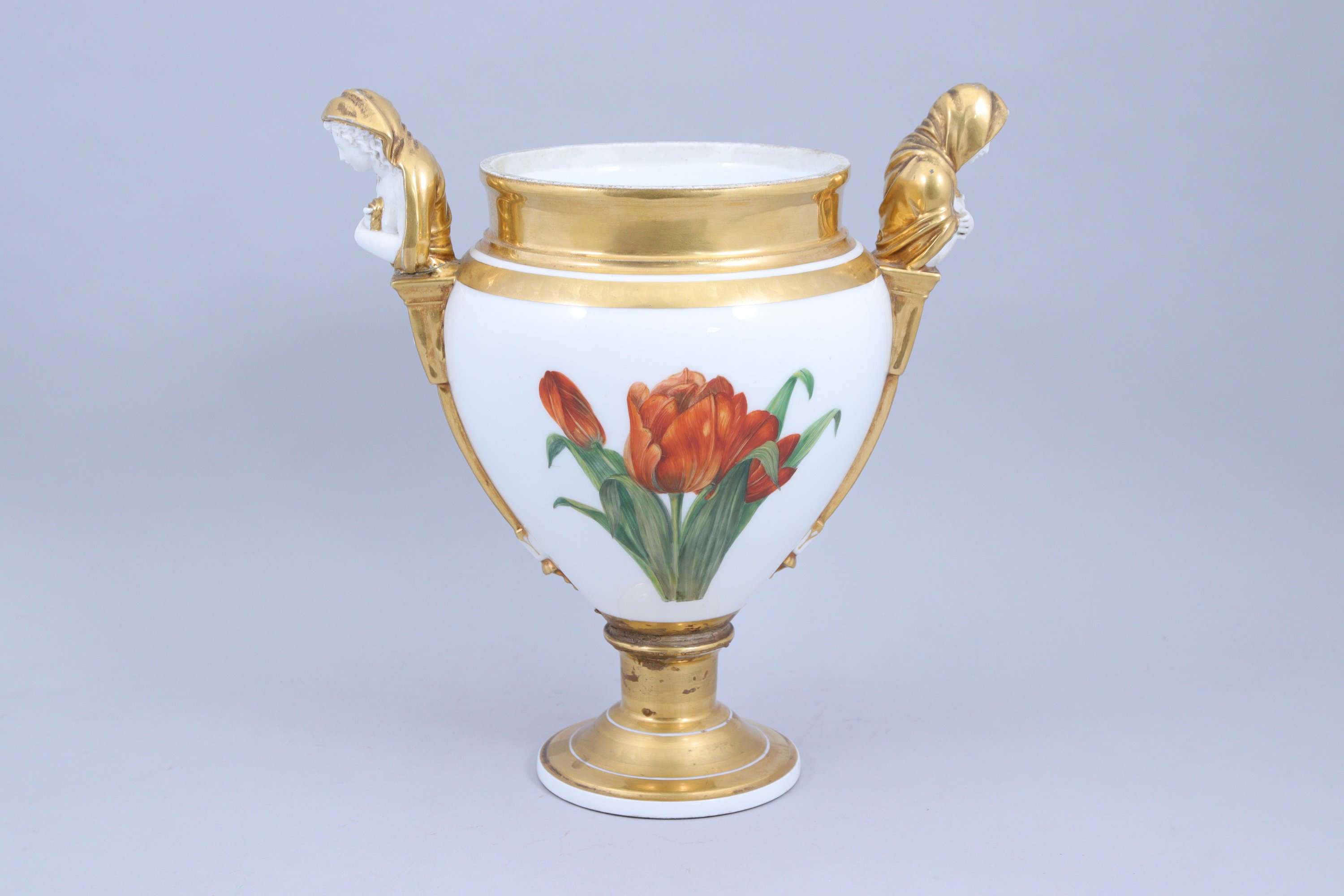 sur piédouche en forme de balustre, orné de tulipes et hortensias traités au naturel. Les anses reprennent le thème de la frileuse d'Houdon en biscuit et or.